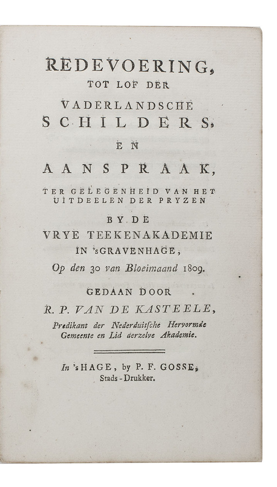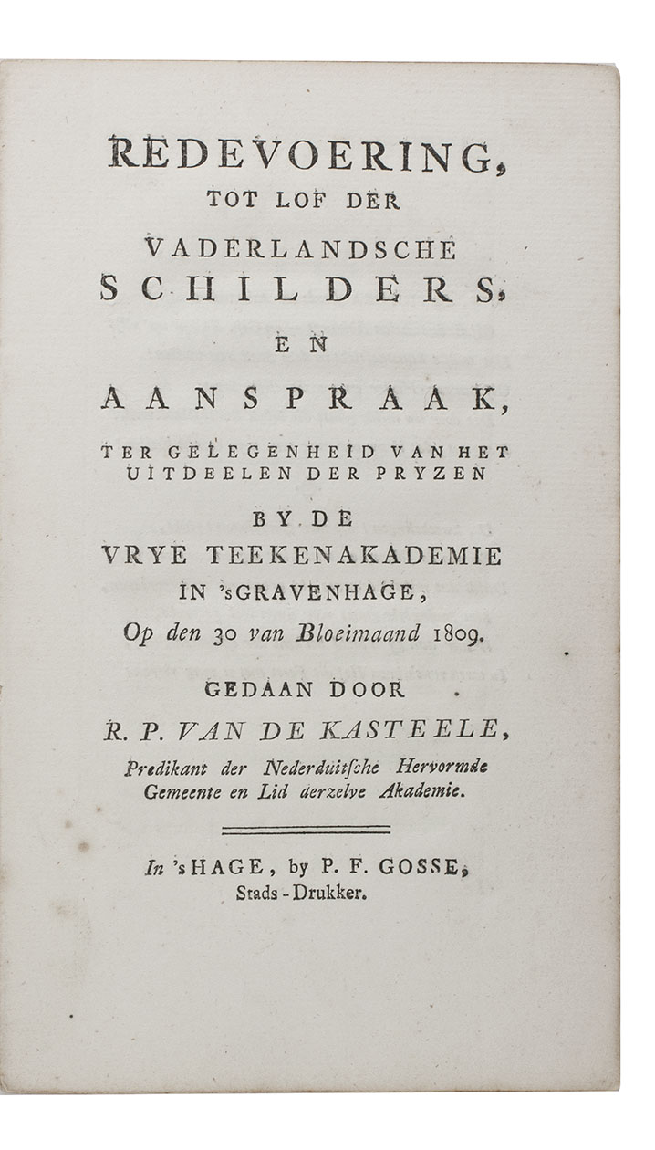 (2). KASTEELE, Reinier Pieter van de. Redevoering tot lof der vaderlandsche schilders en aanspraak.... 1809.