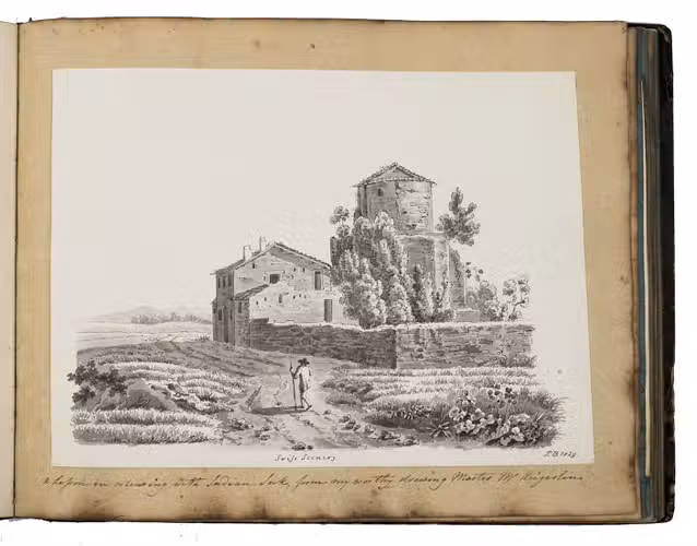 [Various places, ca. 1826-1830]. Oblong 4to. With 66 sketches in pen & ink and pencil, mostly signed by Blackwell, mounted and bound in, with manuscript captions. There is also 1 print (ca. 1795/1800?) drawn by Singey Bey and engraved by Thomas Medland. Half black morocco, black decorated paper sides, gold-tooled ornaments on spine. [70] gray, white and blue album ll., containing 67 sketches and their accompanying manuscript captions and descriptions.