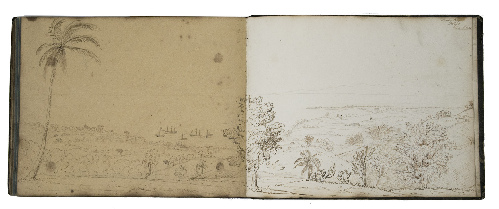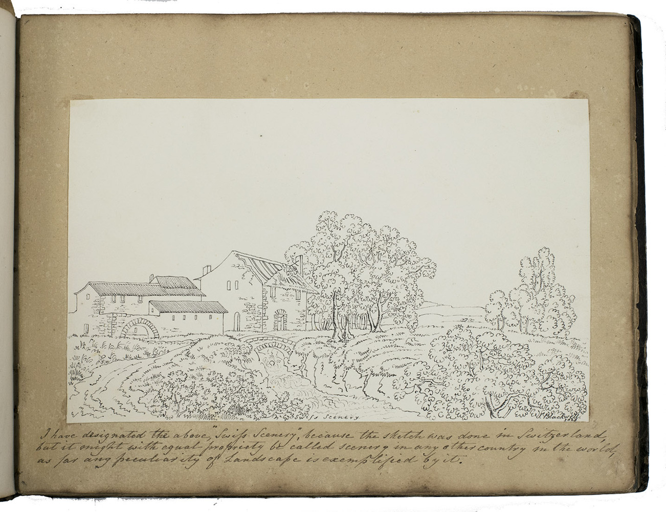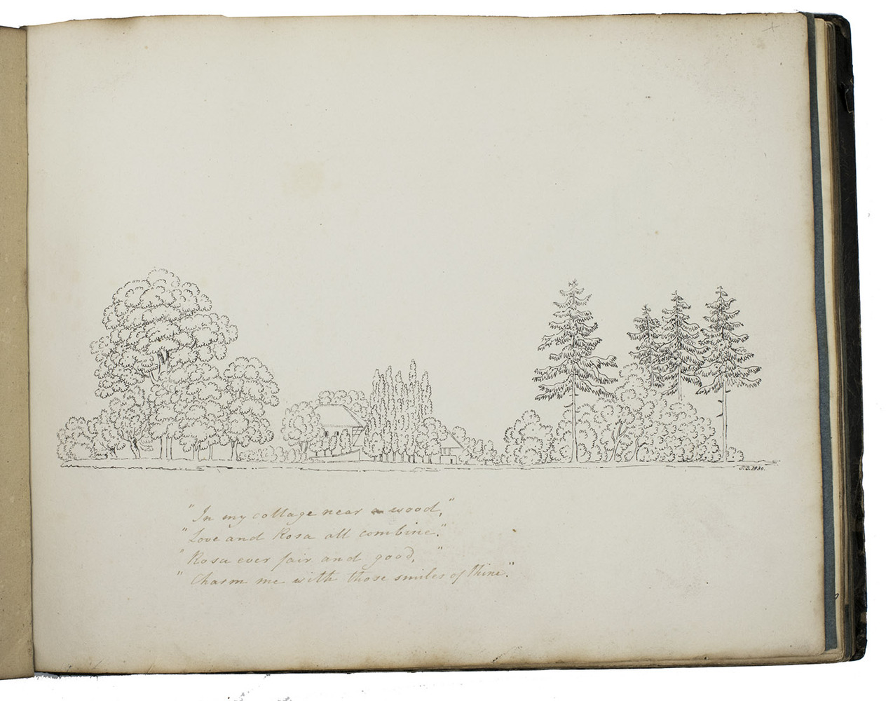 [Various places, ca. 1826-1830]. Oblong 4to. With 66 sketches in pen & ink and pencil, mostly signed by Blackwell, mounted and bound in, with manuscript captions. There is also 1 print (ca. 1795/1800?) drawn by Singey Bey and engraved by Thomas Medland. Half black morocco, black decorated paper sides, gold-tooled ornaments on spine. [70] gray, white and blue album ll., containing 67 sketches and their accompanying manuscript captions and descriptions.