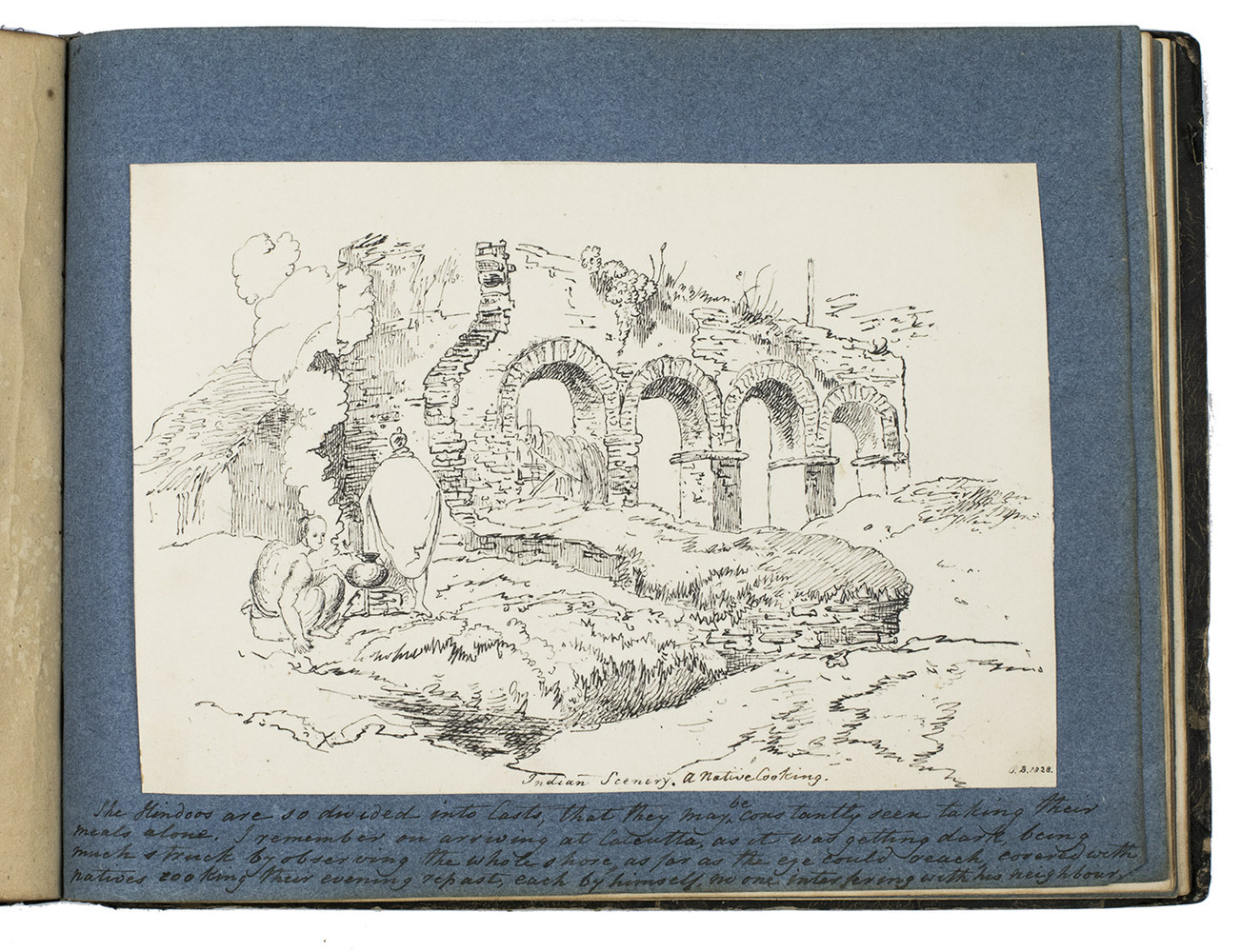 Sketchbook by the English lieutenant Thomas Eden Blackwell (1803?-1845), showing views of India, Burma and Switzerland, made in the years 1826-1830, when India, which is the subject of about 30 of the sketches, and parts of Burma (nowadays Myanmar) were British colonies. The sketches, most signed and dated by Blackwell, are mounted on album leaves and accompanied by manuscript captions and descriptions, also by Blackwell and sometimes by a later hand. These descriptions explain the sketches in more detail. Some of these remarks are general or contain interesting facts, while others are very personal or describe an event that happened during Blackwells time as officer.