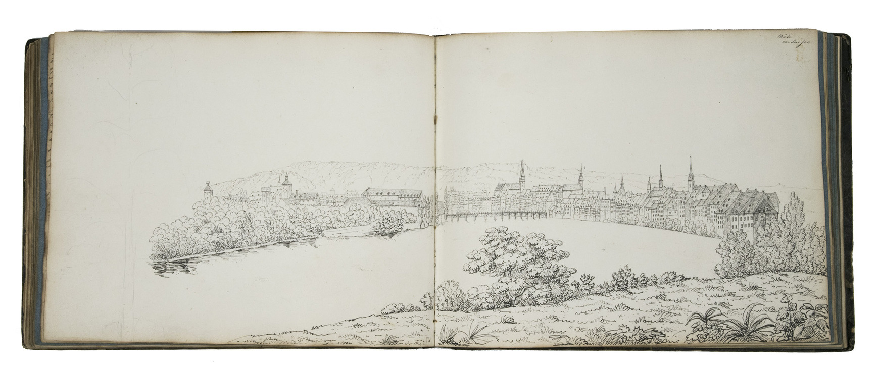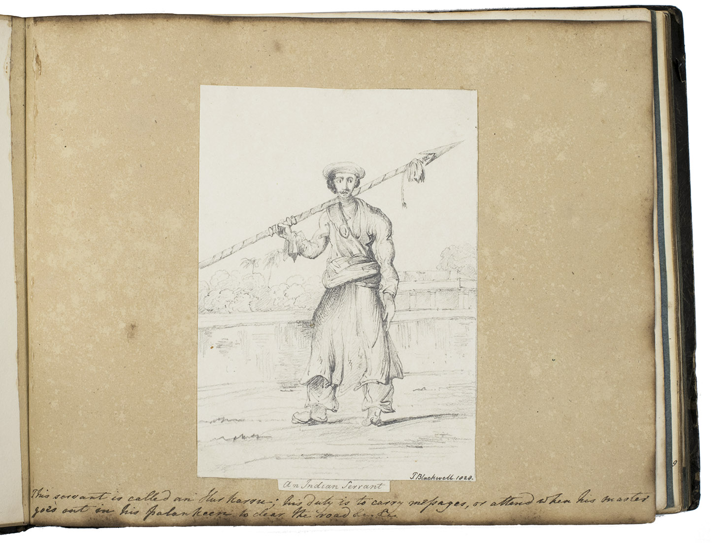 Another large part of the sketchbook consists of sketches of Swiss landscapes and panoramas, especially of the region surrounding the Swiss city of Basel. This sketchbook, nearly a personal dairy of Lieutenant Blackwell, contains sketches outlining a variety of subjects. He gives us an insight into Indian habits, animals and inhabitants, in the breeding of Arabian horses, shows us Swiss and Burmese landscapes and also Indian architecture and culture. With his refined drawings, Blackwell offers the reader an interesting historical artefact that gives an insight into the life of an English officer in the first half of the 19th century and the cultures he encountered, including his remarks upon them.