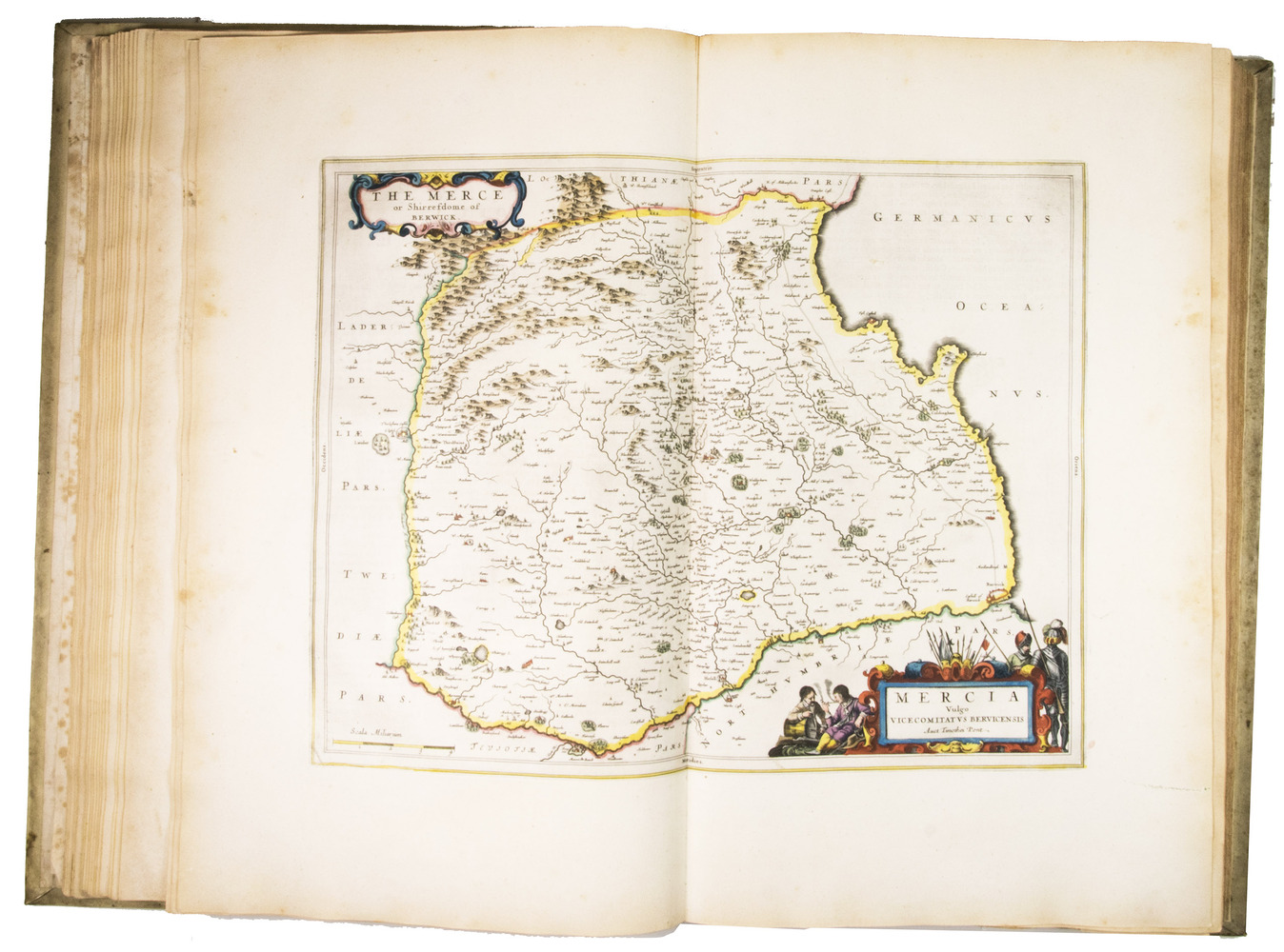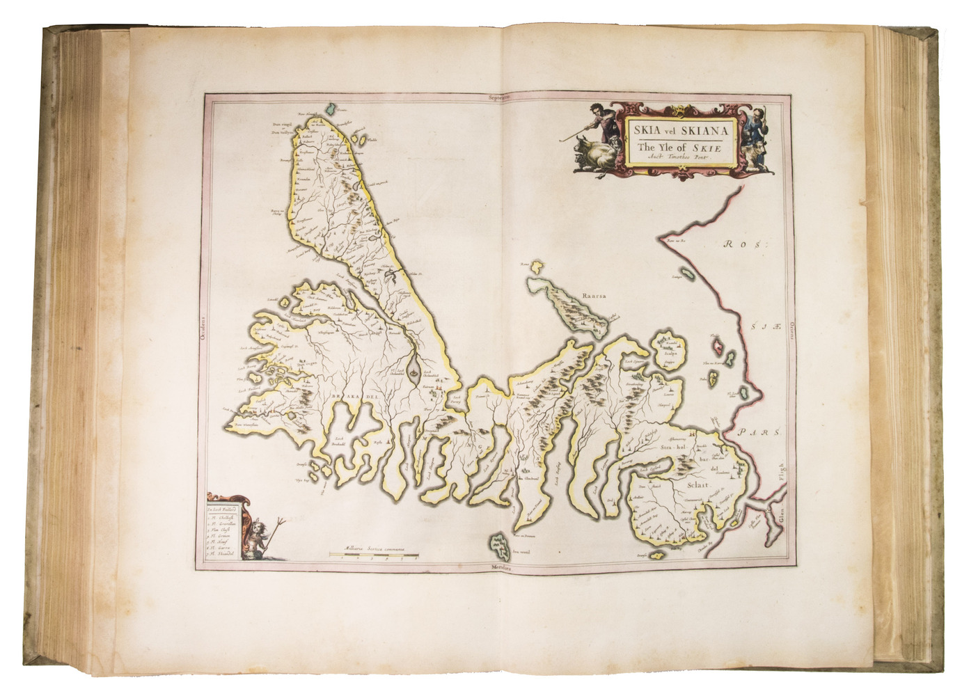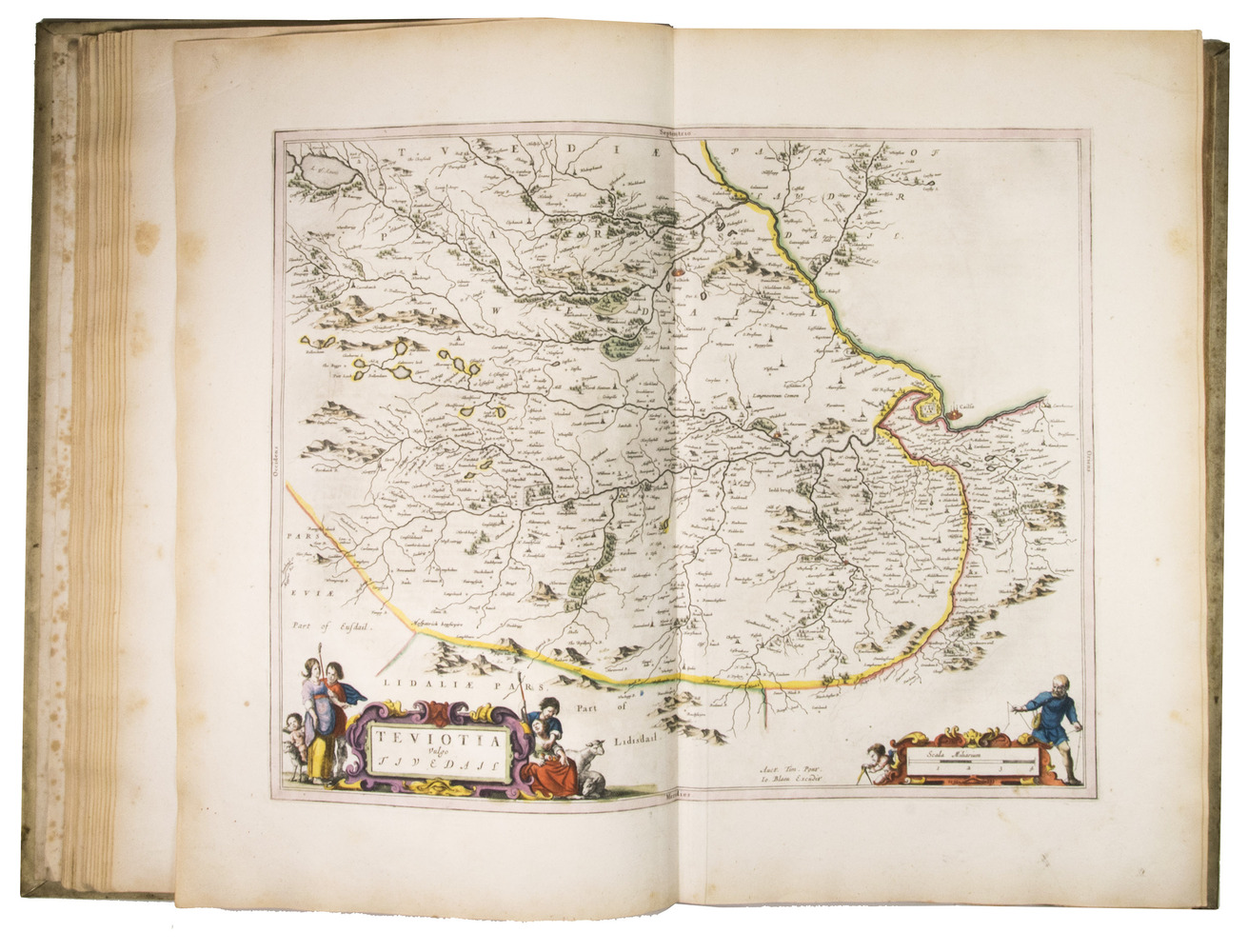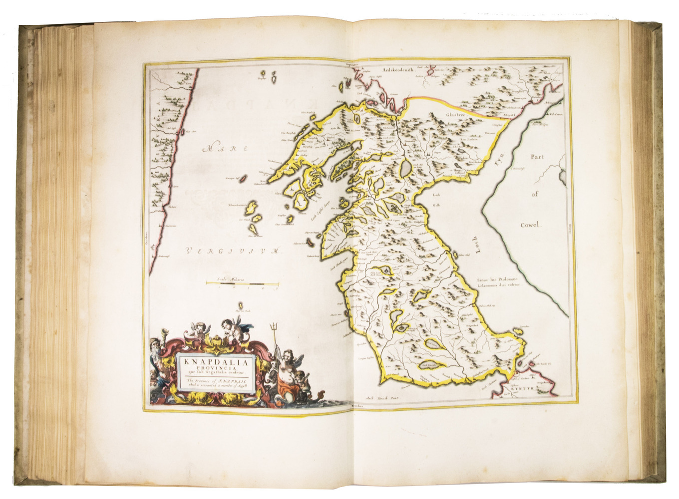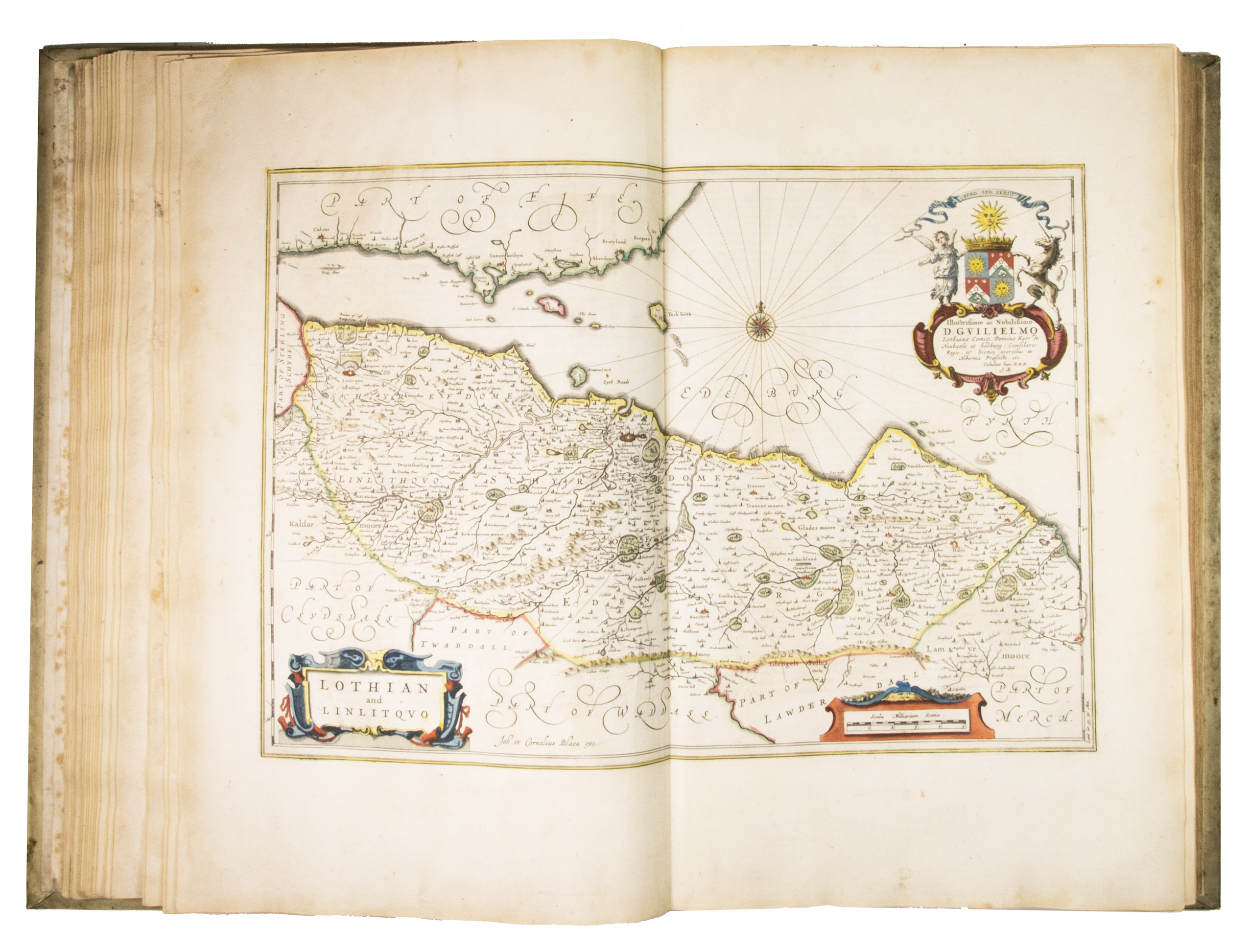 First edition, in Dutch, of the first national atlas of Scotland, far more accurate than any previously published, complete with the atlas of Ireland, the whole beautifully executed by Blaeu's printing office and with the engraved title-page, maps, and the cartouches, pictorial scenes and coats of arms in the maps coloured by a contemporary hand and highlighted with gold. The maps are coloured in outline, but with cities, forests, mountain ranges, etc. also coloured. It was published both separately and (as in the present copy) as the 5th volume of the 9-volume Dutch edition of Blaeu's Atlas major or Grooten atlas.