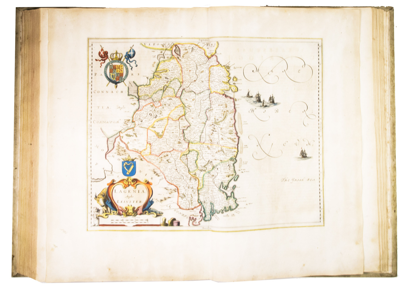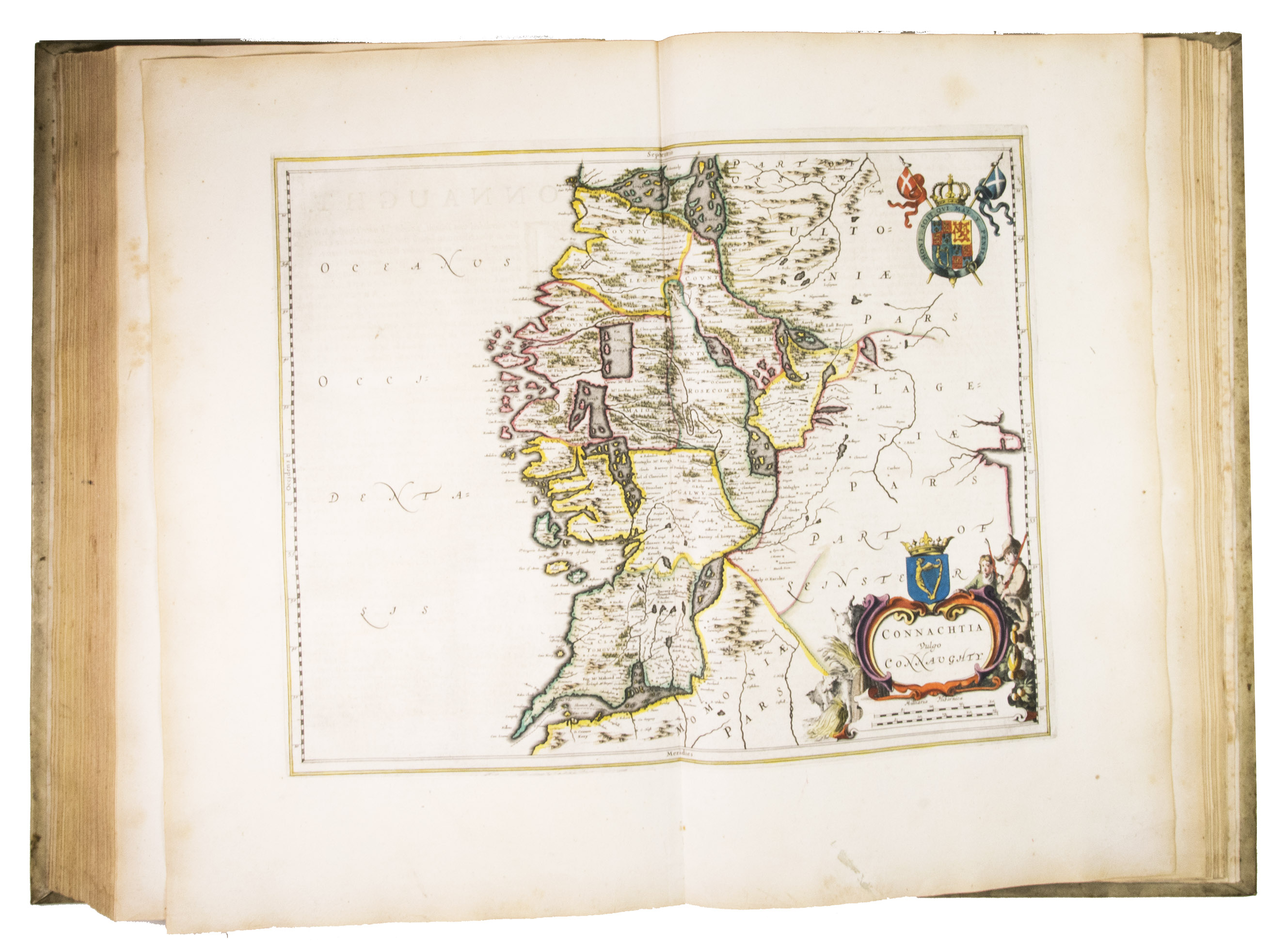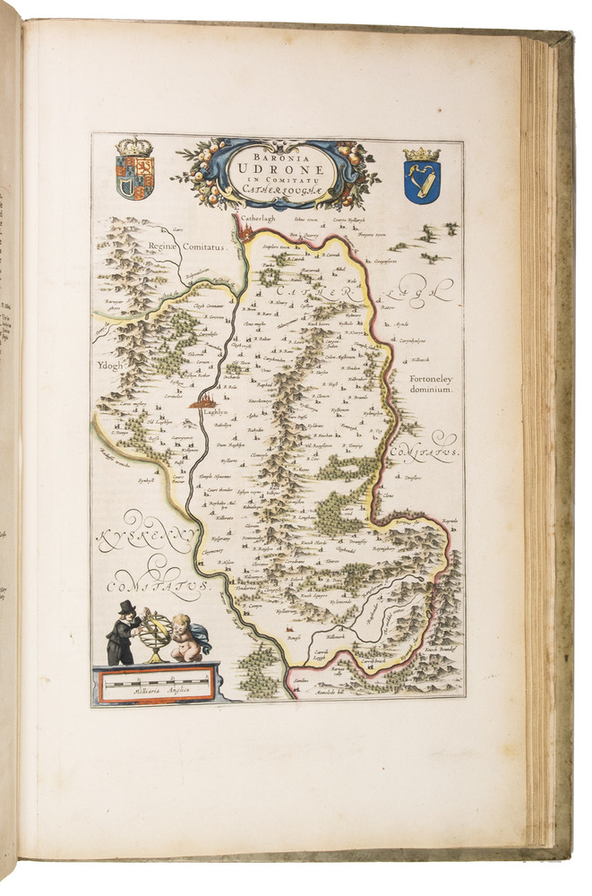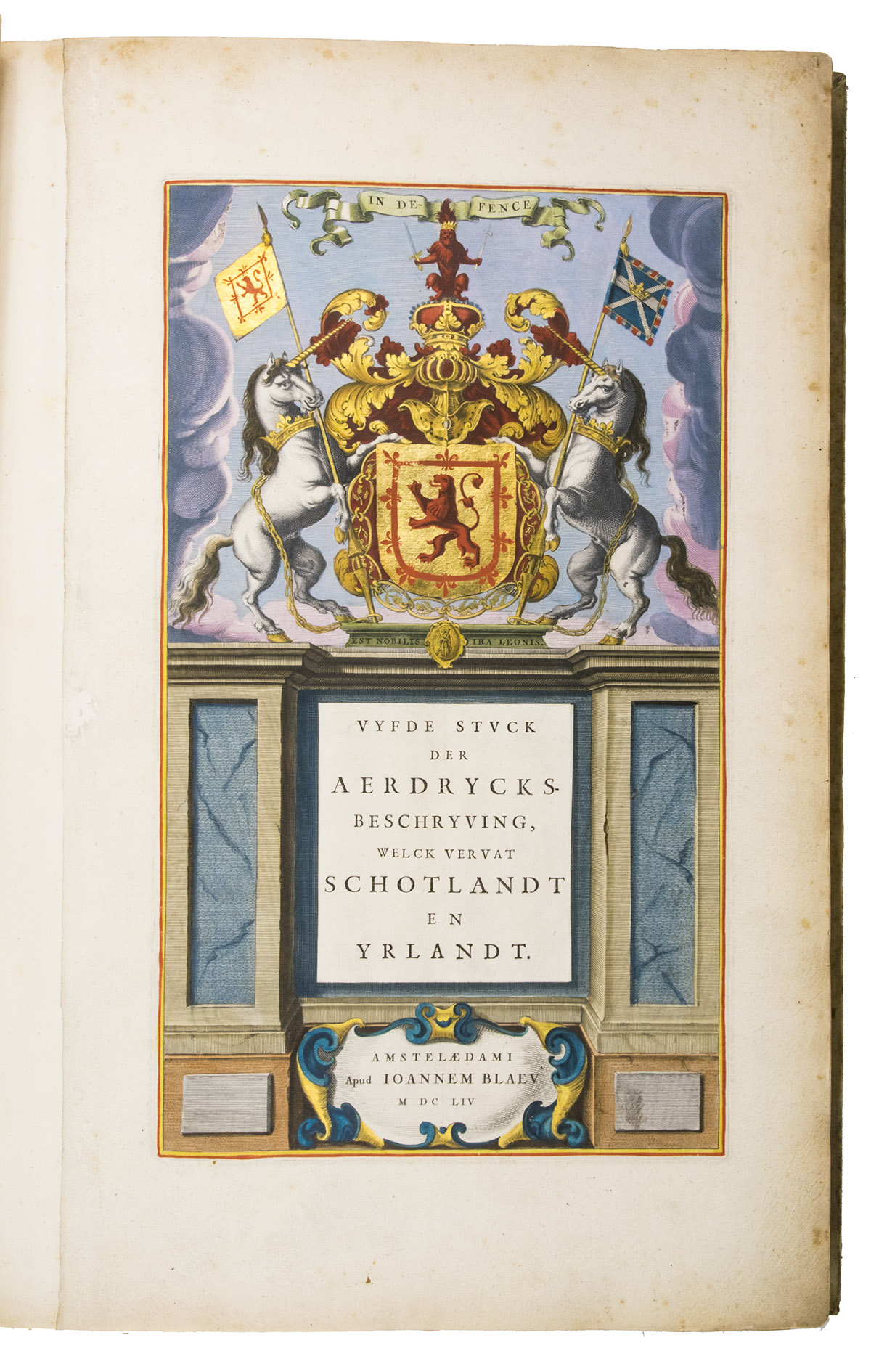Amsterdam, Joan Blaeu, 1654. Atlas folio (57.5 x 39.5 cm). With engraved architectural title-page with the arms of Scotland filling the top half, elaborately crested, supported by unicorns with flags and still with the old Stuart royalist mottos, and 55 engraved maps (54 double-page and 1 of the Irish County Caterlogh, full-page), often richly adorned with additional cartouches with regional scenes, but most often with coats of arms from the region. Numerous woodcut tailpieces and decorated initial letters. The title-page and all maps, including the cartouches, scenes and coats of arms, beautifully coloured by hand and highlighted with gold. All maps in their first states, without added ships or compass roses. 17th-century Dutch gold-tooled vellum. [8], 189, [1 blank], 70, [1, 1 blank] pp.