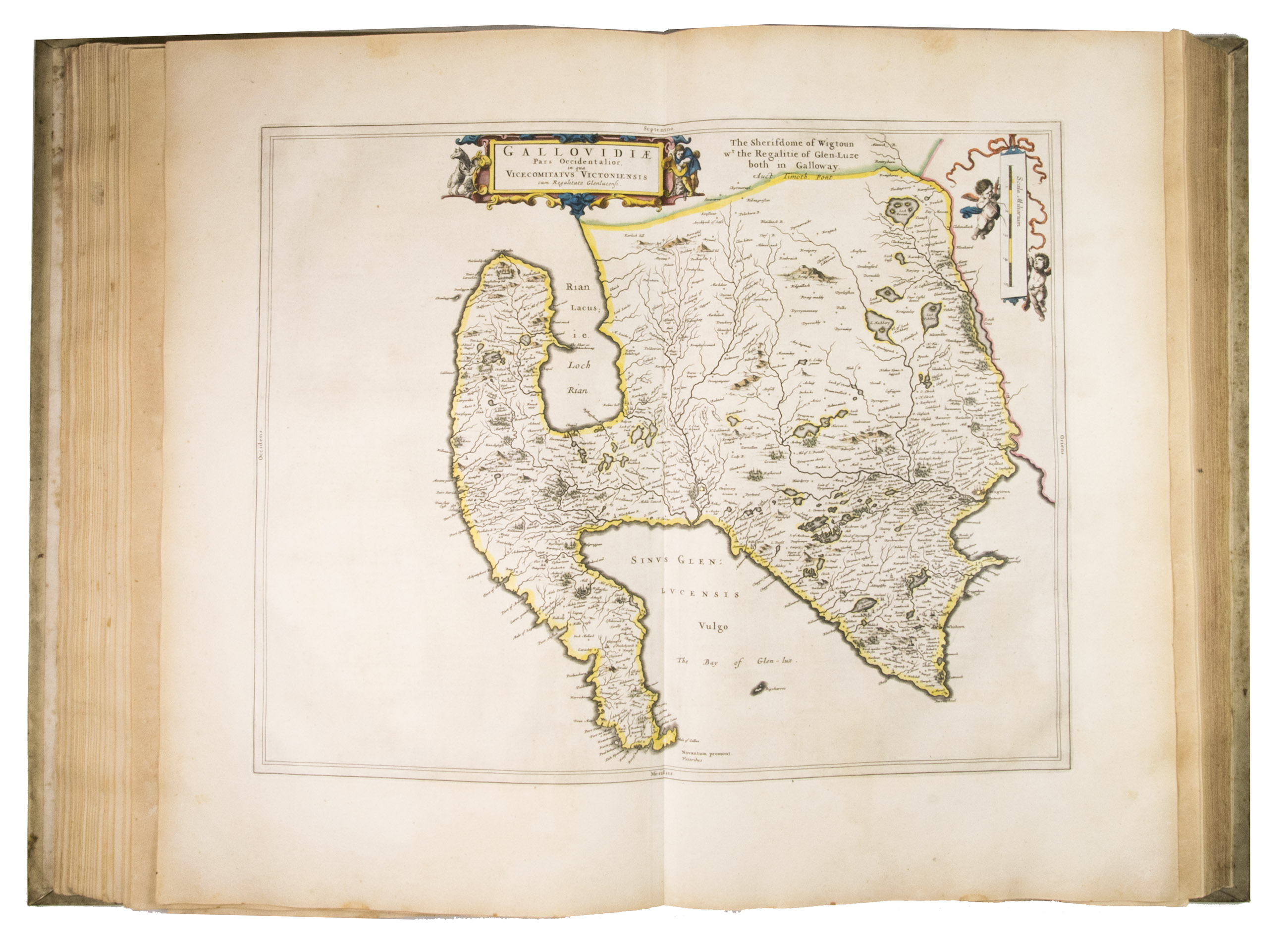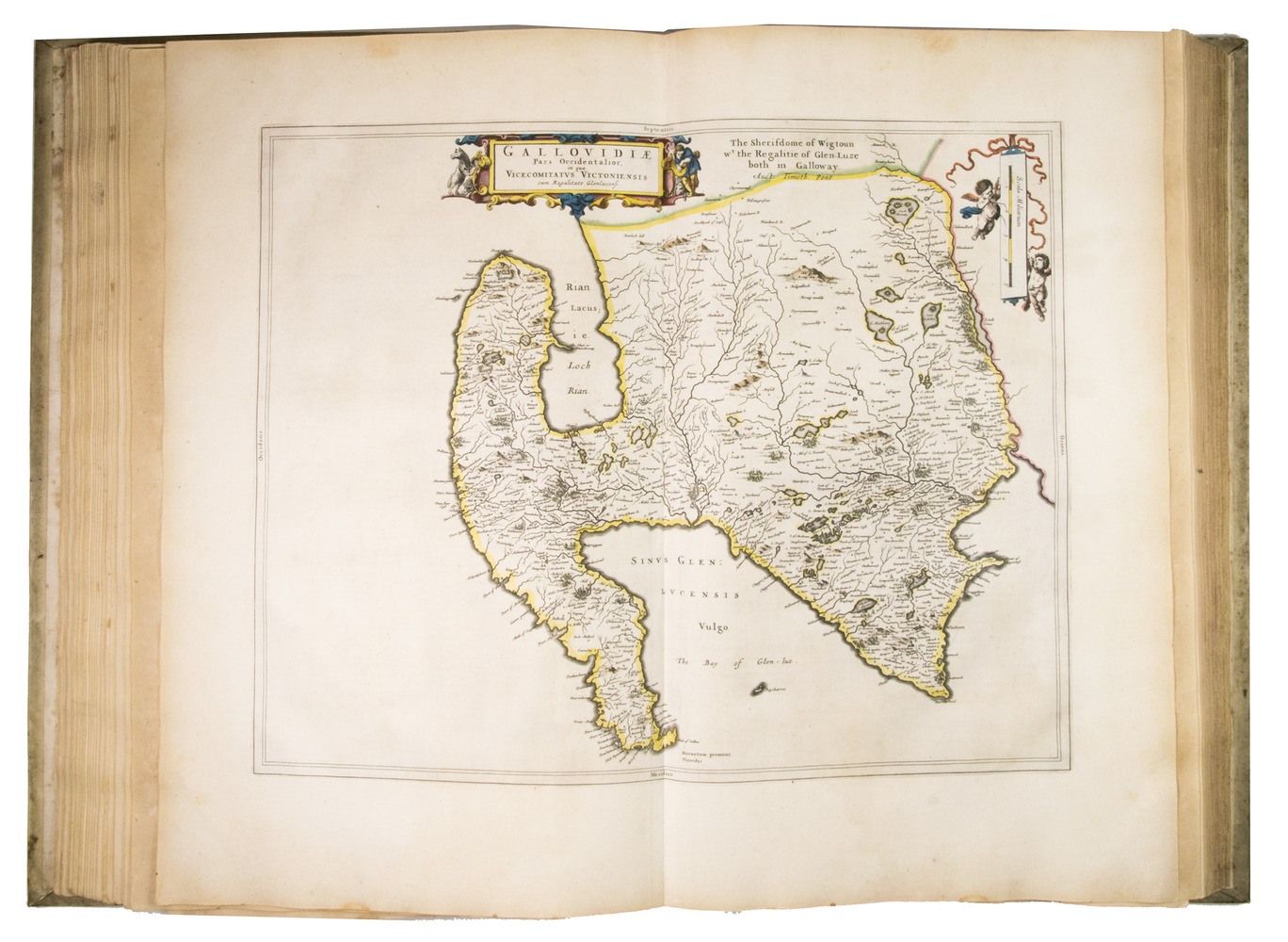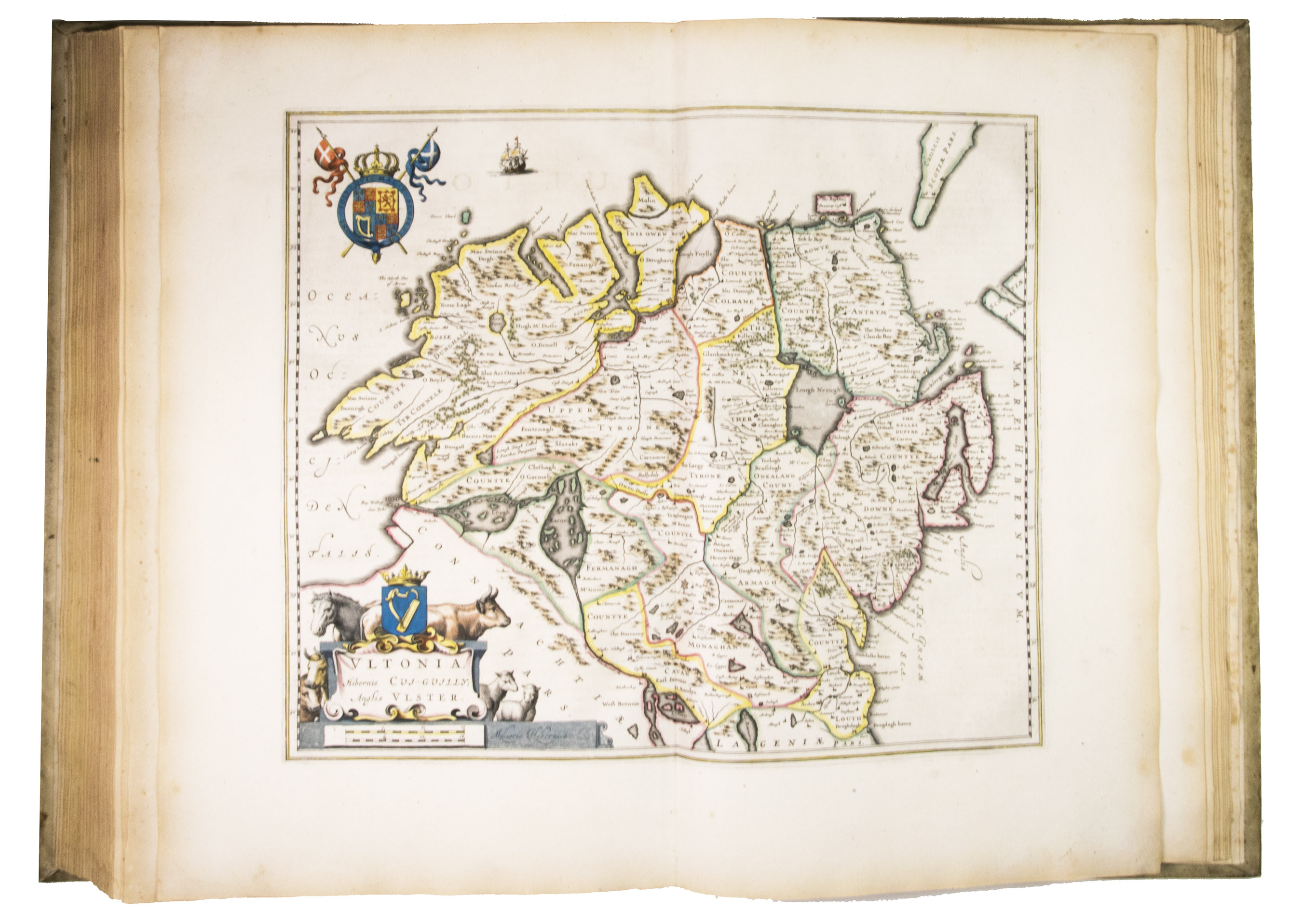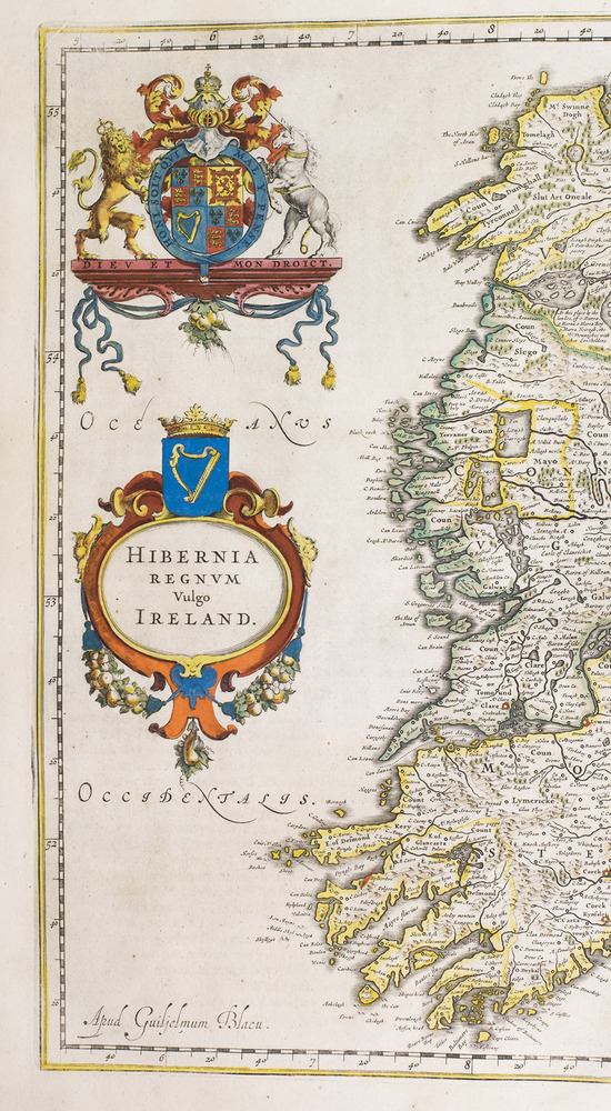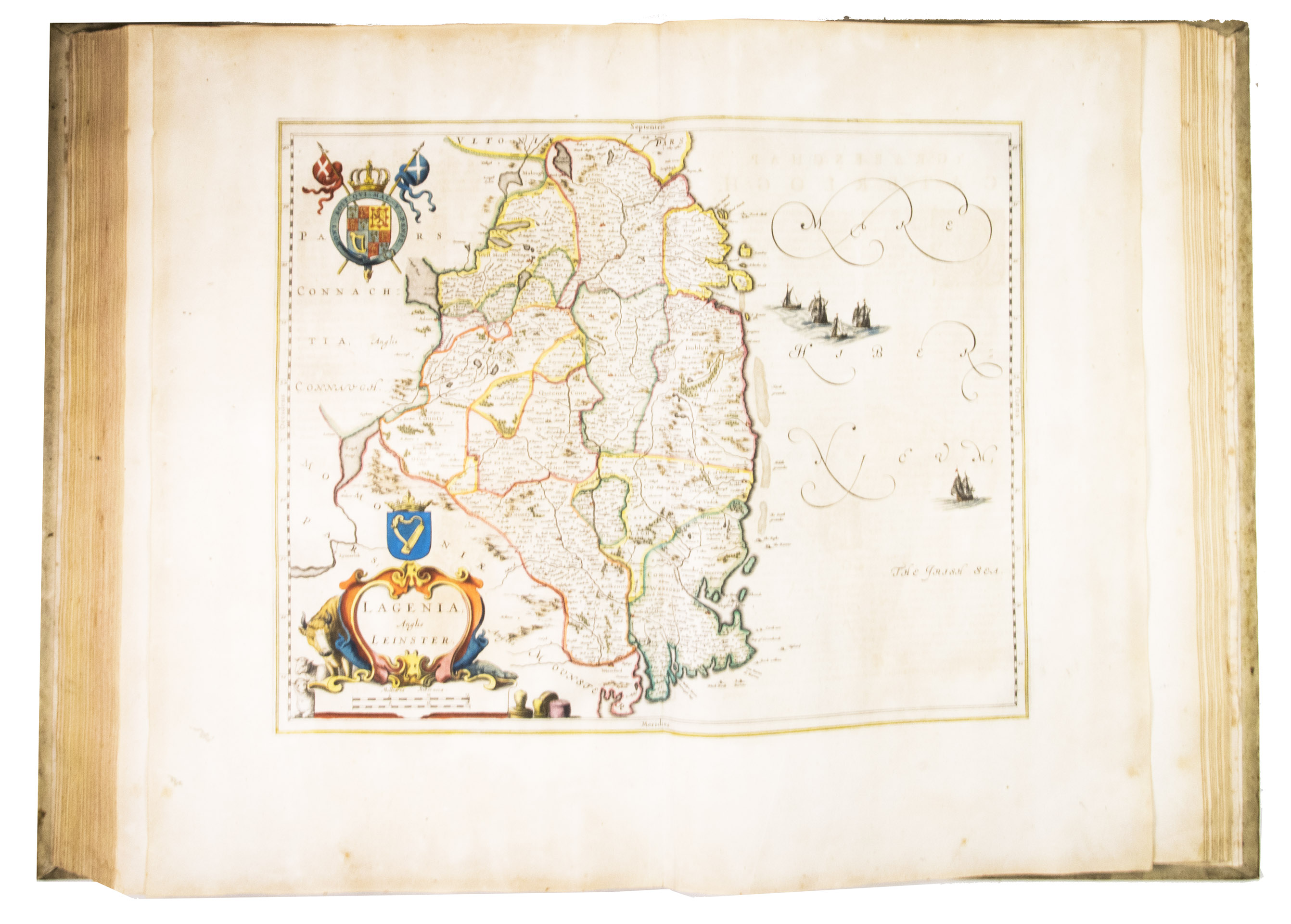 Amsterdam, Joan Blaeu, 1654. Atlas folio (57.5 x 39.5 cm). With engraved architectural title-page with the arms of Scotland filling the top half, elaborately crested, supported by unicorns with flags and still with the old Stuart royalist mottos, and 55 engraved maps (54 double-page and 1 of the Irish County Caterlogh, full-page), often richly adorned with additional cartouches with regional scenes, but most often with coats of arms from the region. Numerous woodcut tailpieces and decorated initial letters. The title-page and all maps, including the cartouches, scenes and coats of arms, beautifully coloured by hand and highlighted with gold. All maps in their first states, without added ships or compass roses. 17th-century Dutch gold-tooled vellum. [8], 189, [1 blank], 70, [1, 1 blank] pp.