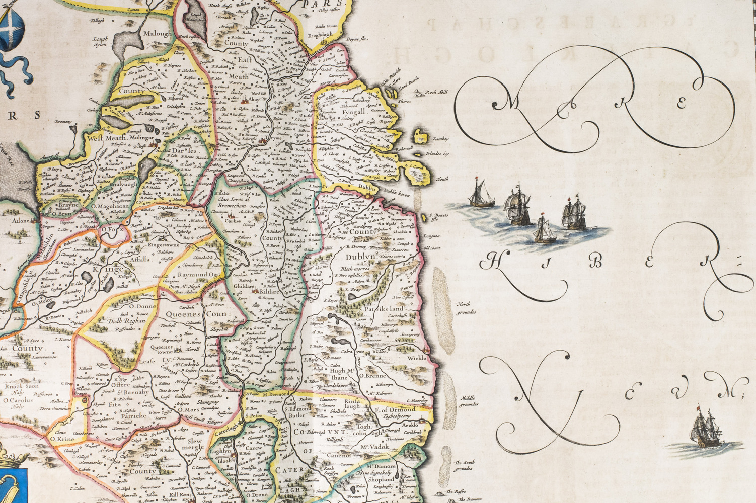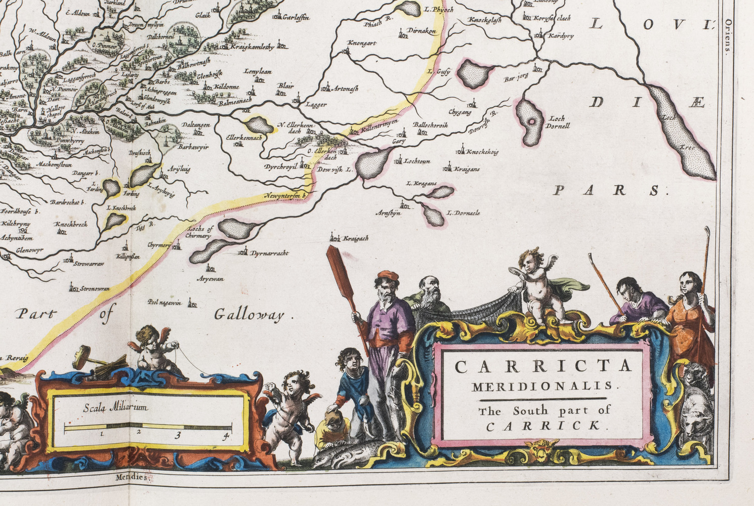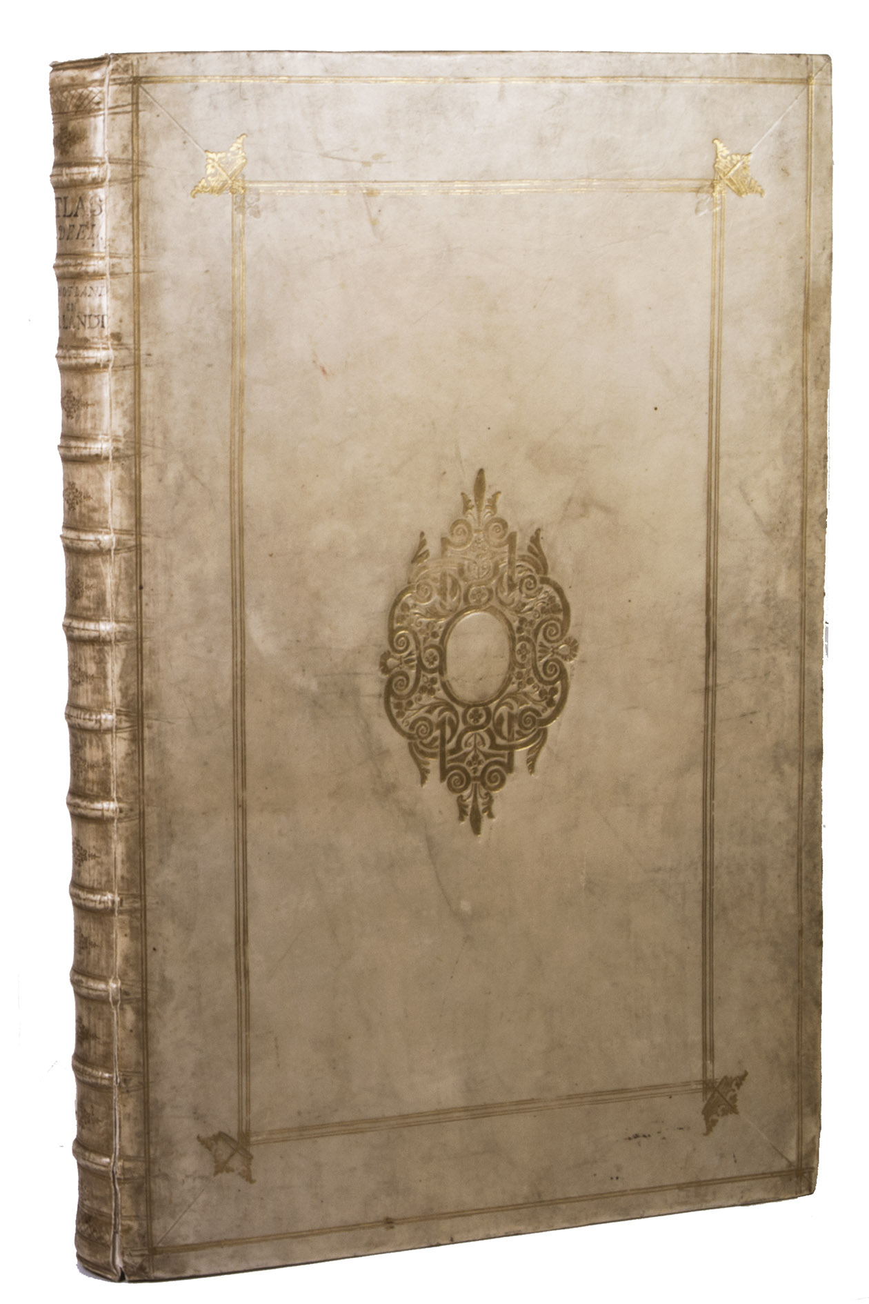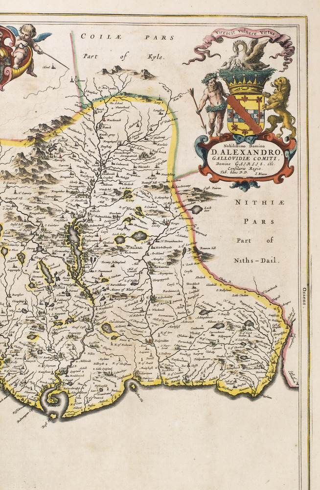 Amsterdam, Joan Blaeu, 1654. Atlas folio (57.5 x 39.5 cm). With engraved architectural title-page with the arms of Scotland filling the top half, elaborately crested, supported by unicorns with flags and still with the old Stuart royalist mottos, and 55 engraved maps (54 double-page and 1 of the Irish County Caterlogh, full-page), often richly adorned with additional cartouches with regional scenes, but most often with coats of arms from the region. Numerous woodcut tailpieces and decorated initial letters. The title-page and all maps, including the cartouches, scenes and coats of arms, beautifully coloured by hand and highlighted with gold. All maps in their first states, without added ships or compass roses. 17th-century Dutch gold-tooled vellum. [8], 189, [1 blank], 70, [1, 1 blank] pp.