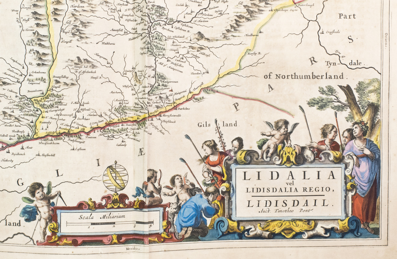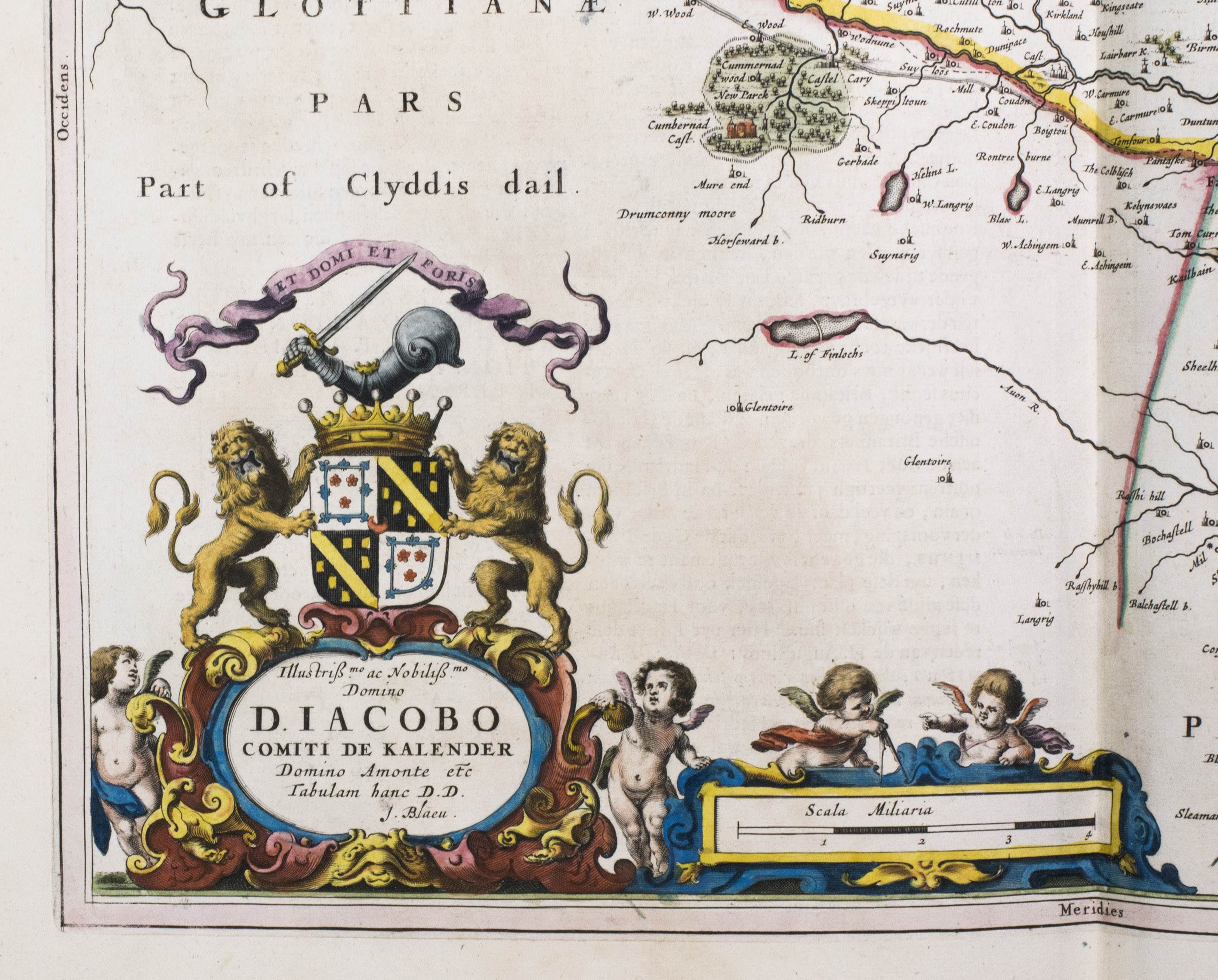Willem Jansz. Blaeu initiated work on a Scottish atlas ca. 1631, based at first on manuscript maps made by Timothy Pont ca. 1596-1600, but it was set aside. Blaeu died in 1638 and his son Joan returned to the project, gaining the patronage of King Charles I of England in 1641. King Charles enlisted the Scottish geographer Robert Gordon, near Aberdeen, who carried out new surveys to correct and supplement Pont's maps. The English Civil War delayed work further. King Charles was beheaded in 1649, so when the atlas finally appeared in 1654 (in Latin, French, Dutch, German and Spanish editions) it bore a privilege from (among others) Oliver Cromwell. It was the second volume to be completed (after France) of what was to become Blaeu's most famous atlas ("the greatest and finest atlas ever published": De la Fontaine Verwey), the Dutch edition completed in 1665. The title in the letterpress slip on the engraved title-page and the volume number on the spine show that the present copy was included as part of the Grooten atlas, but both the states of the maps and the variant readings in the letterpress text show the versions noted by Van der Krogt in the earliest copies, issued separately, confirming the title-page date 1654.