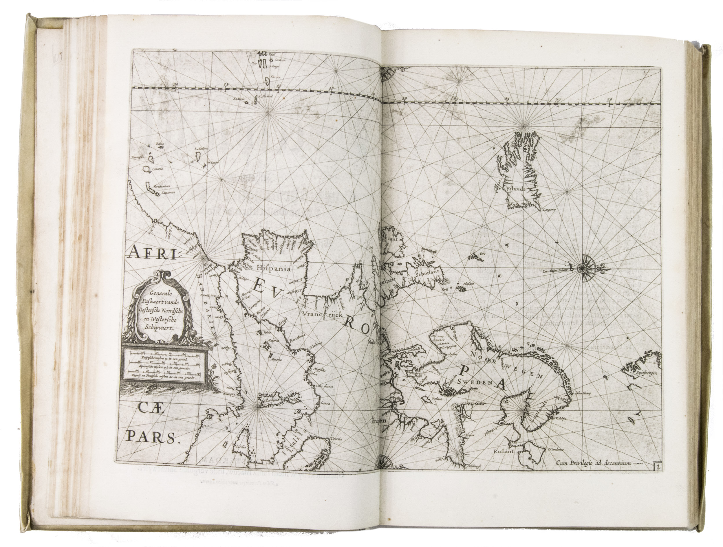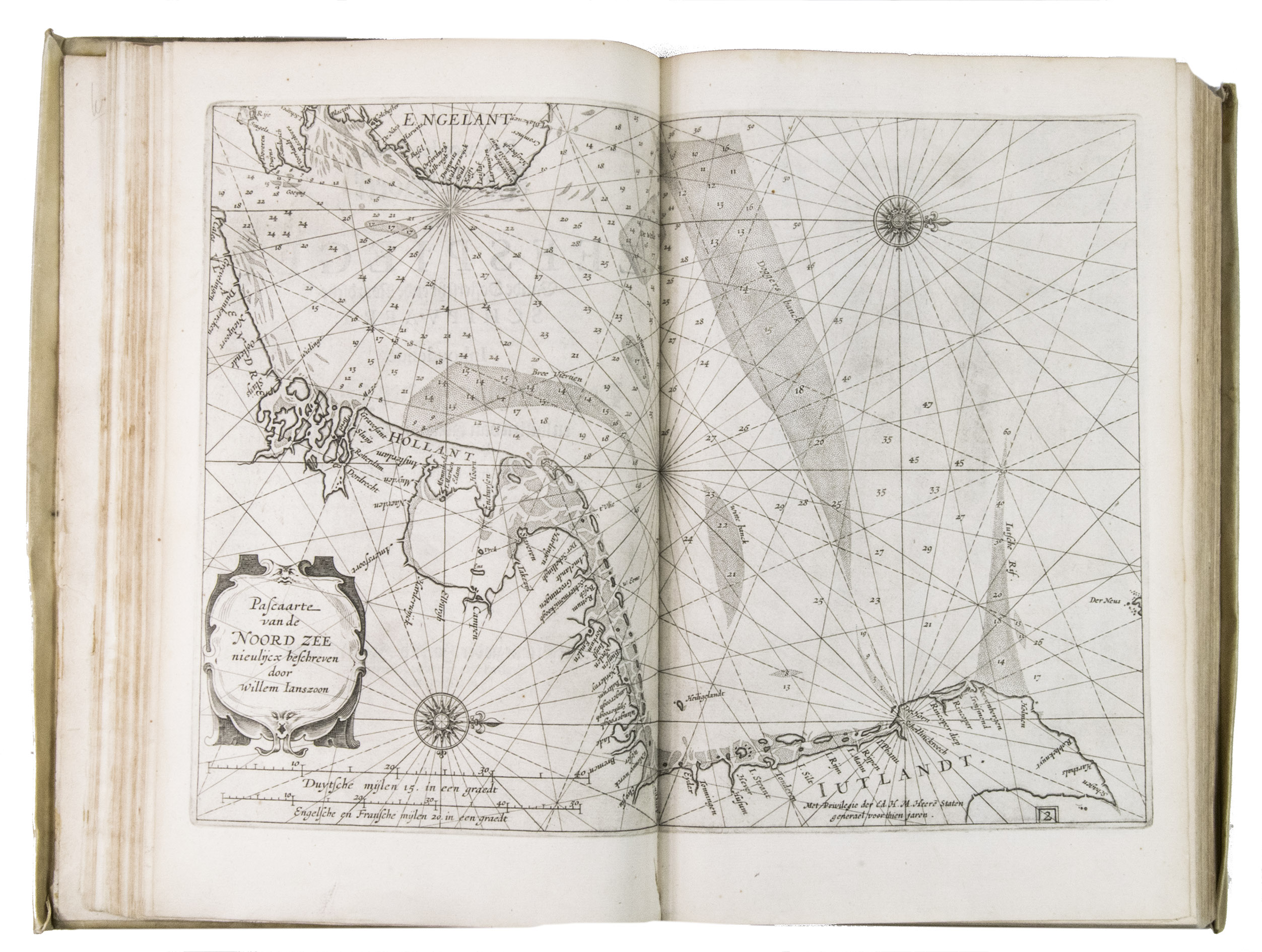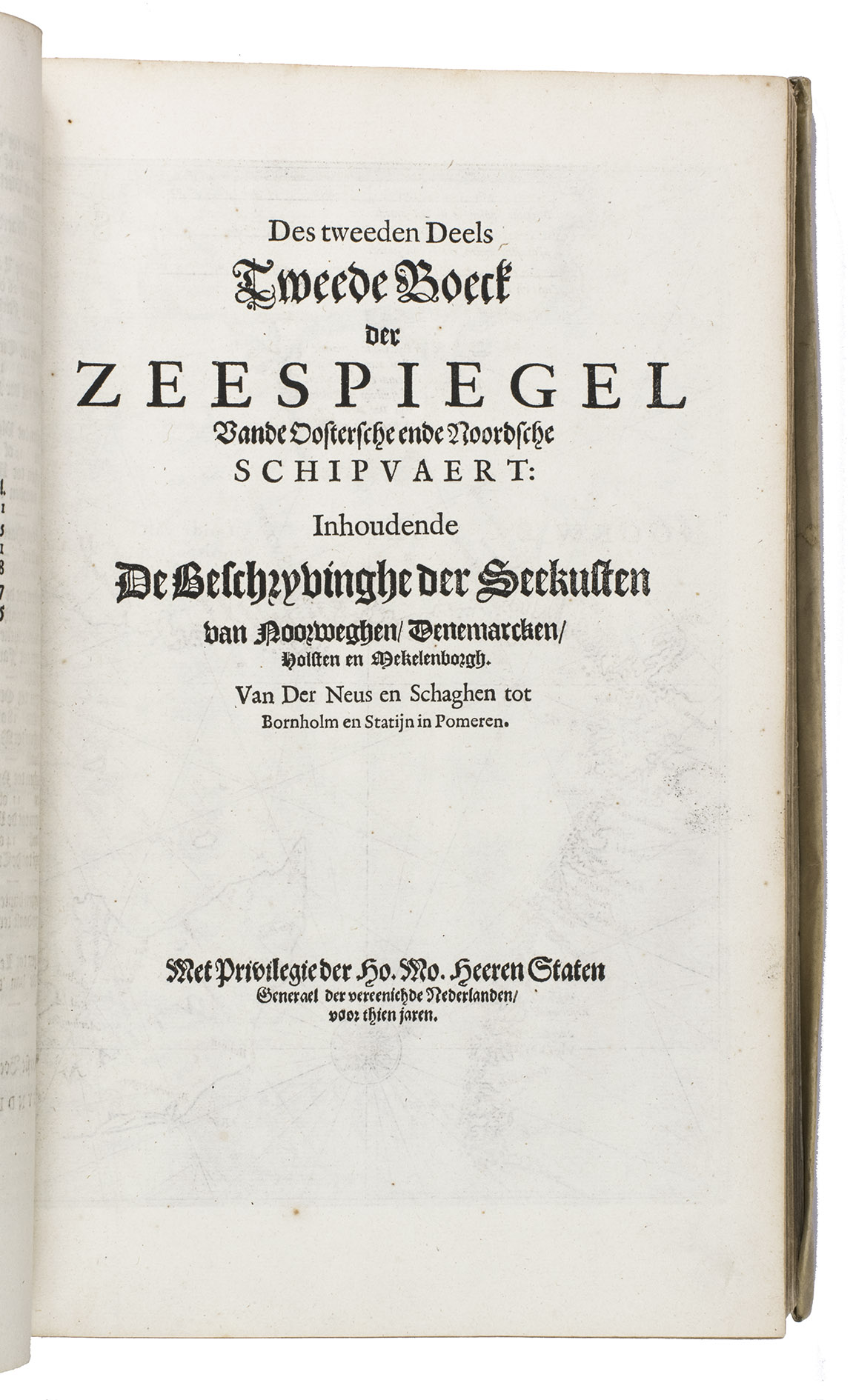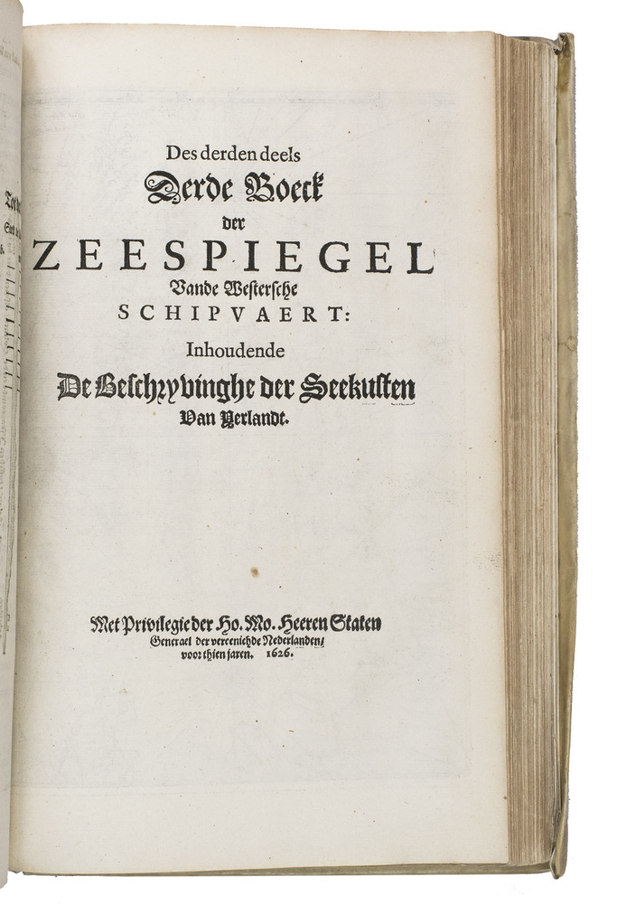 The Zeespiegel consists of three parts. It covers much the same coastal regions as in Het Licht der Zee-vaert, but does so in much greater detail and with larger scale charts, showing the European coast, all the way from Nova Zembla in the north to Malaga in the south, as well as the coasts of Africa from the Barbary (West) coast to the Canary Islands. The coasts of the Mediterranean were included in a fourth part, which appeared in 1638.