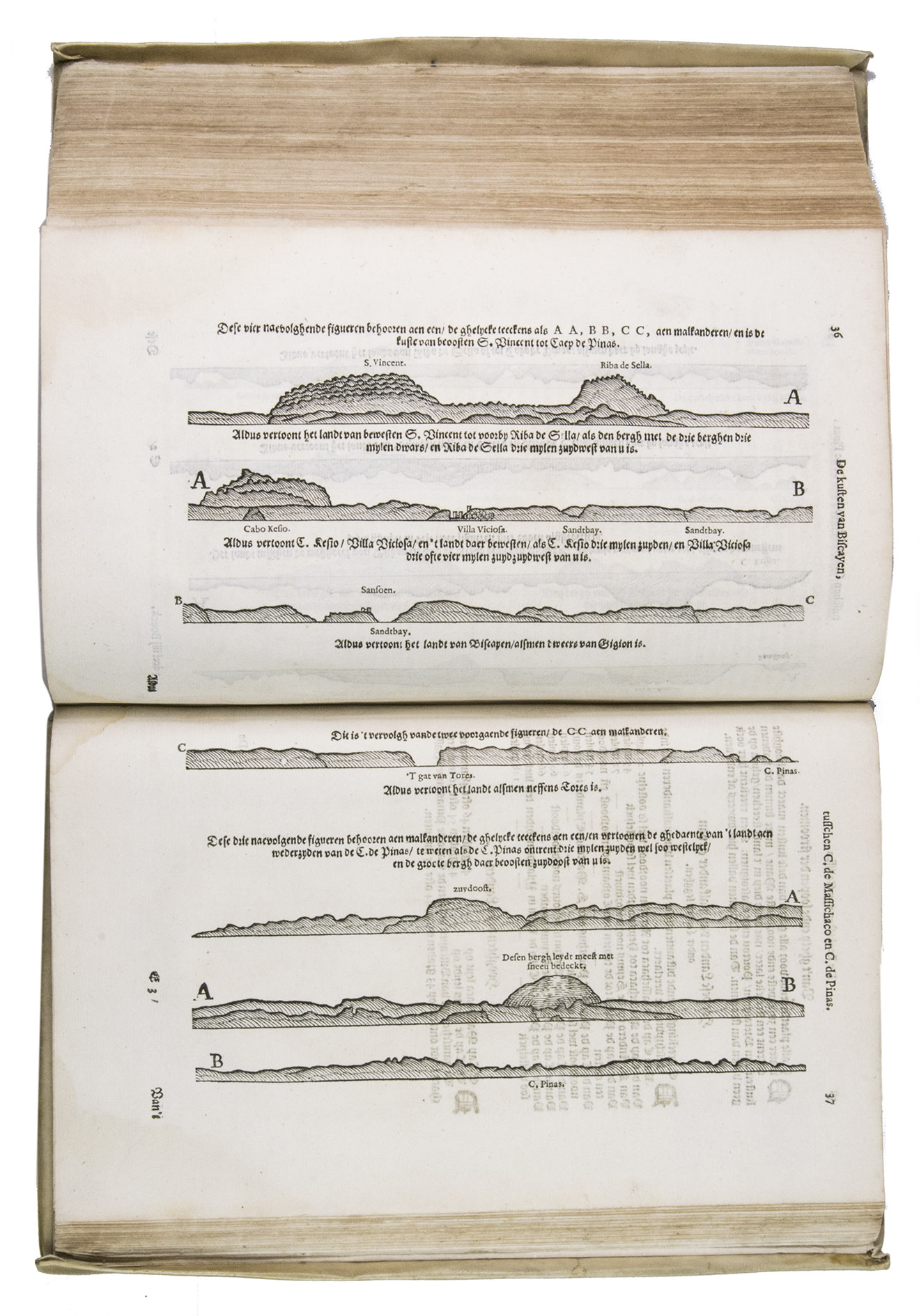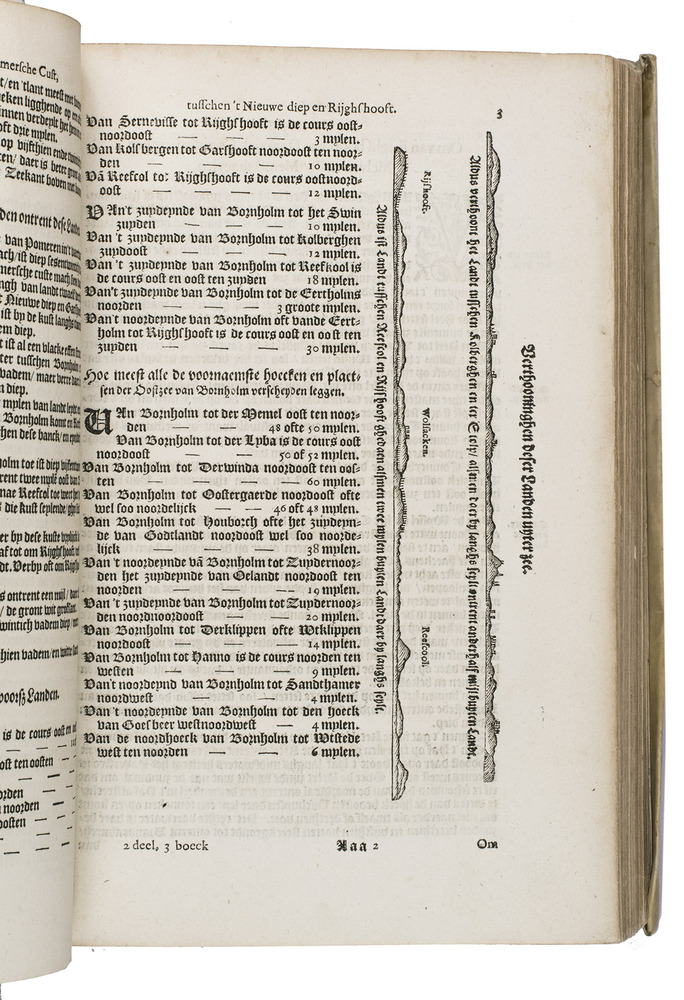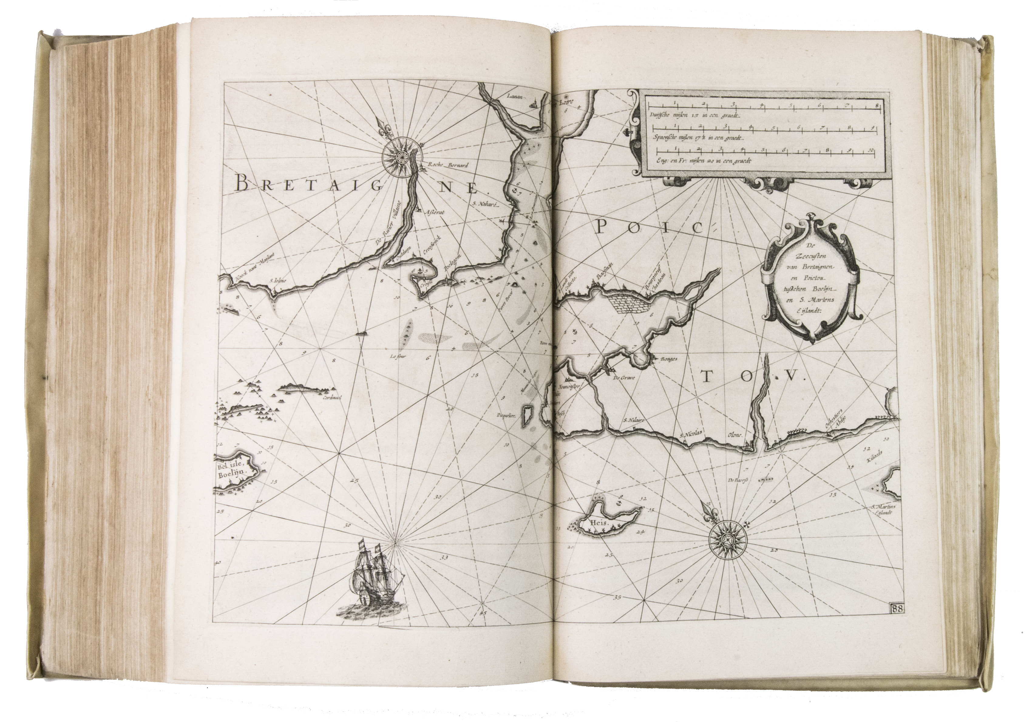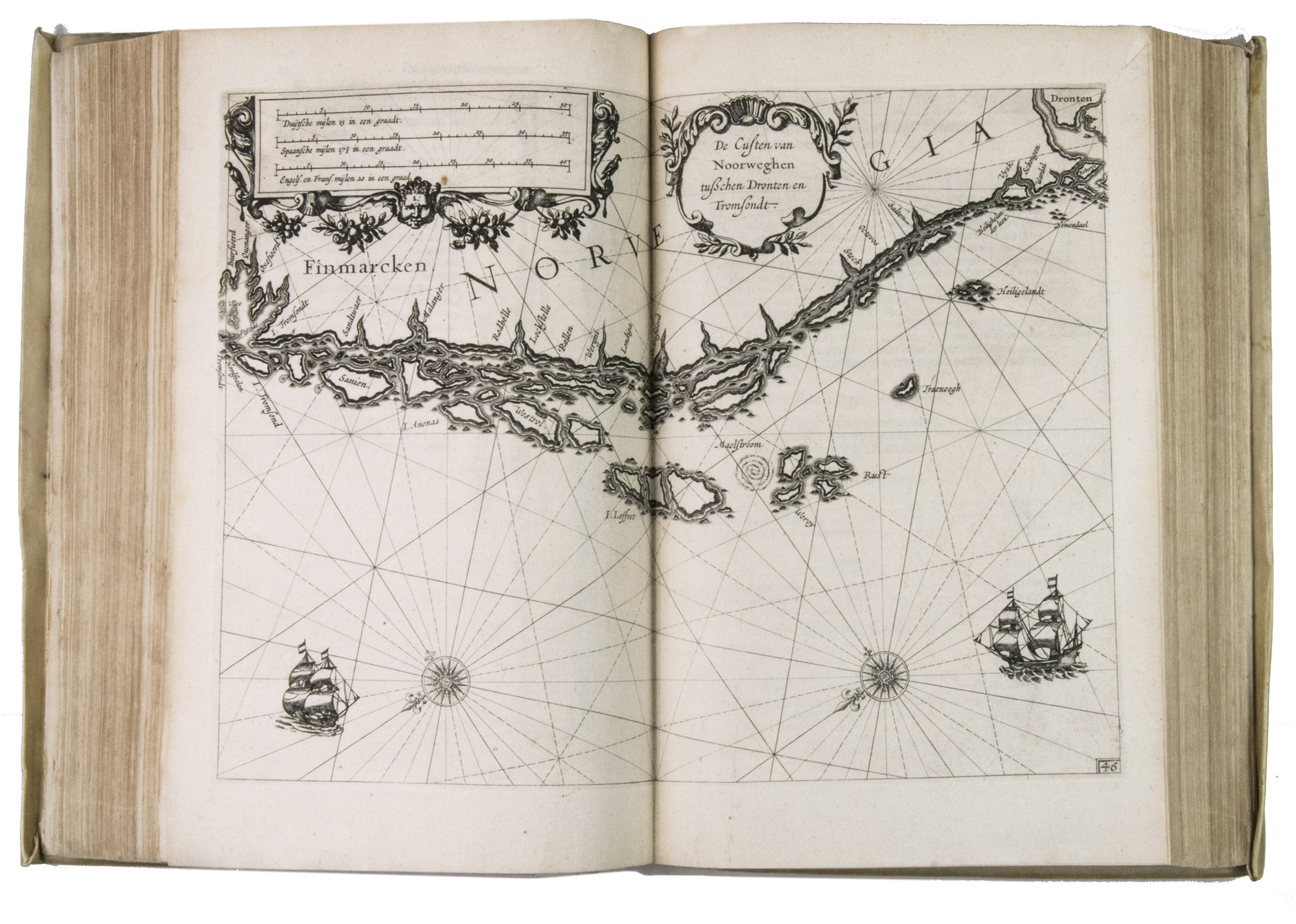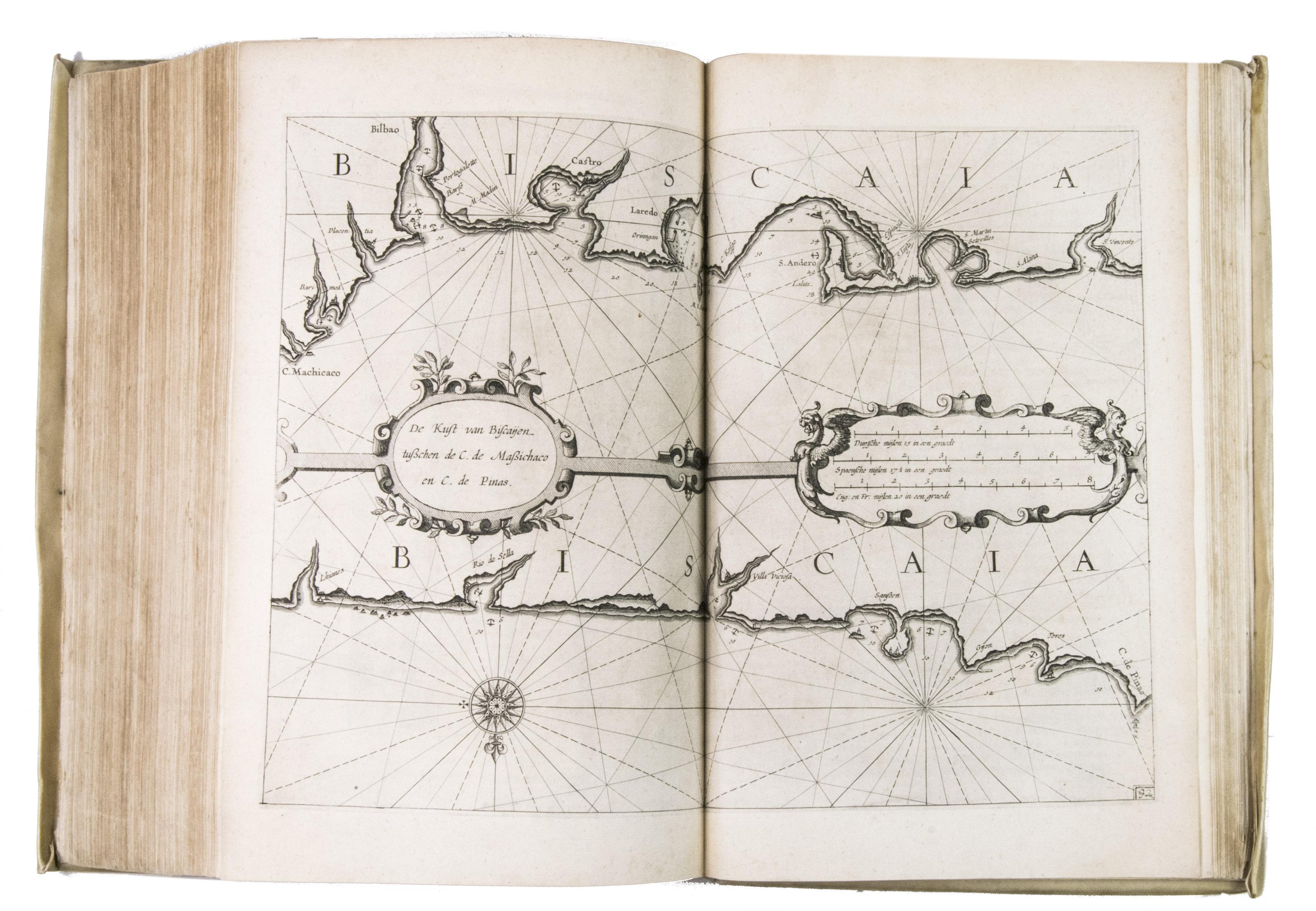 The Zeespiegel consists of three parts. It covers much the same coastal regions as in Het Licht der Zee-vaert, but does so in much greater detail and with larger scale charts, showing the European coast, all the way from Nova Zembla in the north to Malaga in the south, as well as the coasts of Africa from the Barbary (West) coast to the Canary Islands. The coasts of the Mediterranean were included in a fourth part, which appeared in 1638.