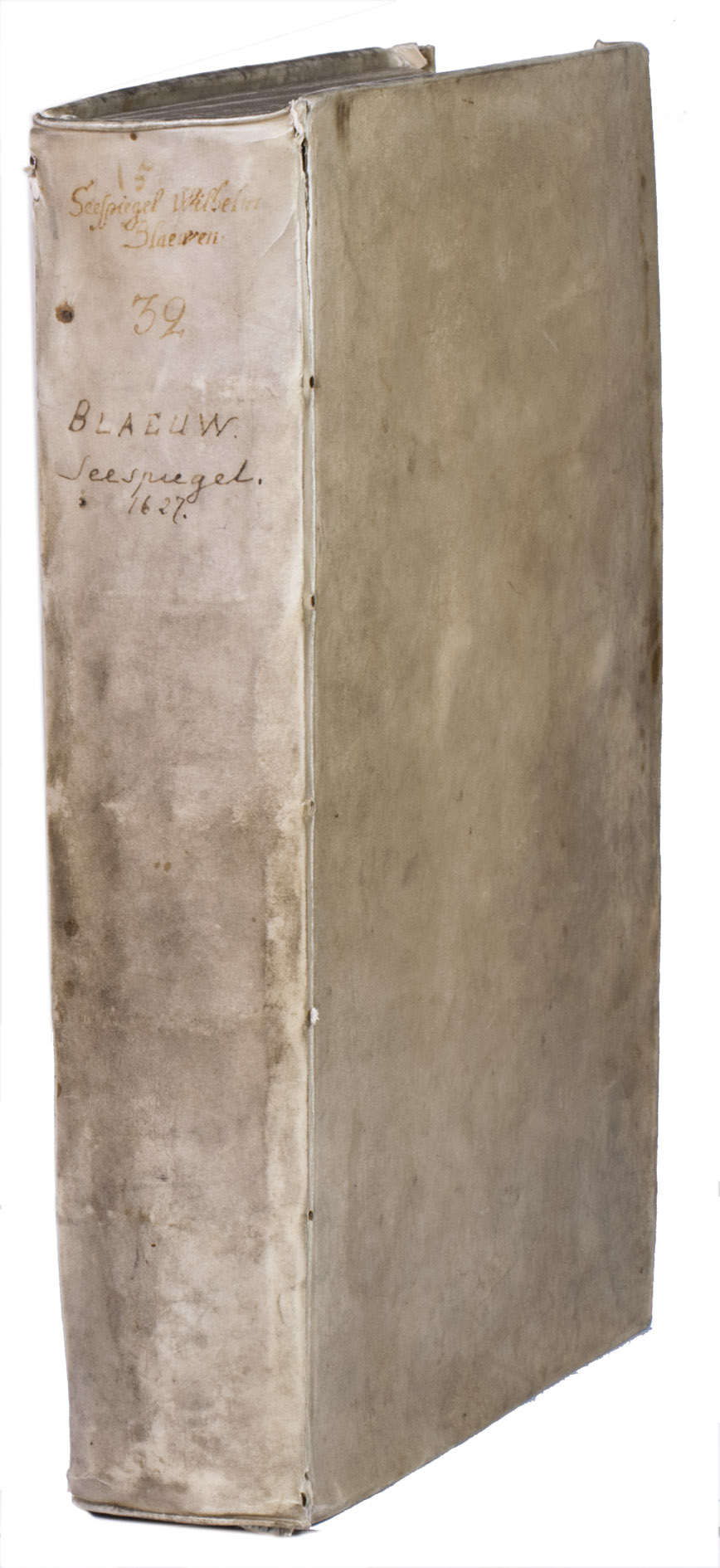 With the bookplate of the French numismatist T. E. Mionnet mounted on the front pastedown, an armorial bookplate mounted below, and a contemporary, partly clipped, ownership annotation on the title page of the first part. The vellum is slightly soiled, most of the sewing supports have broken, but the structural integrity of the work is still intact. The work is slightly browned throughout, with small marginal tears or holes in some of the charts and leaves, the volvelle on page 62 of part 1 without the moveable part, lacking chart 56, a water stain in the lower outer corner of the last 60 leaves. Otherwise in good condition. Koeman IV, M Bl. 32; Koeman, Blaeu and his grand Atlas, p. 29; STCN 083423273 (4 copies, of which 1 incomplete); Tiele, Ned. bibliogr., 124; USTC 1013047 (3 copies, of which 1 incomplete); WorldCat 68853876, 979986167, 248543751, 311897589 (4 copies).
