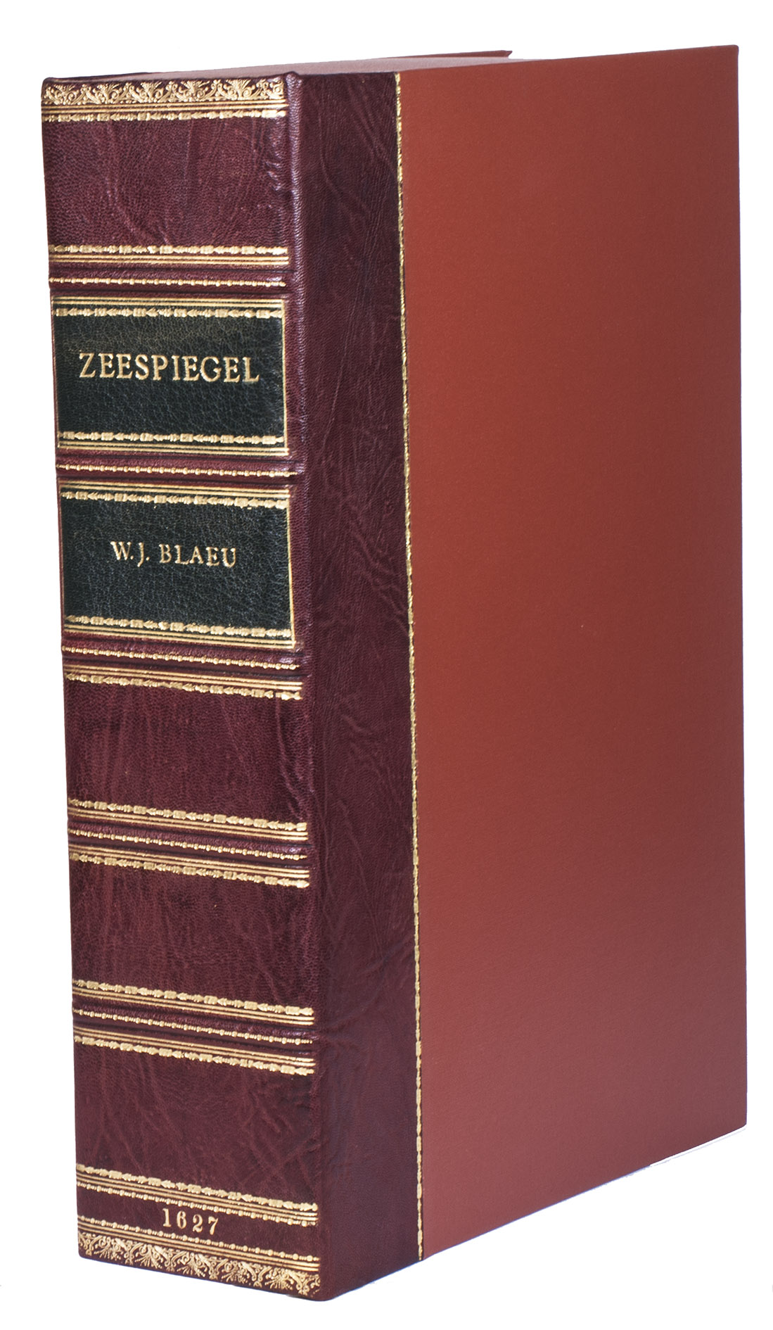Amsterdam, Willem Jansz. Blaeu, 1627. 3 parts in 1 volume, parts 2 and 3 consist of 6 books each. Folio. With 108 numbered engraved charts, 2 half-page engraved charts, 2 volvelles, a woodcut vignette on the divisional title page of each part, and numerous woodcut illustrations in the text. Contemporary overlapping vellum. The work is preserved in a gold-tooled half red morocco clamshell box, with two green morocco title labels, lettered in gold, red buckram sides, and a green felt lining. [16], 64; 39, [1], 43, [1], 48, 32, 28, 24; 32, 52, 46, 43, [1], 40, 23, [1 blank] pp.