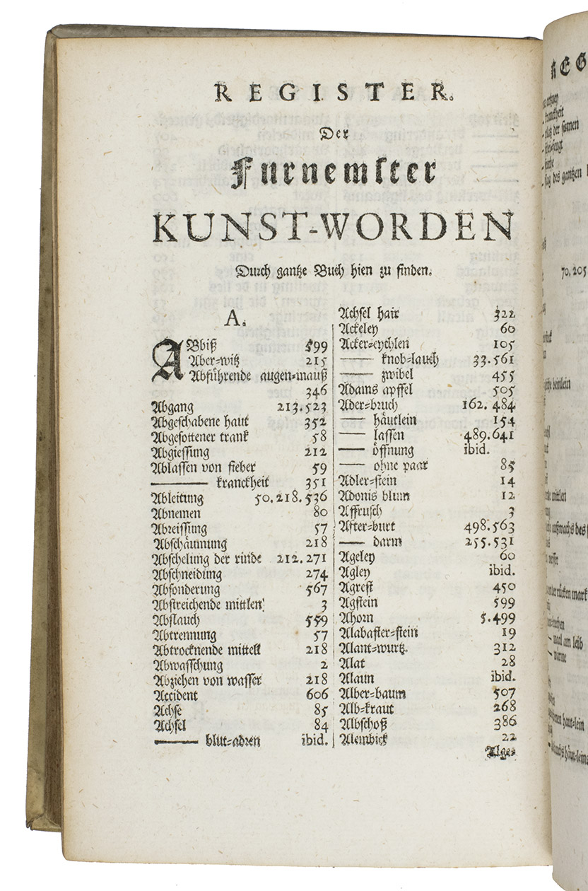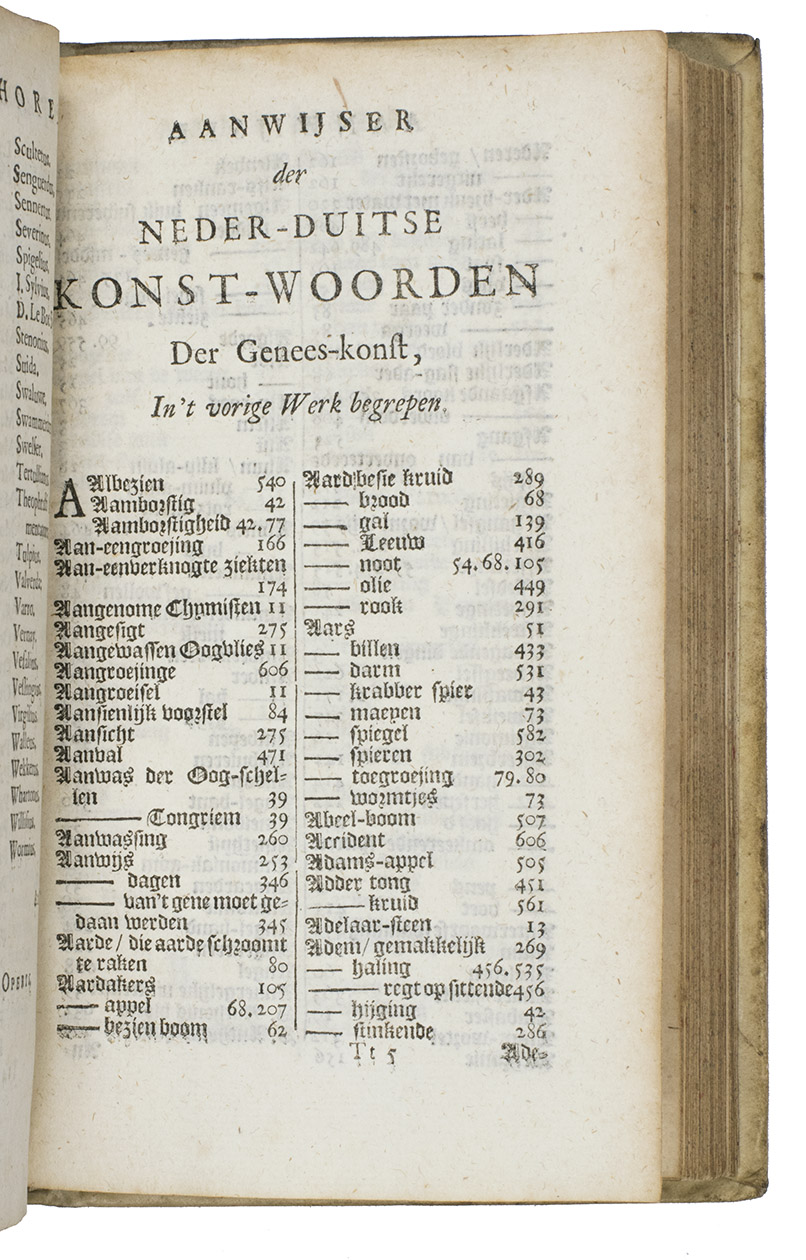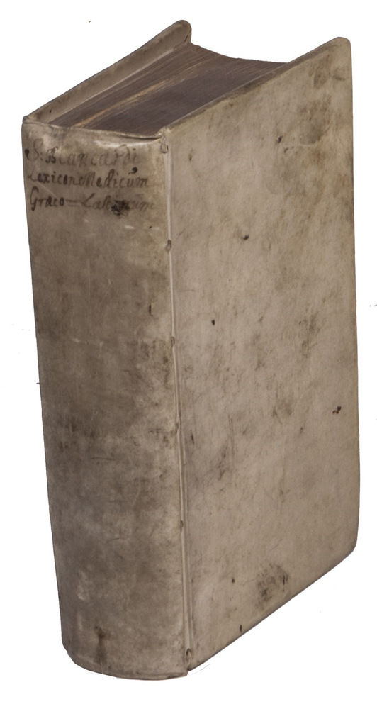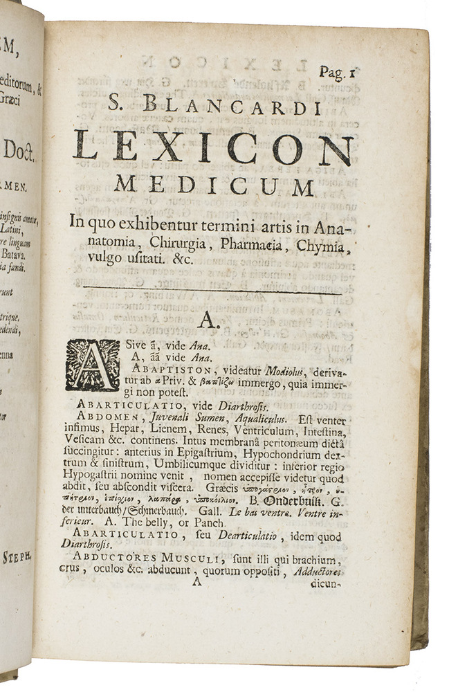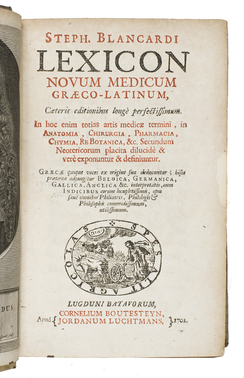 Much enlarged edition of Steven Blankaarts Lexicon medicum, that was first published in 1659. One of the many continually enlarged re-editions was published by the Leiden publishers Boutersteyn and Luchtmans in 1690; our copy is from this edition with a new title-page dated 1701. Some of the re-editions with titles as Lexicon novum medicum, or Lexxicon medicum renovate were published in Germany (Jena, Frankfurt) and England (London), including translations in German and English.