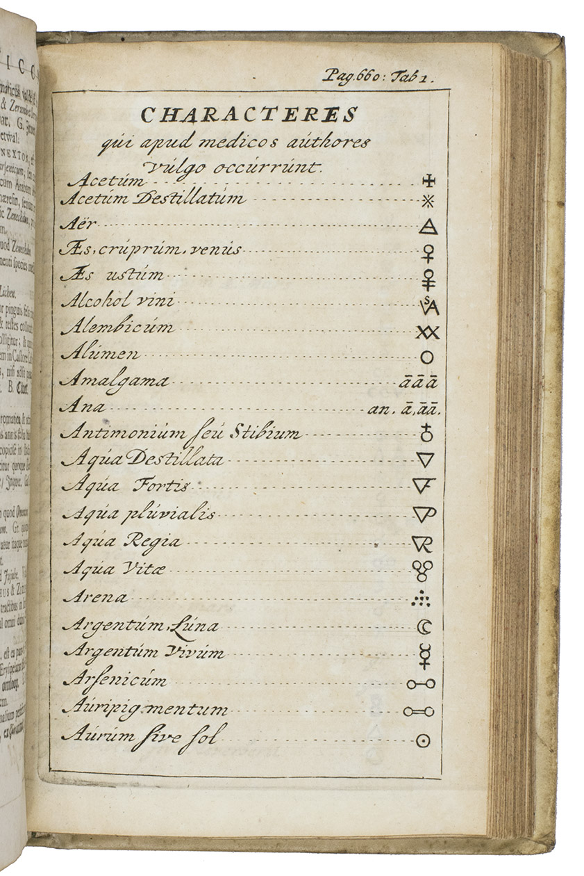 Leiden, Cornelis Boutesteyn & Jordaan Luchtmans, 1701. 8vo. With the engraved portrait of the author, 4 engraved full-page tables of medical symbols, title-page printed in red and black, some woodcut initials and tail-pieces. Vellum over boards, title written in ink on spine, sprinkled edges. [16], 662, [194] pp.
