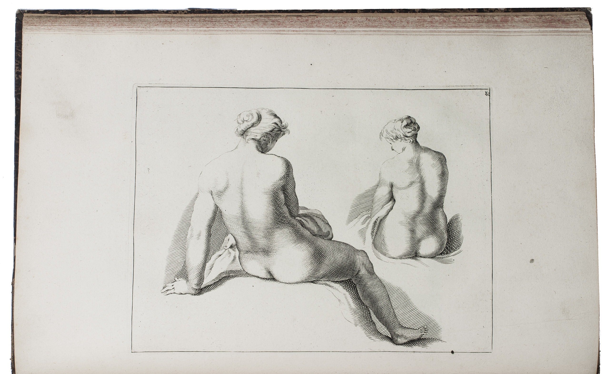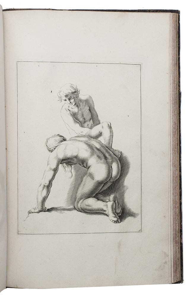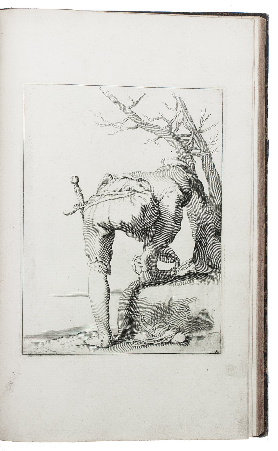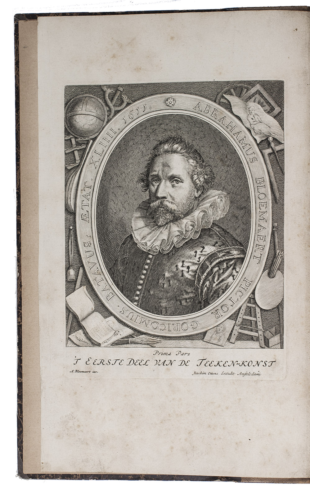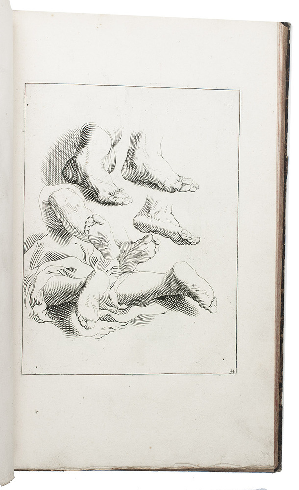 Amsterdam, Reinier & Joachim II Ottens, [ca. 1730]. Folio. With engraved frontispiece self-portrait of Bloemaert engraved by Joachim Ottens, here serving as no. [1] of 140 engraved plates with drawn models of parts of the human body, and human figures and characters in various postures, movements and scenes. Mottled half sheepskin (ca. 1840?). [1] leaf plus plates.