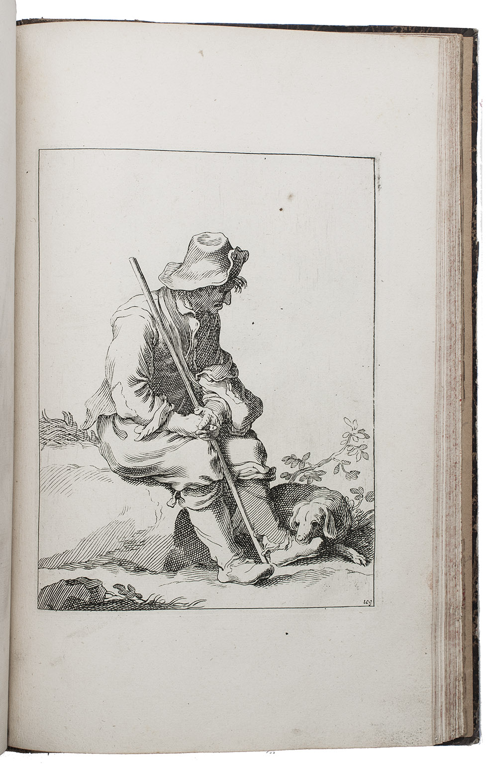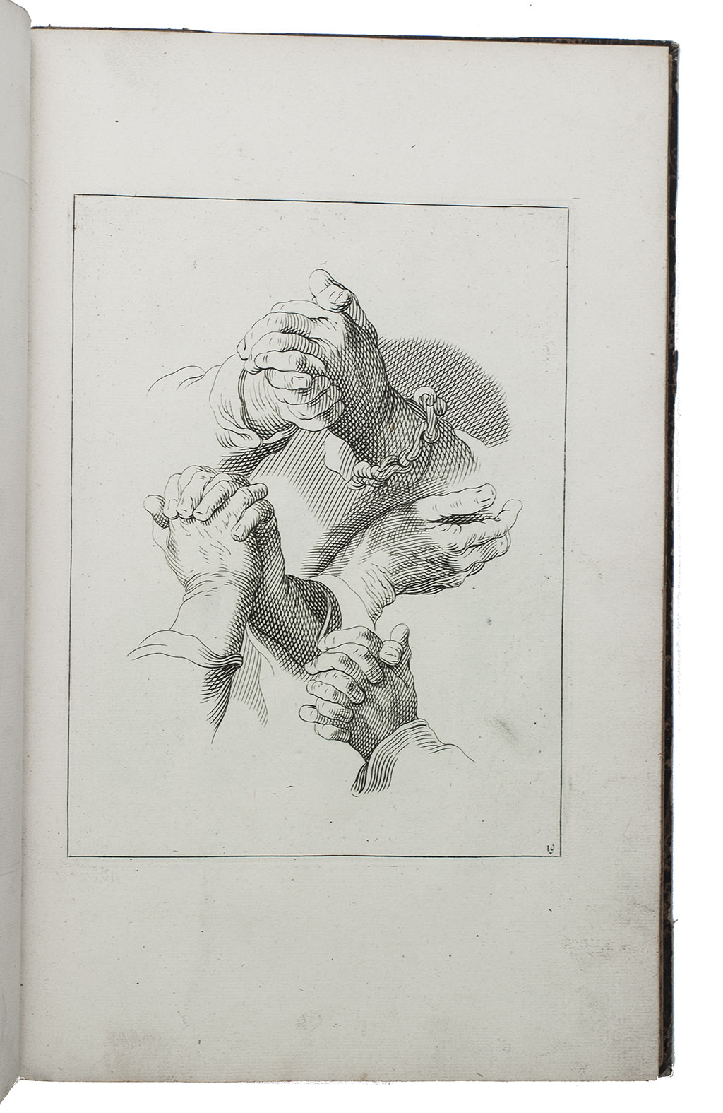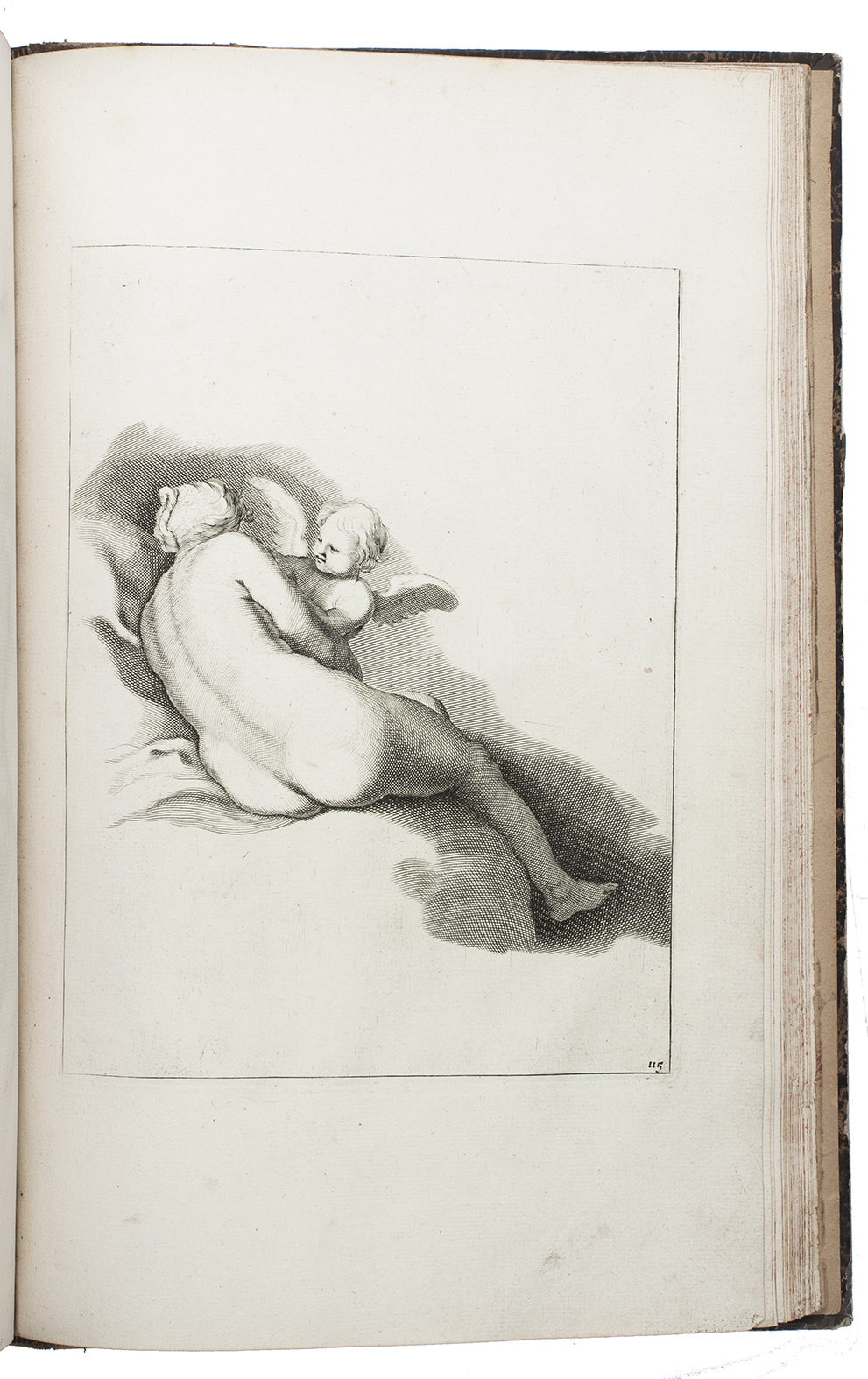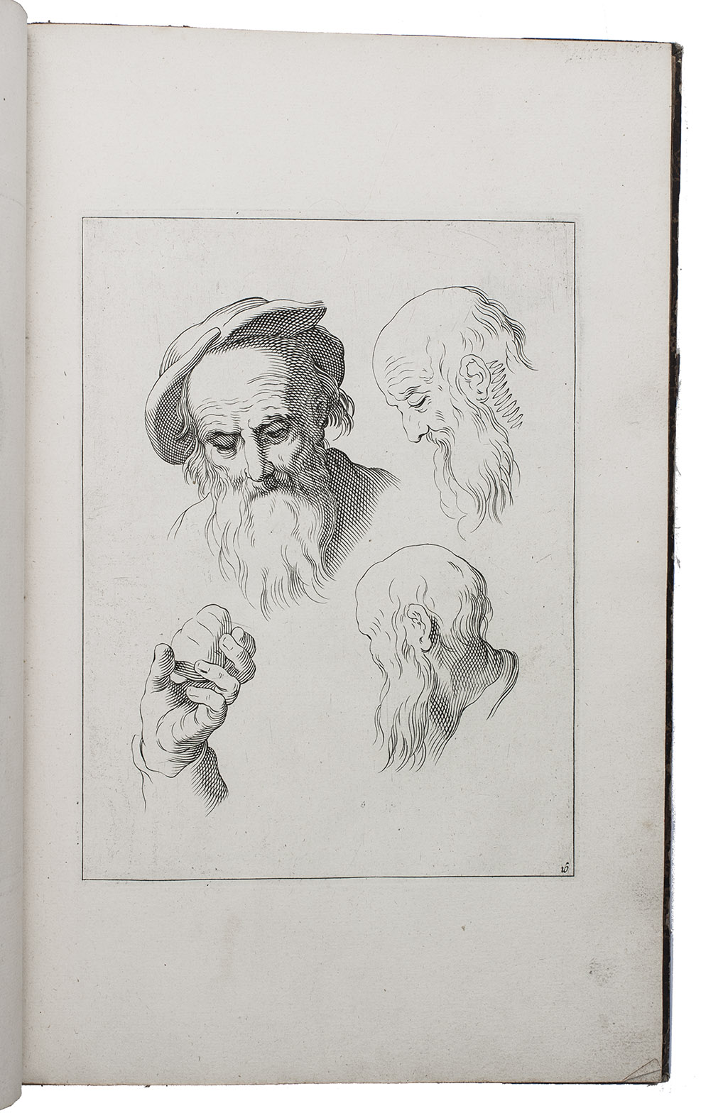 Amsterdam, Reinier & Joachim II Ottens, [ca. 1730]. Folio. With engraved frontispiece self-portrait of Bloemaert engraved by Joachim Ottens, here serving as no. [1] of 140 engraved plates with drawn models of parts of the human body, and human figures and characters in various postures, movements and scenes. Mottled half sheepskin (ca. 1840?). [1] leaf plus plates.