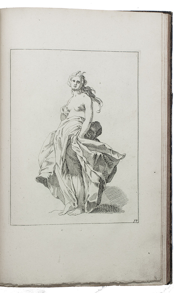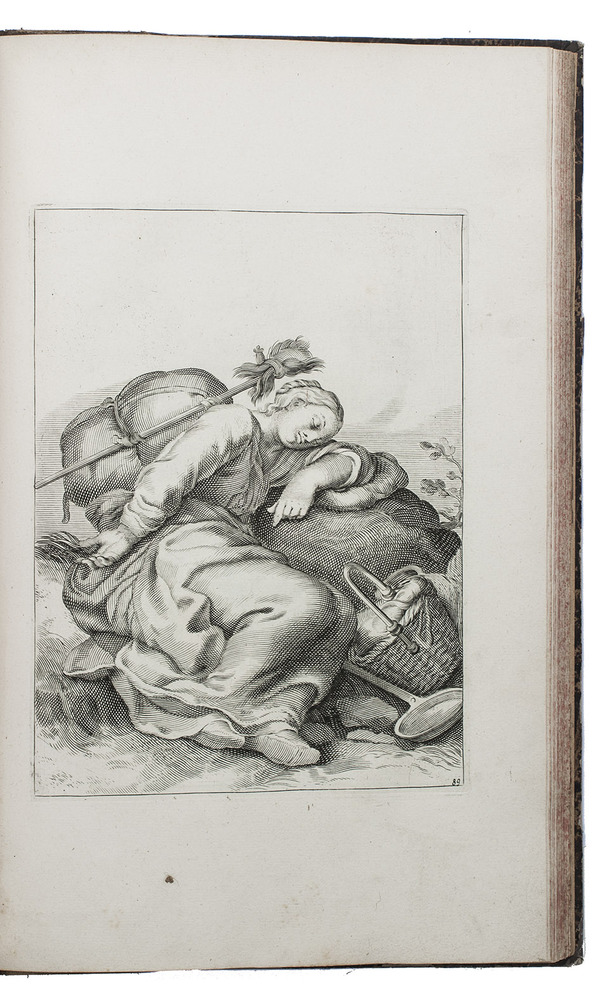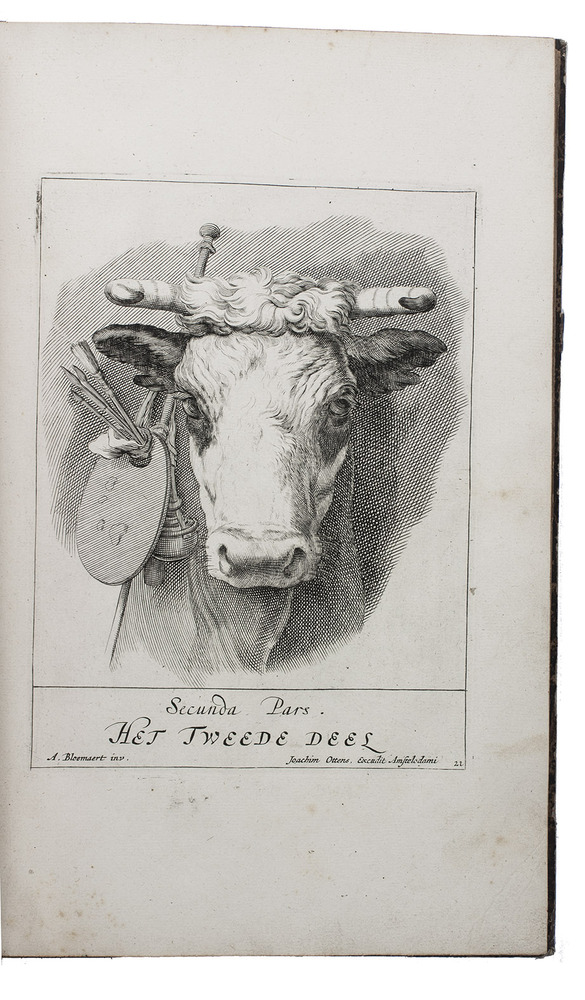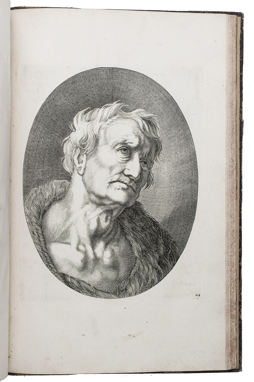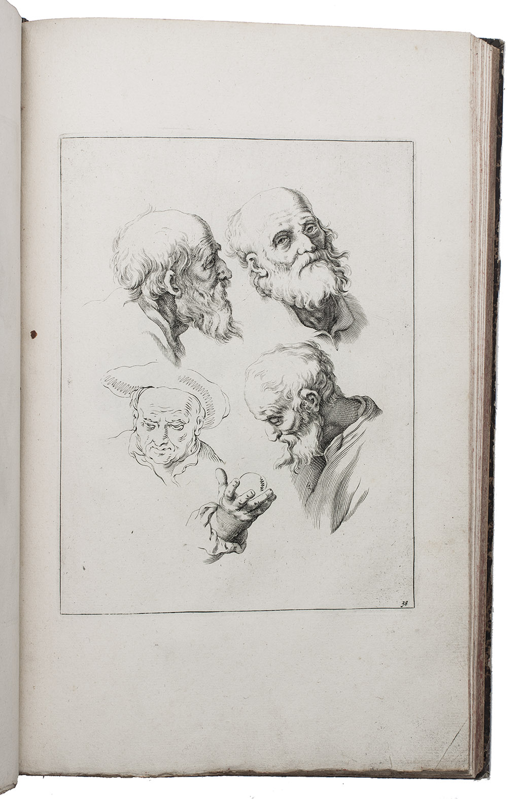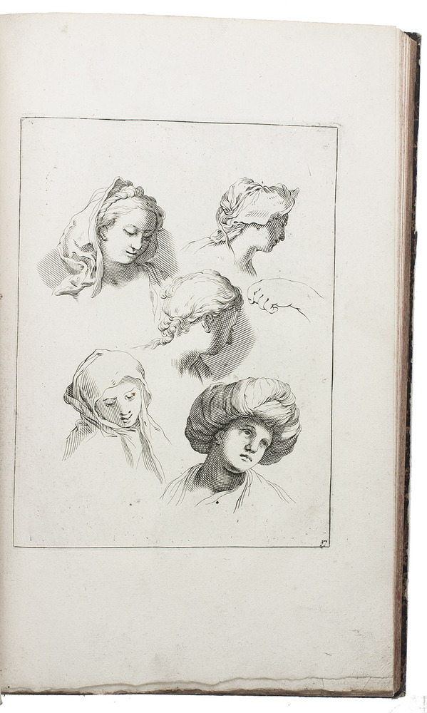 Amsterdam, Reinier & Joachim II Ottens, [ca. 1730]. Folio. With engraved frontispiece self-portrait of Bloemaert engraved by Joachim Ottens, here serving as no. [1] of 140 engraved plates with drawn models of parts of the human body, and human figures and characters in various postures, movements and scenes. Mottled half sheepskin (ca. 1840?). [1] leaf plus plates.