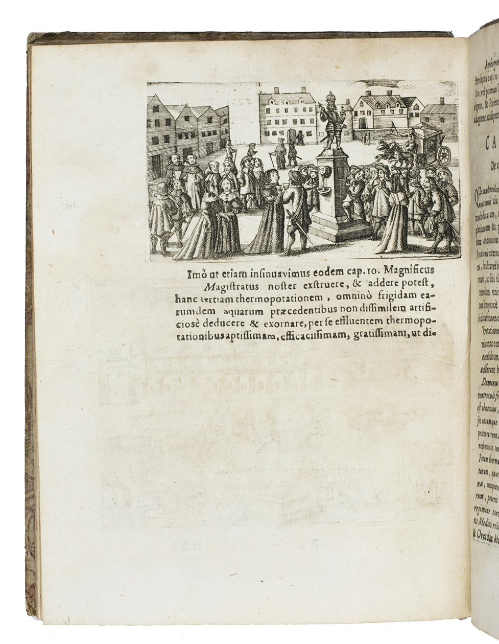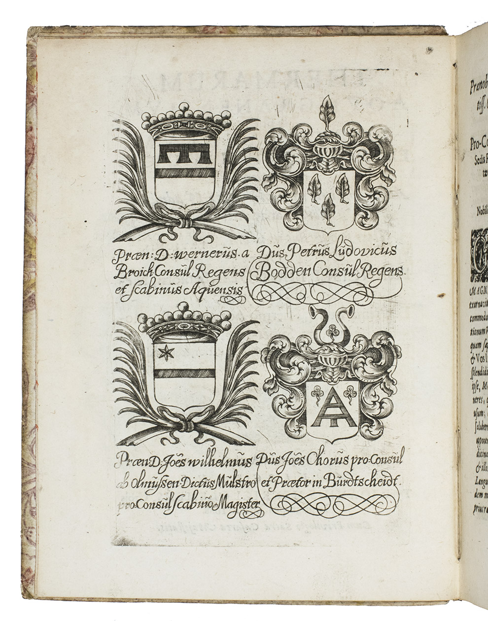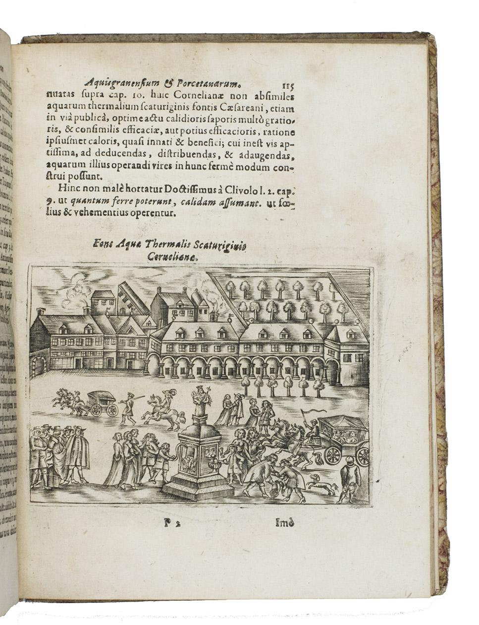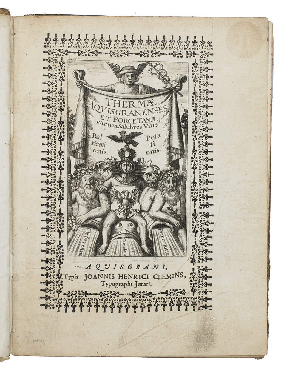 Aachen, Johann Heinrich Clemens, 1688. 4to. With an engraved frontispiece with letterpress imprint and built-up border, Aachen coat of arms pasted on back of frontispiece, engraved coats of arms of 4 dedicatees on back of title-page, full-page engraved portrait of the author, folding engraved plan of Aachen (22.5 x 27 cm), folding engraved view of Burtscheid (11.5 x 24 cm) and 16 smaller engravings in text, depicting scenes and buildings relating to the springs. Contemporary flower-decorated paper over boards, red sprinkled edges. [32], 160, [1], [1 blank] pp.