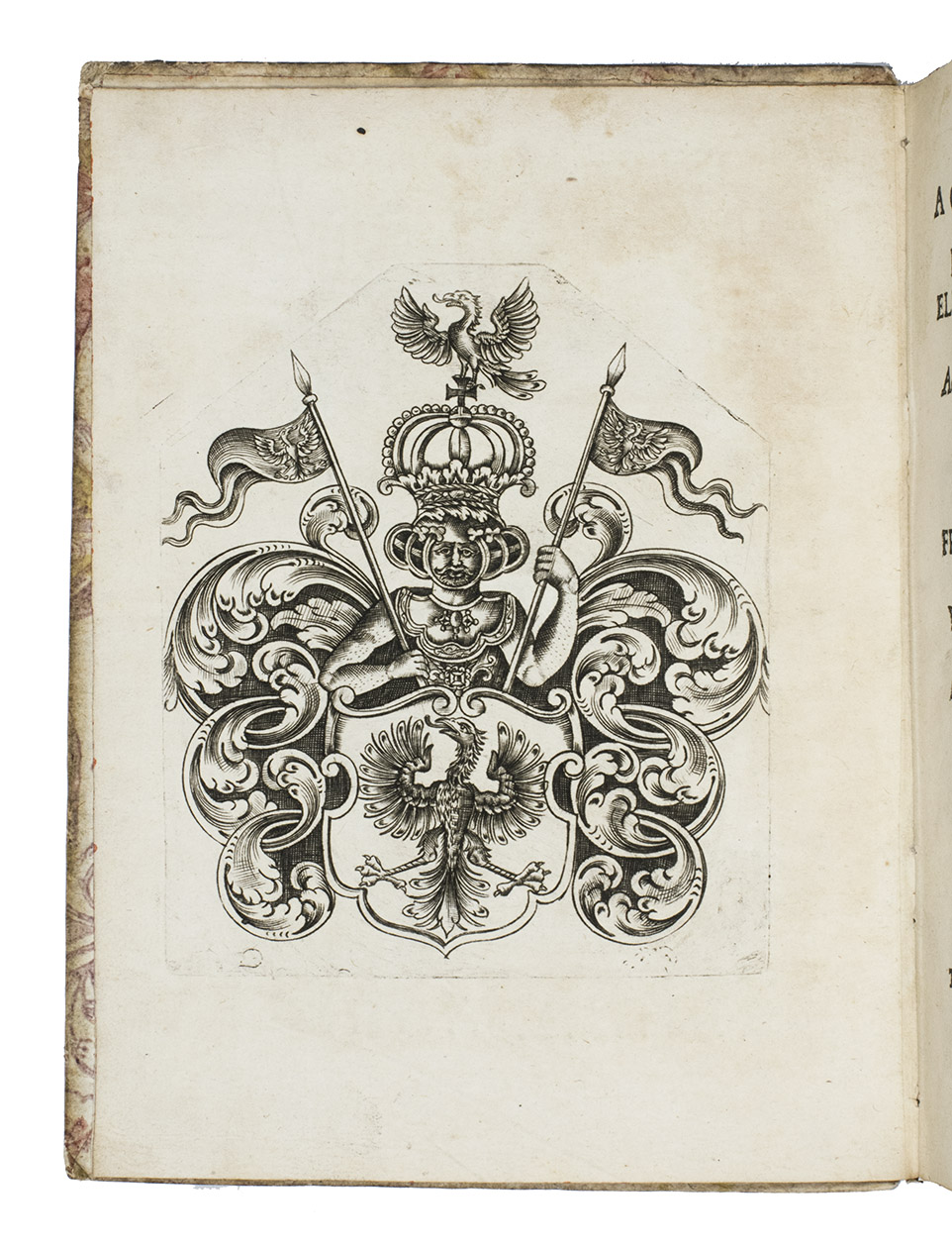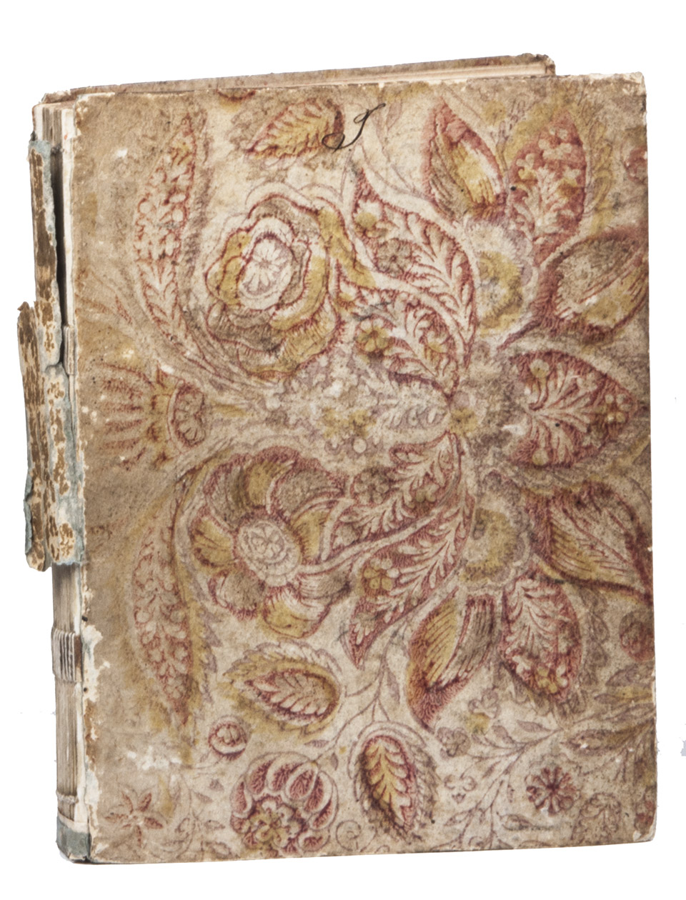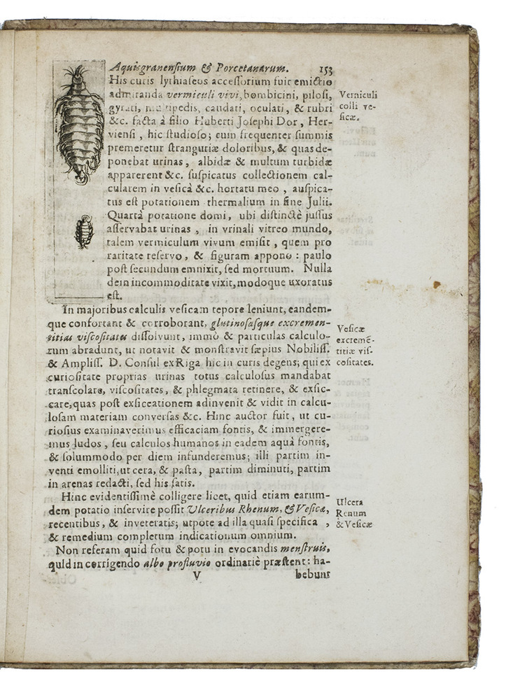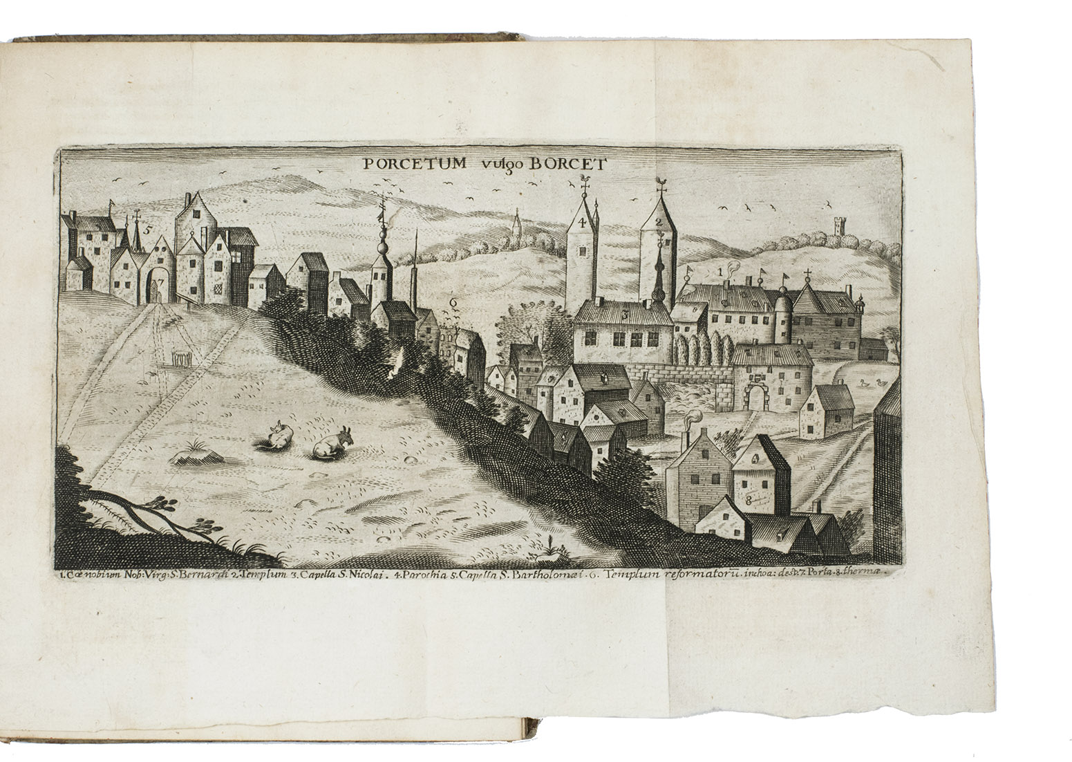 Aachen, Johann Heinrich Clemens, 1688. 4to. With an engraved frontispiece with letterpress imprint and built-up border, Aachen coat of arms pasted on back of frontispiece, engraved coats of arms of 4 dedicatees on back of title-page, full-page engraved portrait of the author, folding engraved plan of Aachen (22.5 x 27 cm), folding engraved view of Burtscheid (11.5 x 24 cm) and 16 smaller engravings in text, depicting scenes and buildings relating to the springs. Contemporary flower-decorated paper over boards, red sprinkled edges. [32], 160, [1], [1 blank] pp.