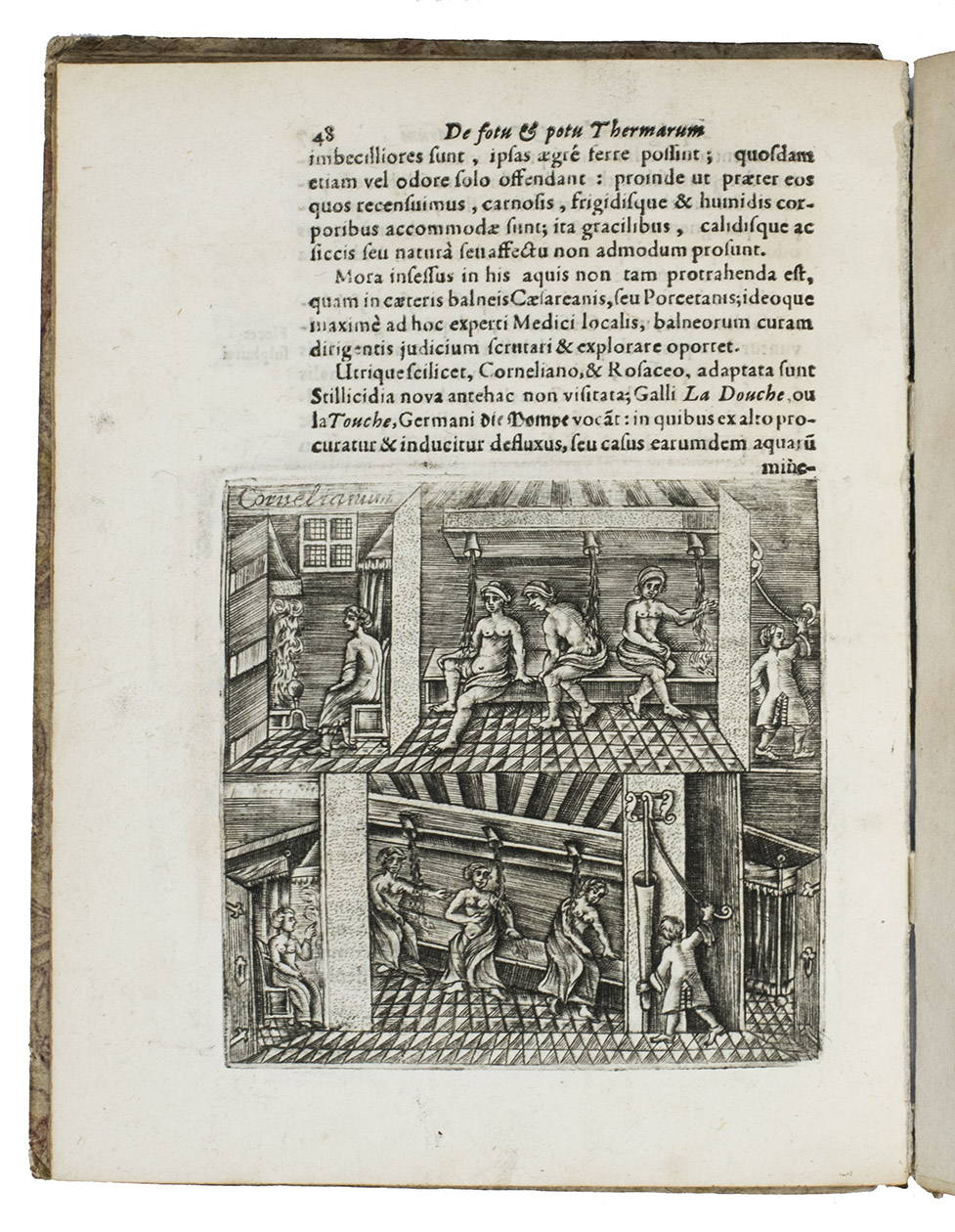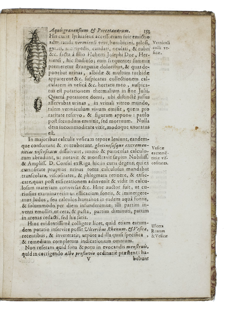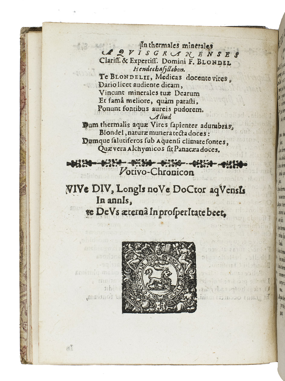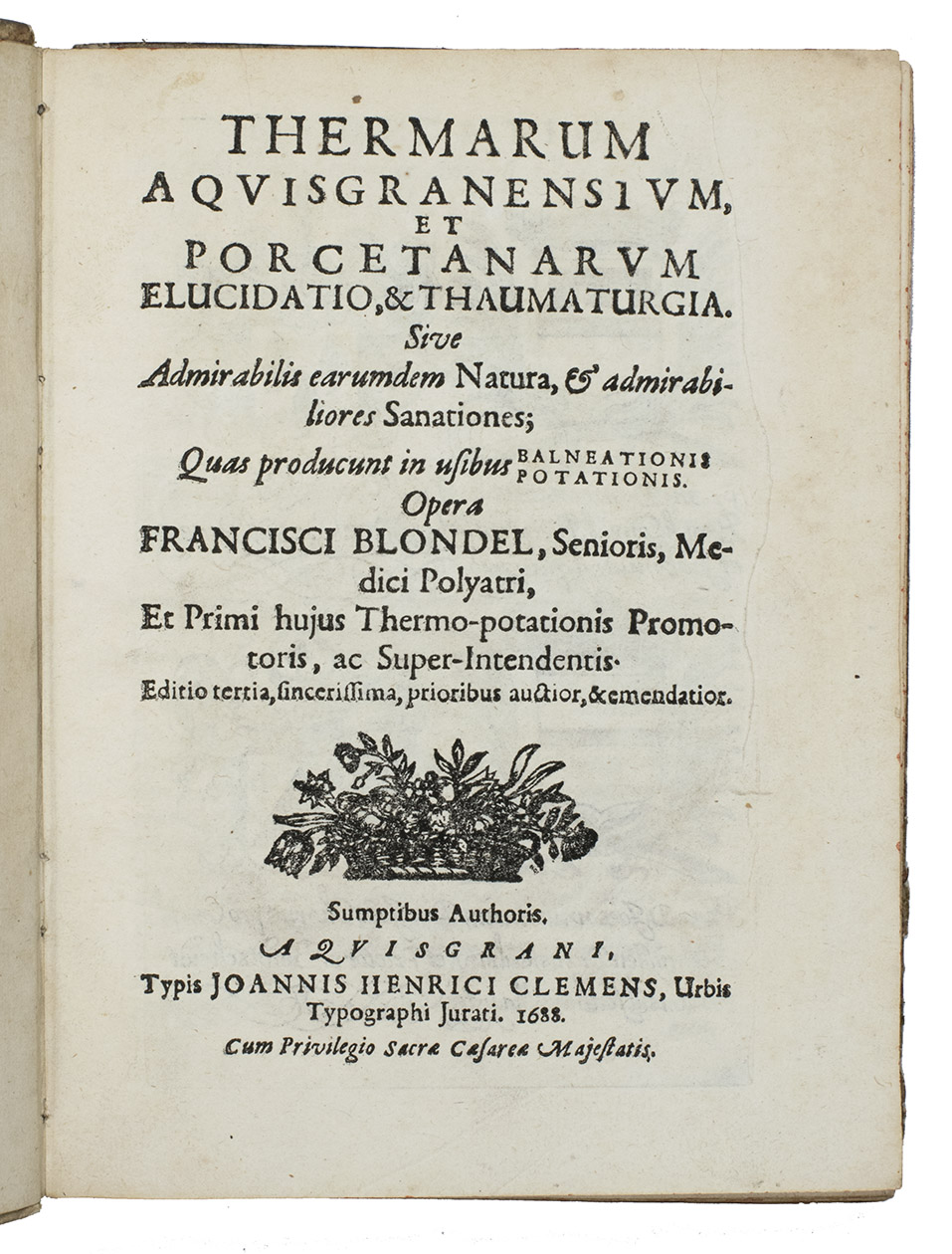 Third revised edition of Blondel's famous work on the composition and medicinal values of the sulphur springs in Aachen and Burtscheid. The Flemish doctor François Blondel (1613-1703), whose full-page engraved portrait is inserted after the table of contents, devoted his life to the promotion of the medicinal qualities of these springs. Since Roman times, the springs were known to provide relief against rheumatism, gout and scrofulous disorders. Blondel became inspector of the springs in 1666 and instituted a drinking course of the mineral water. Blondel's promotion of the springs also provided the city of Aachen, which suffered a major fire in 1656, with an important source of income.