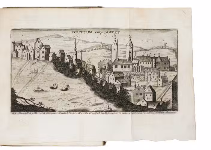 Aachen, Johann Heinrich Clemens, 1688. 4to. With an engraved frontispiece with letterpress imprint and built-up border, Aachen coat of arms pasted on back of frontispiece, engraved coats of arms of 4 dedicatees on back of title-page, full-page engraved portrait of the author, folding engraved plan of Aachen (22.5 x 27 cm), folding engraved view of Burtscheid (11.5 x 24 cm) and 16 smaller engravings in text, depicting scenes and buildings relating to the springs. Contemporary flower-decorated paper over boards, red sprinkled edges. [32], 160, [1], [1 blank] pp.