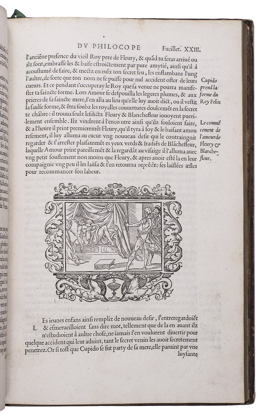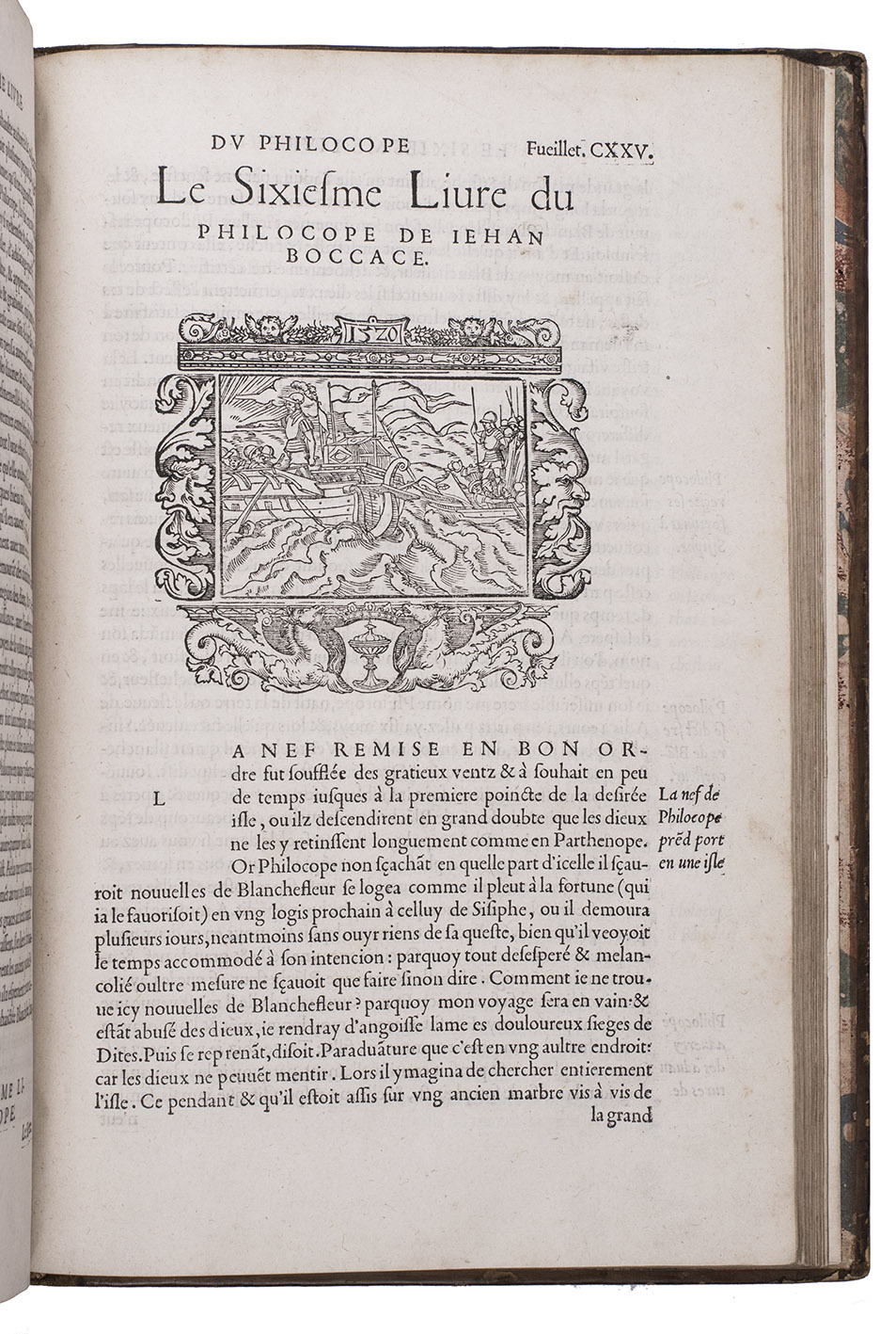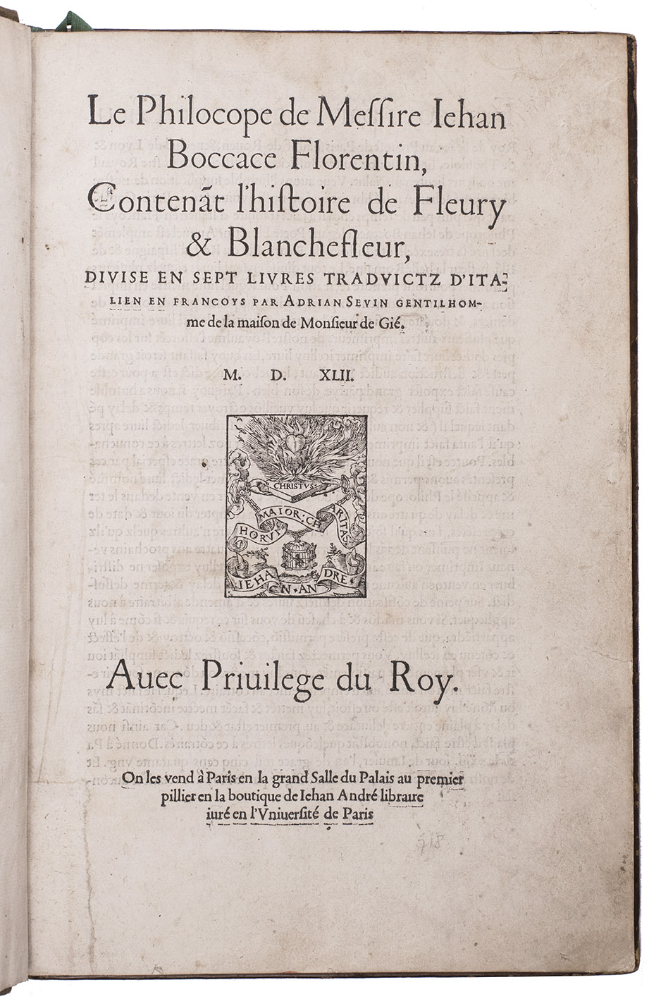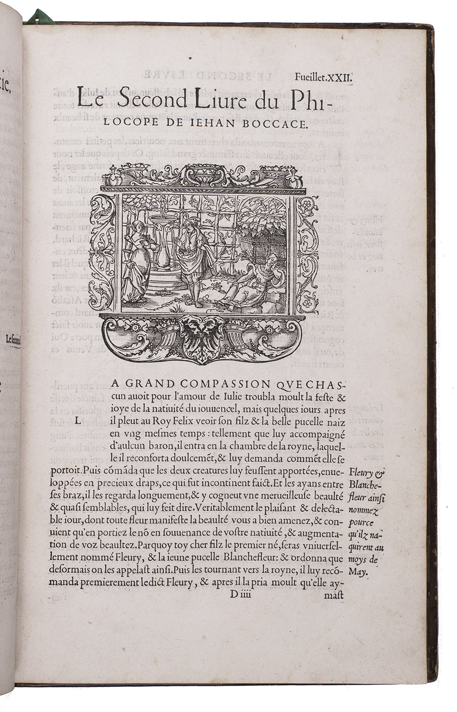 Jean André issue of the extremely influential first French-language edition (by Adrien Sevin) of Boccaccio's first major work, Il filocolo (ca. 1336), a prose tale detailing the romantic love and adventures of Florio and Biancafiore (based on the ca. 1160 French verse romance Floire et Blancheflor), written at the request of Boccaccio's muse "Fiammetta". Boccaccio's version served as the model for Chaucer's more than fifty years later, but it is a reworking rather than a translation, so it was largely through the present printed translation that Il philocope, a precursor of the better known Decameron, became known north of the Alps. The fine woodcut illustrations first appeared in Janot's 1540 edition of Amadis de Gaula, and after the Philocope also for several other romances. The borders used with them in these works are apparently older, for two of the head borders are dated 1520.