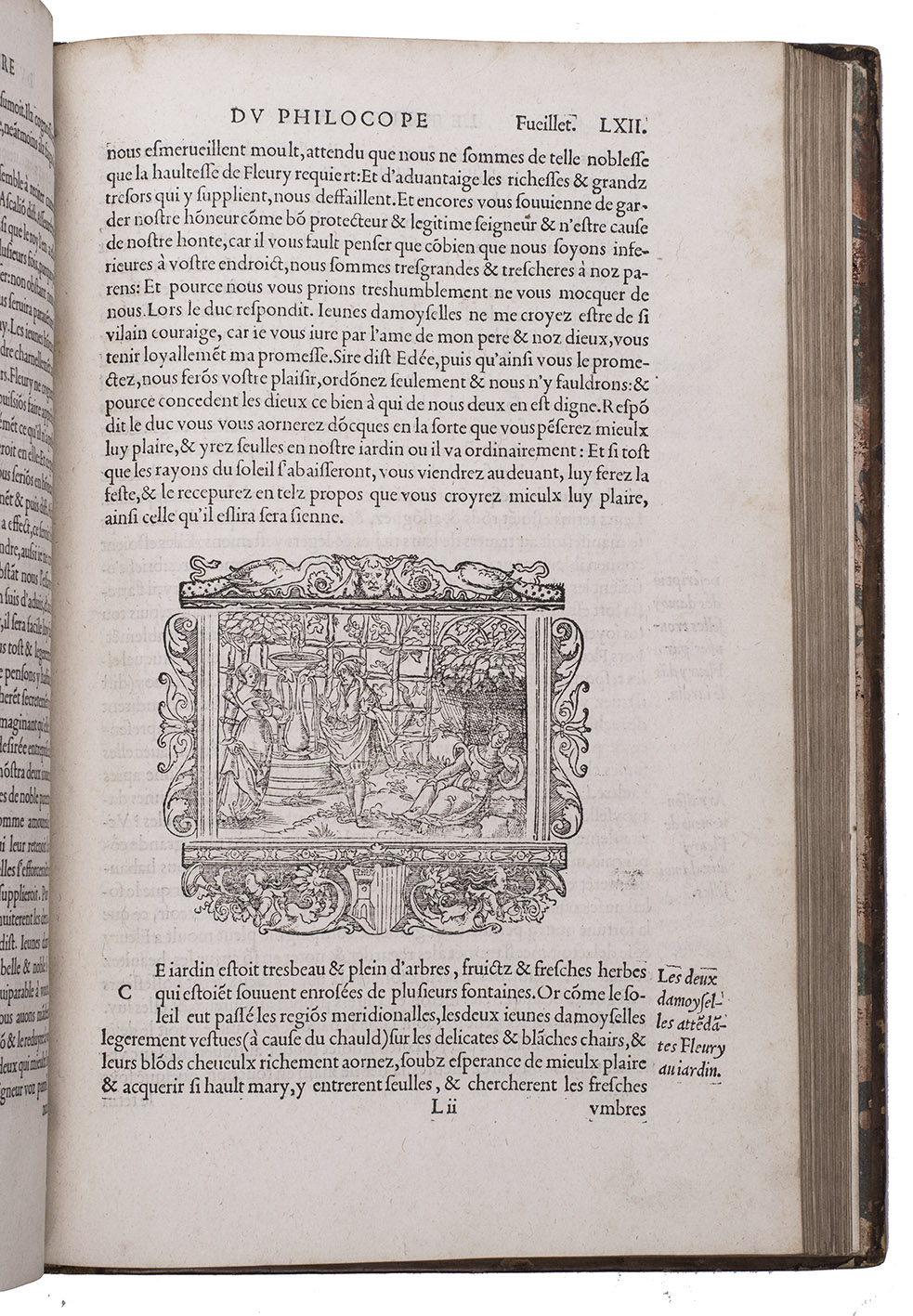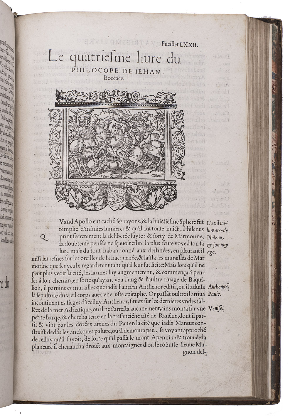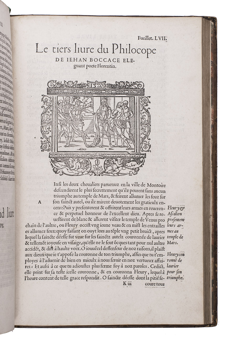 Jean André issue of the extremely influential first French-language edition (by Adrien Sevin) of Boccaccio's first major work, Il filocolo (ca. 1336), a prose tale detailing the romantic love and adventures of Florio and Biancafiore (based on the ca. 1160 French verse romance Floire et Blancheflor), written at the request of Boccaccio's muse "Fiammetta". Boccaccio's version served as the model for Chaucer's more than fifty years later, but it is a reworking rather than a translation, so it was largely through the present printed translation that Il philocope, a precursor of the better known Decameron, became known north of the Alps. The fine woodcut illustrations first appeared in Janot's 1540 edition of Amadis de Gaula, and after the Philocope also for several other romances. The borders used with them in these works are apparently older, for two of the head borders are dated 1520.