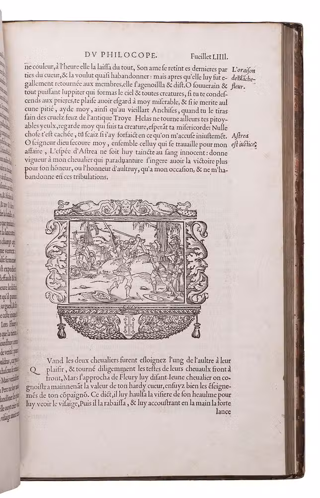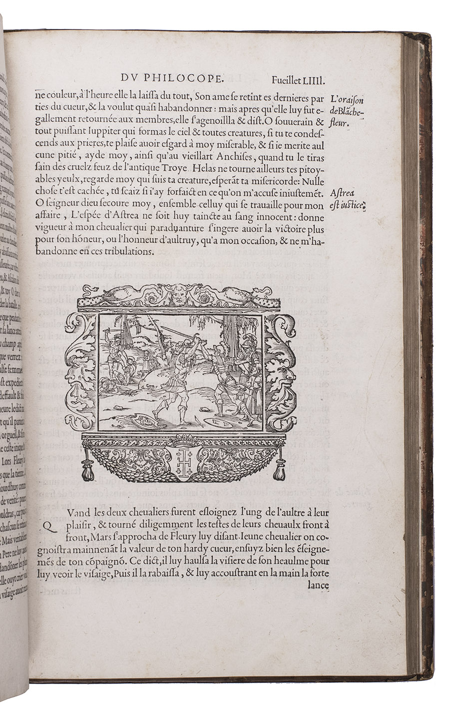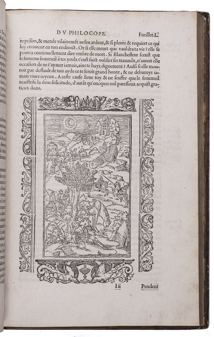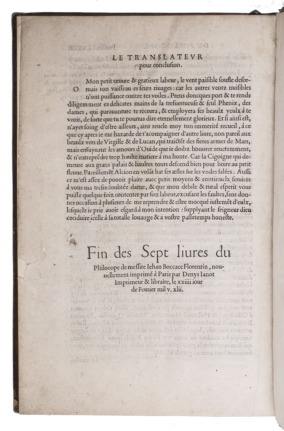 Jean André issue of the extremely influential first French-language edition (by Adrien Sevin) of Boccaccio's first major work, Il filocolo (ca. 1336), a prose tale detailing the romantic love and adventures of Florio and Biancafiore (based on the ca. 1160 French verse romance Floire et Blancheflor), written at the request of Boccaccio's muse "Fiammetta". Boccaccio's version served as the model for Chaucer's more than fifty years later, but it is a reworking rather than a translation, so it was largely through the present printed translation that Il philocope, a precursor of the better known Decameron, became known north of the Alps. The fine woodcut illustrations first appeared in Janot's 1540 edition of Amadis de Gaula, and after the Philocope also for several other romances. The borders used with them in these works are apparently older, for two of the head borders are dated 1520.