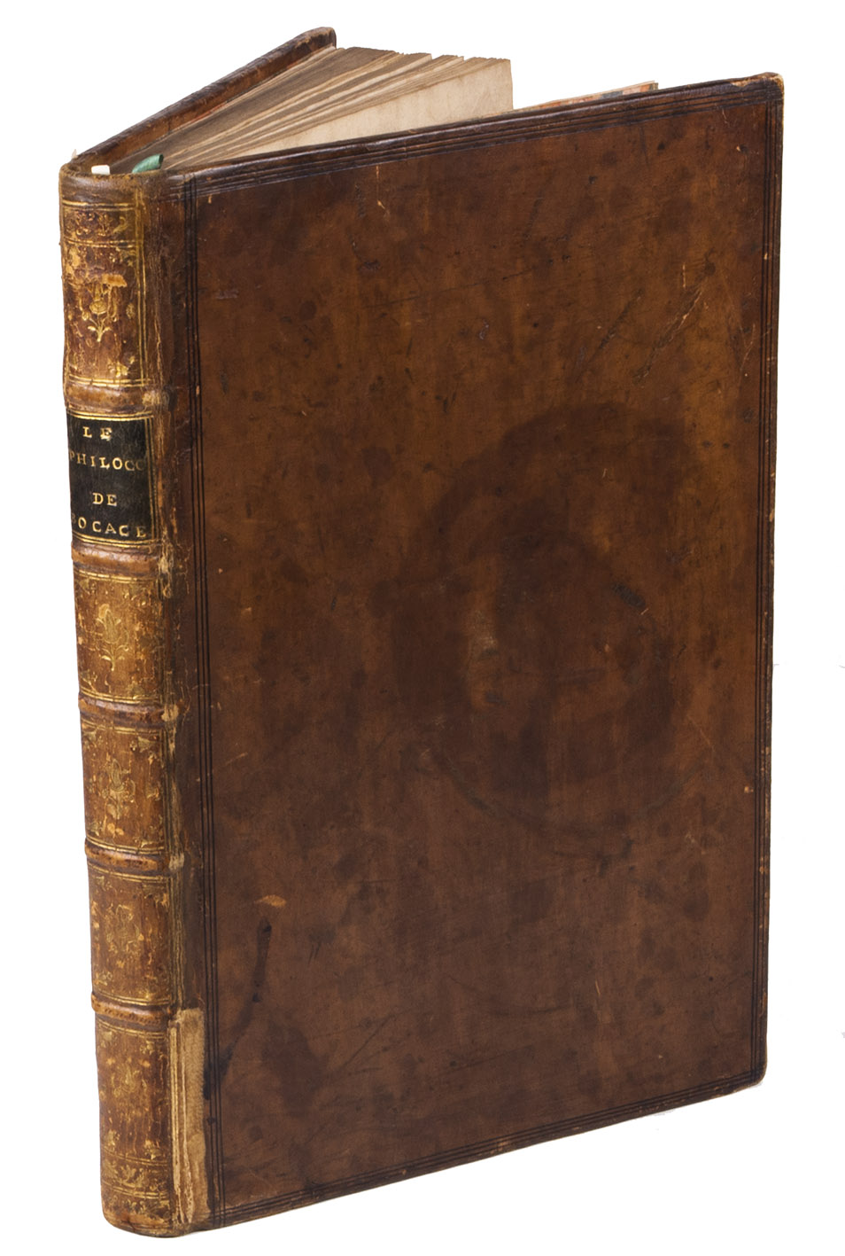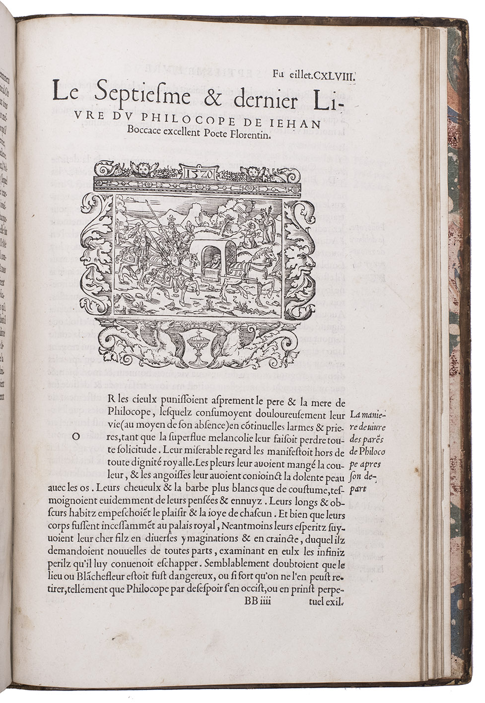 With the small letterpress bookplate and the armorial bookplate of Charles Bouchelet de Vendegies, Comte d'Hust (1772- 1851), and a later bookplate of the Swiss collector Albert Natural. With a few mostly marginal defects and early repairs, but with three repaired tears in the text (one also in a woodcut, but so skilfully repaired that it is barely visible in the woodcut). One of the repeated woodcuts has a small abrasion. Otherwise in good condition. The binding has restorations to the hinges and corners and the spine shows some superficial cracks and flaking, but nearly all of the tooling remains clear. The very influential first French edition of Boccaccio's first major work, with excellent woodcut illustrations. BMC STC French, p. 71 (Janot issue); Brun, Le livre français illustré, p. 158; Mortimer (French) 105 (Janot issue); Rawles, Denis Janot ... (1976 PhD thesis) 164; Renouard, Imprimeurs Parisiens 155; USTC 37796 & 92444 (8 copies; see 37799, 65503 & 92444 for the other issues); cf. Adams B2169-2171 (Italian eds.).