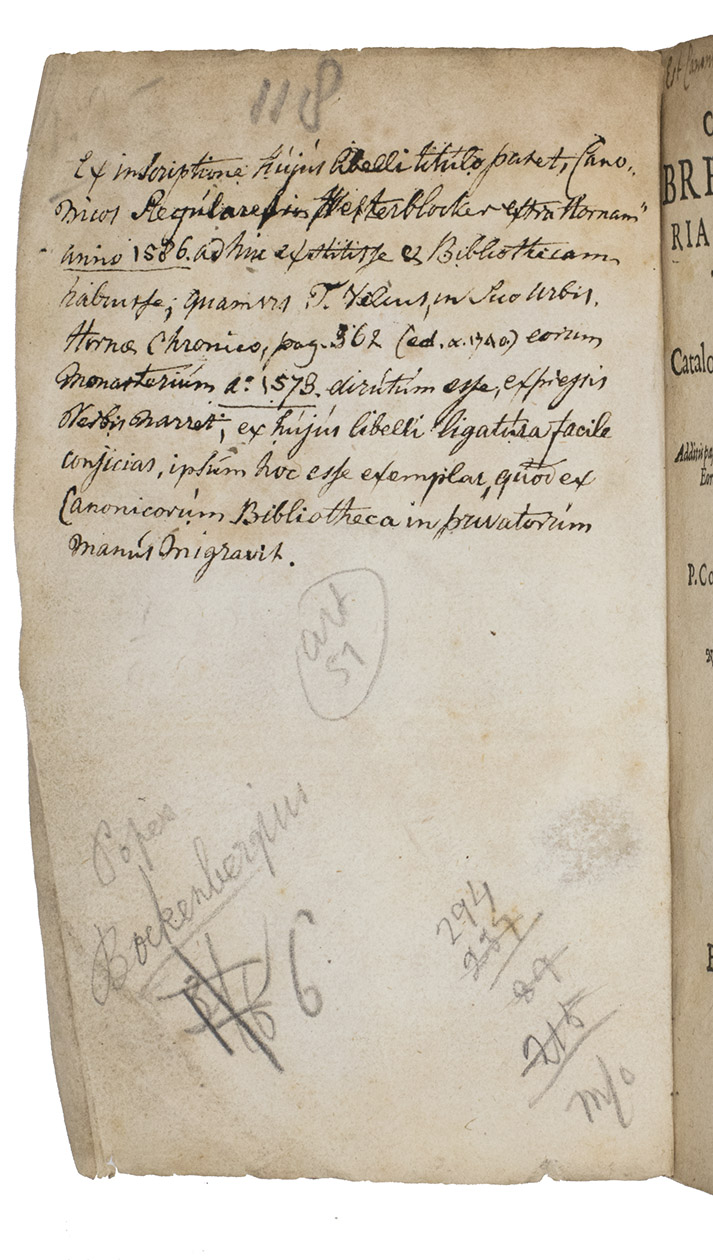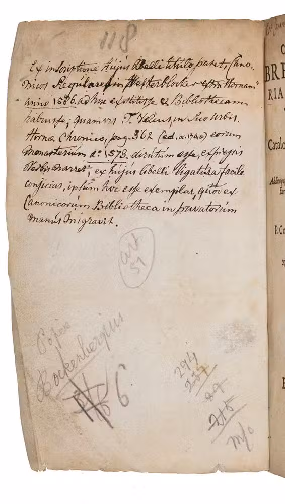 With a very interesting provenance: owner's entry on the title: 'Est Canonicarum Regularium in Wester-Blockero extra Horna'. The book belongs to the Regular Canons at Westerblokker near Hoorn, c. 40 km. north of Amsterdam. A 19th-century annotation on the verso of the front wrapper justly points out that this monastery - called 'Nieuwlicht' (Nova Lux), founded in 1388 - was demolished in 1573 (referring to Velius' history of Hoorn, p. 362). The author of the annotation suggest therefore that the library of this rich monastery must have been continued afterwards.