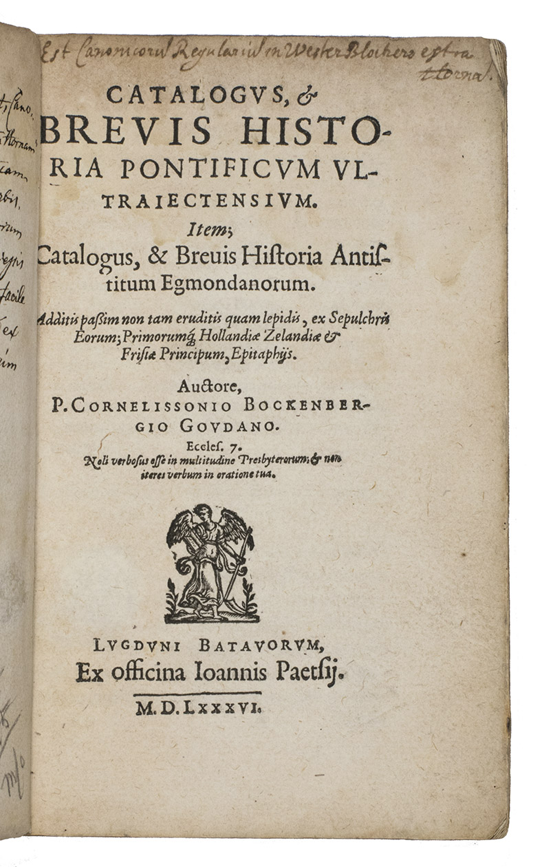 First and only edition of this historical work on the Utrecht Diocese and on the abbots and priests of the most important medieval monastery in Holland, the Monastery of Egmont in the northern part of Holland by the Dutch historiographer Pieter Cornelisz. Bockenberg Goudanus (Gouda 1548-1617 Leiden). He wrote a history of Holland but came under attach of Janus Douza who had just written a history on the same subject. Through Johan van Oldenbarneveld Bockenberg was officially appointed Dutch historiographer in 1591.