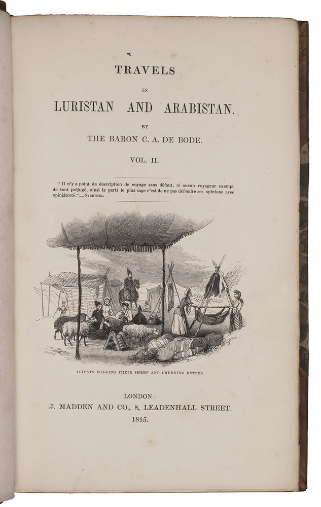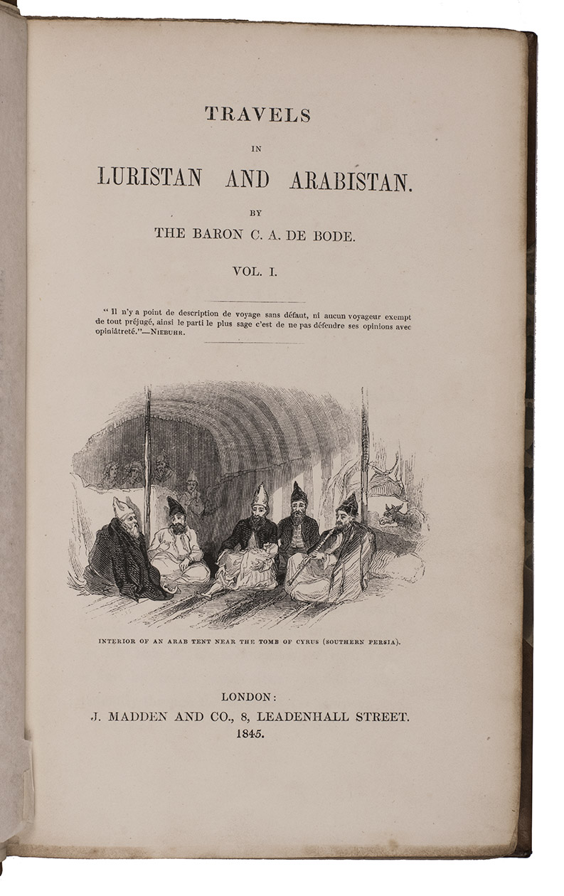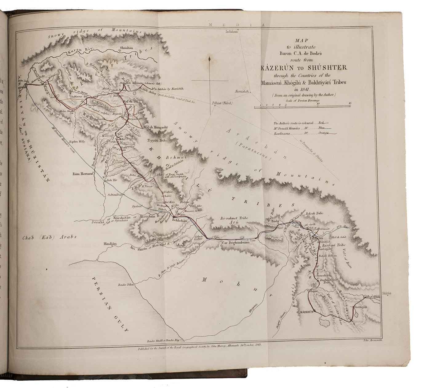 First edition of an important travelogue on Persia, giving detailed accounts of its history, antiquities and archaeological sites. It was written by Clement August de Bode, member of the Russian legislation at Tehran