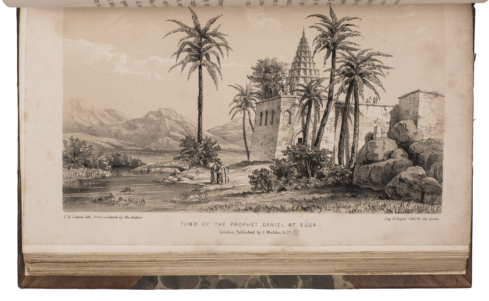 London, J. Madden and Co., 1845. 2 volumes. 8vo. With a wood-engraved illustration on the title-page to each volume, 15 plates, 2 folding engraved maps and 3 wood-engraved illustrations in text. The 15 plates (4 tinted lithographs and 11 wood engravings) consists of 2 frontispieces, a folding plate, a double-page plate and 11 single-page plates. Modern half calf, marbled (Period Binders, Bath, England). XX, 404; XII, 398, [1], [1 blank] pp.