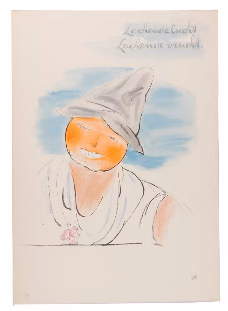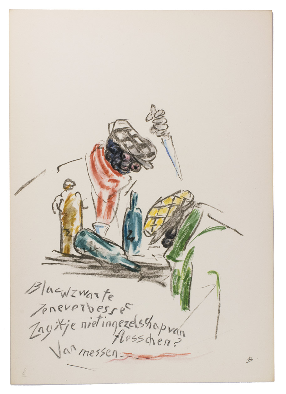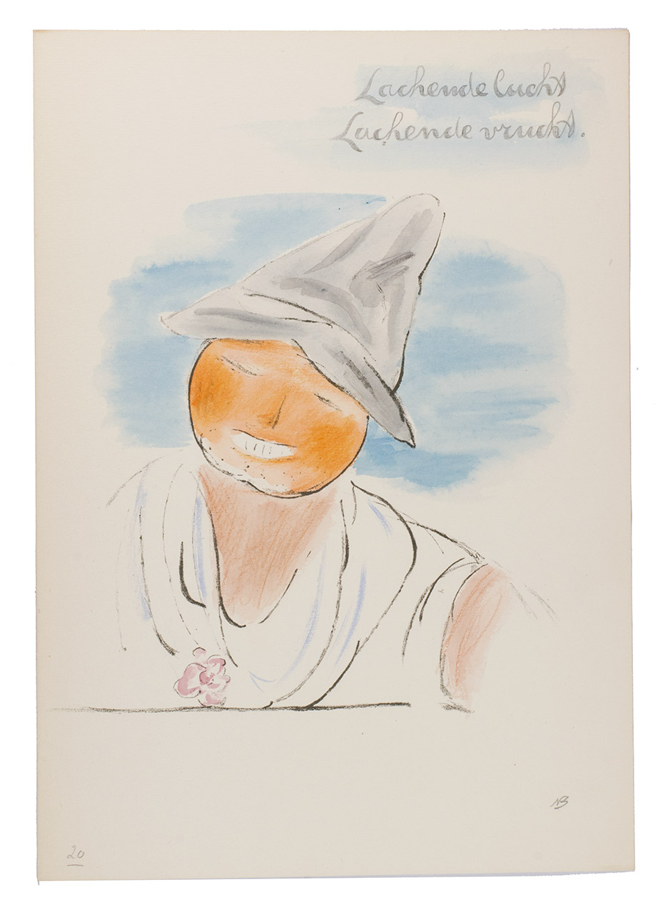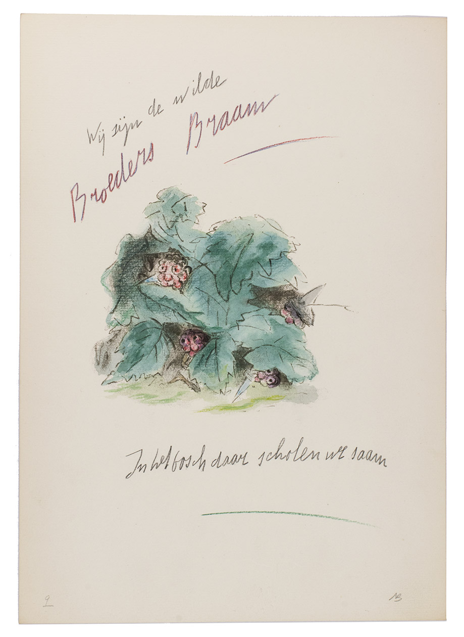 Limited edition - no. 1 of 7 - of the rarer portfolio edition of a remarkable early 20th-century illustrative work by the renowned Dutch artist and illustrator of children's books Nelly Bodenheim. The present work contains the short rhymes (verses) by Lizzy Ansingh, together with the strinking colourful and humoristic illustrations of anthropomorphic fruits,nuts, and vegetables - including lemons, grapes, a pear, radishes, a red pepper, almonds, blackberries, apricots, cherries, and a leek.
