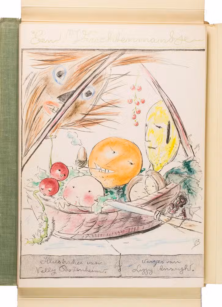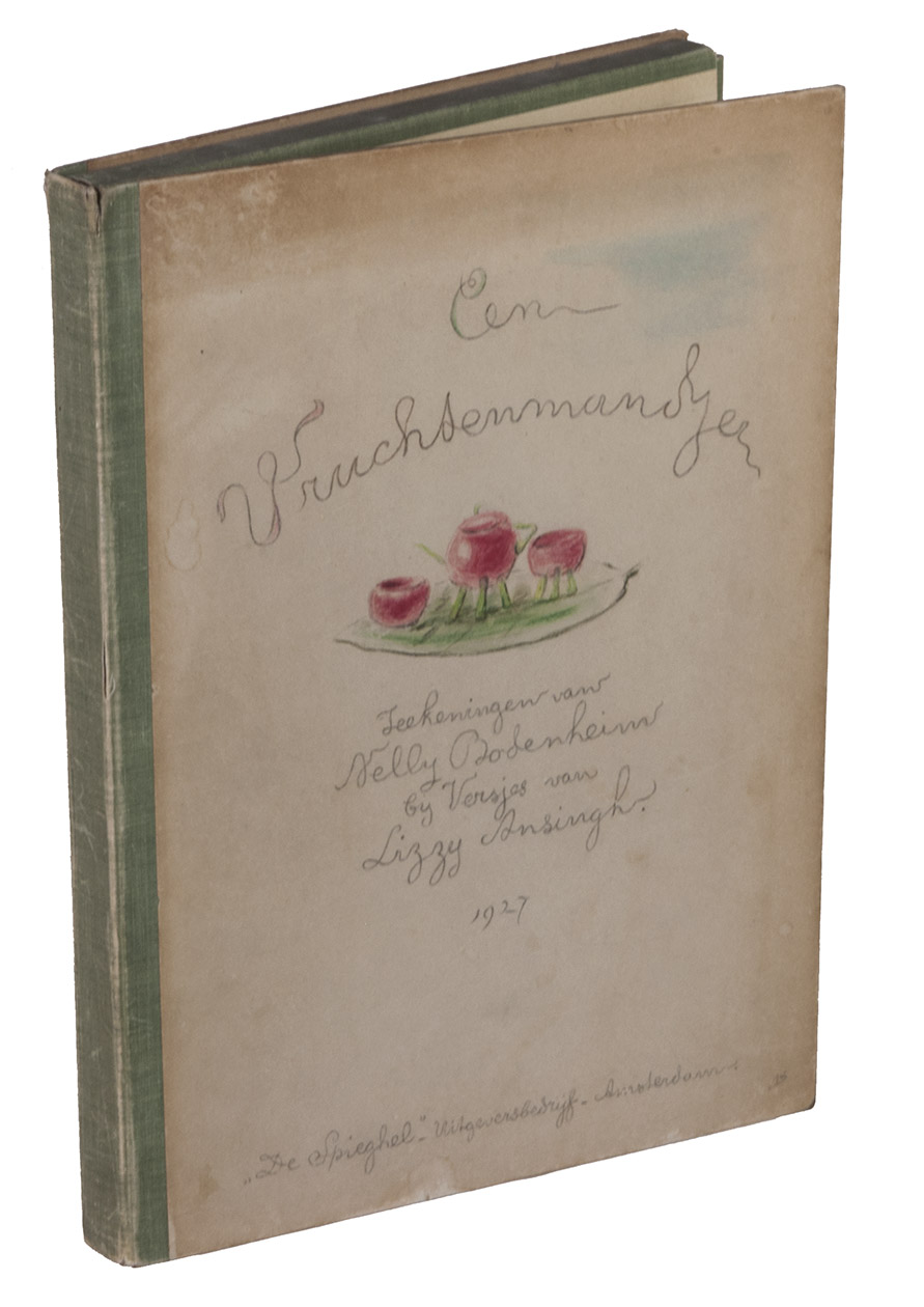 Amsterdam, De Spiegel, 1927. Folio (ca. 30 x 21.5 cm). All illustrations, including the illustrated front board, are lithographs designed by the illustrator herself on stone and coloured by hand by her as well. The verses by Lizzy Ansingh are written, in colour, by hand in a decorative, ornamental script (varying in style). Contemporary half green cloth portfolio with the original lithographed illustration on the front board, the back board contains the following verse: "Let op de pitten, die binnen in zitten". [1 blank], [24] ll.