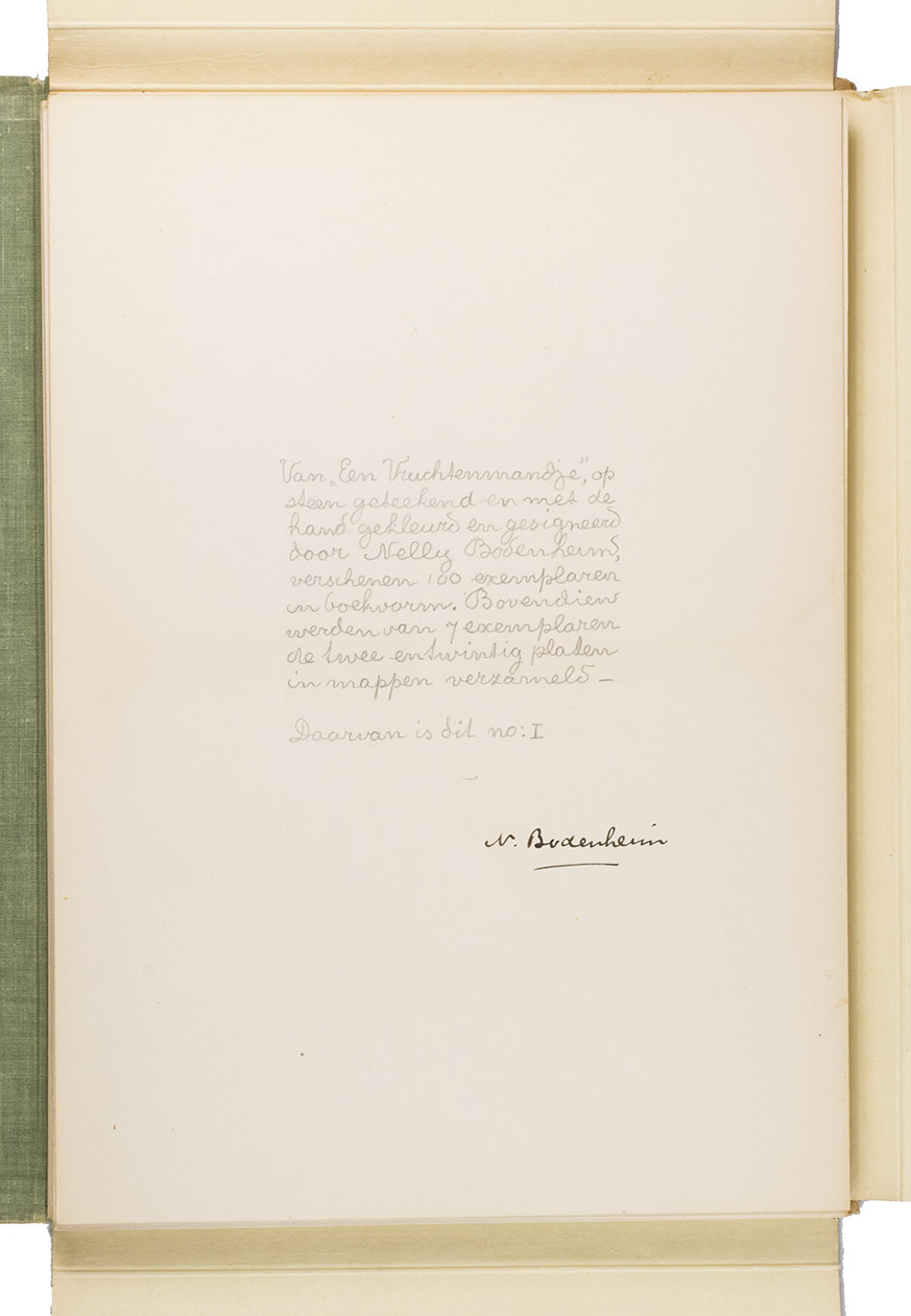 The present work is beautifully illustrated with hand-coloured lithographs designed by Bodenheim, the verses by Ansignh are written in decorative, ornamental script in varying styles. While the work is by definition rare, as it is a limited edition, this edition is even rarer as it presents the 22 plates loose in a portfolio - of which only 7 copies exist. Additionally, WorldCat records only 4 copies of this title (mainly the book form, of which 100 copies were made) that are held institutionally (3 in the Netherlands and 1 in the USA) and it only very rarely appears on the market (Rarebookhub finds only 5 records for the last 100 years).