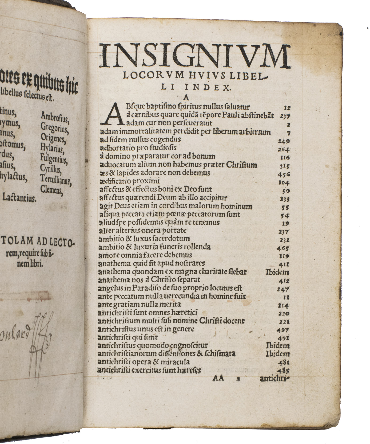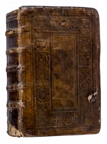 With early owners inscriptions on the title page and its verso, as well as on the final pastedown, including the name Franciscus Soulard. The title page bears a partly legible ownership inscription ("ex joannu antecessoria et fisco liber ... advocat"), with a further inscription entirely crossed out; the verso of the title page is inscribed ("Soulard..."). Further with occasional marginal annotations, the text is ruled in ink throughout. The spine and corners show damage and wear, with minor staining. Otherwise in good condition. BM STC German p. 134; Kronenberg, "Het Boek", 34, (1960/61), pp. 1-11; NUKAT xx001538065; Peters, "Who Compiled the Sixteenth-Century Patristic Handbook Unio Dissidentium?", Studies in Church History, 2, (1965), pp. 237-250; USTC 701804; not in Adams.