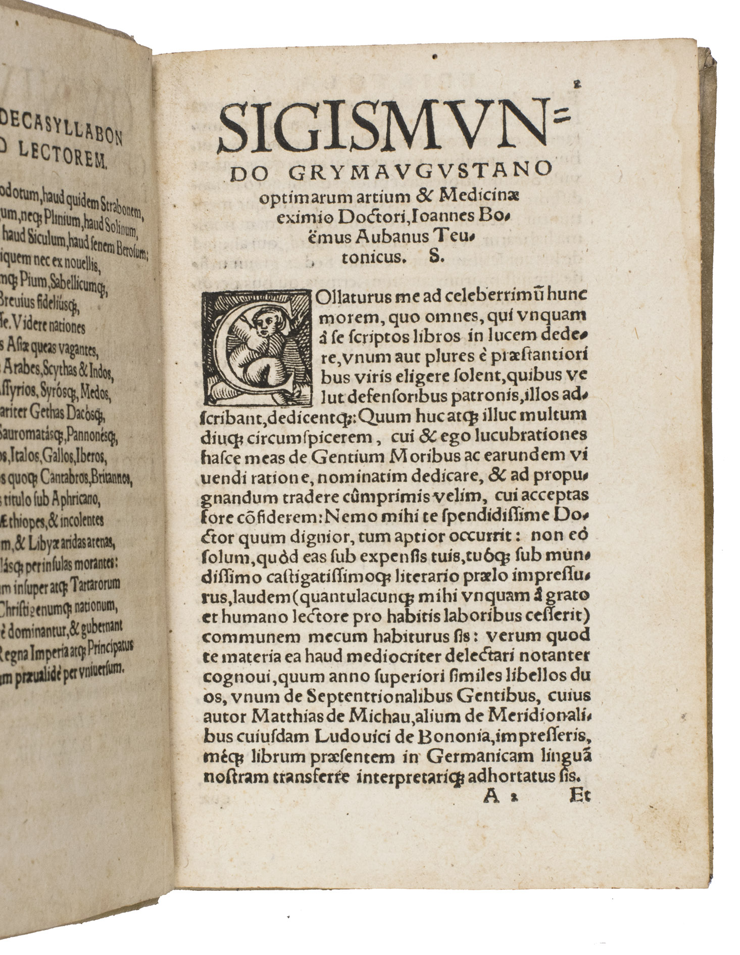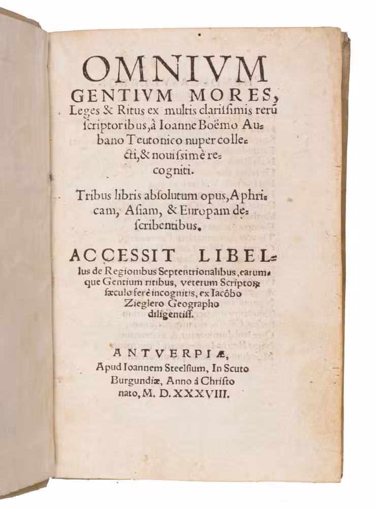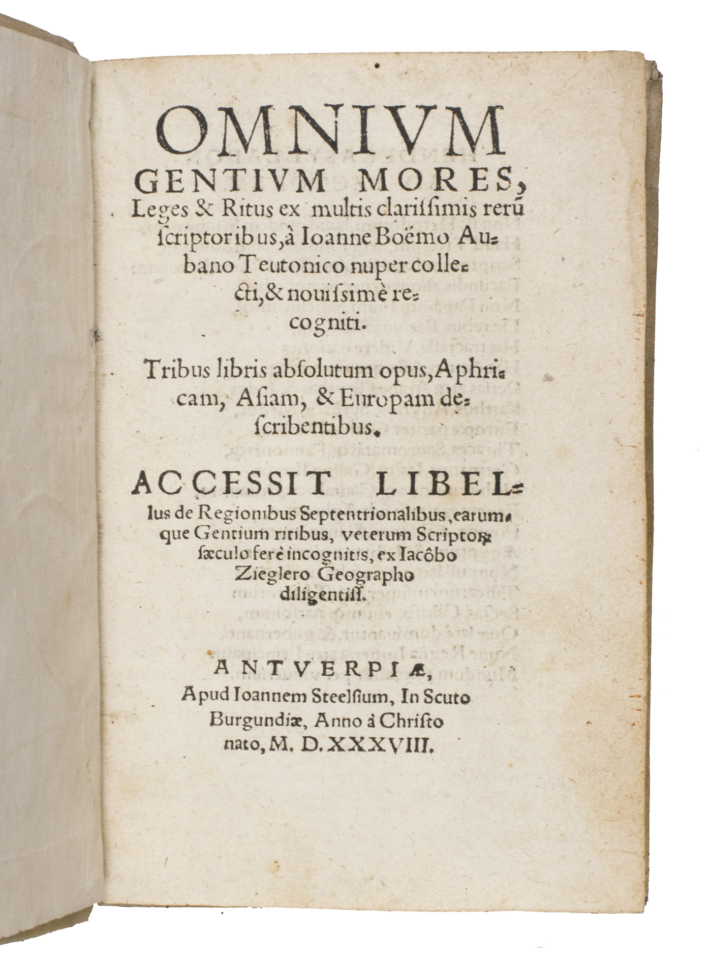 Second Antwerp edition of one of the most pioneering and influential foundational works of early modern anthropology, first published at Augsburg in 1520. Johann Boemus (1485-1535), often described as the "father of scientific ethnography", here produced the first printed compendium of the religions, laws, and customs of the peoples of Africa, Asia, and Europe, a work that would shape European perceptions of cultural differences for more than a century.