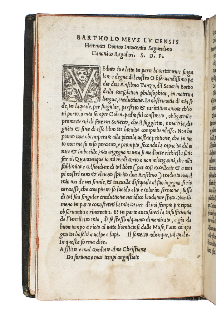 The present work is the third Italian edition, but the first printed by Melchior Sessa. The translation as made by friar Anselmo Tanzo (dates unknown), a Canon Regular at Milan. The first edition was published in Milan by Agostino de Vicomercato for Bernardino Tanzo (a relative of Anselmo) in 1520; the second edition appeared also in Venice with Giovantinio & fratelli da Sabio in 1527. On the title of our edition (also present in the first and second editions) a sonnet by Anselmo Tanzo has been printed. On the verso of the title starts a letter of Bartholomeus Lucensis to the Canon regular Innocentius Sagundinus, dated 21 December 1515, followed on fol. A2verso by a letter of the translator to his brother Giovan Jacobo Tanzo.