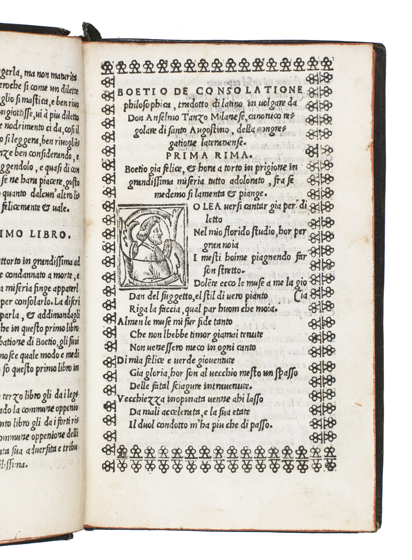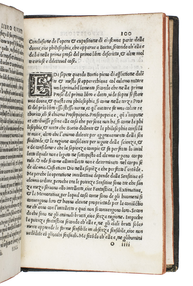 First Italian translation of Boethius' (ca.480-ca.524), most important work, bound for a member of the House of Caetani (or Gaetani), an Italian noble family. Written in the form of a dialogue between the author and the female personification of philosophy, the work discusses the capriciousness of fortune, the influence of good and evil, and the nature of God's control over the universe. As it fit within Christian doctrine, it was approved by the Church, and became immensely influential throughout the Middle Ages. It was already translated into German, French, Italian, Spanish and Greek before the end of the fifteenth century.