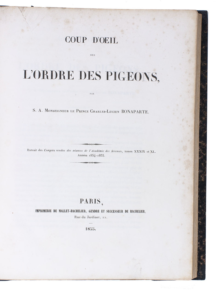 Coup d'oeil sur l'ordre des pigeons. Paris, 1855.
