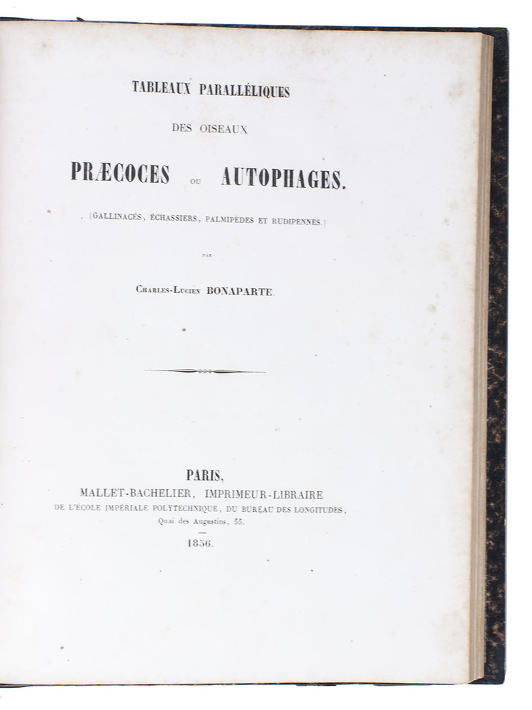 Paris, Mallet-Bachelier, 1855-1856. 4to. 7 parts in 1 volume. With a collective title-page for several of the offprints: Tableaux paralléliques des oiseaux praecoces ou autophages. Gallinacés, échassiers, palmipèdes et rudipennes (Paris, 1856) and all first leaves of the quires signed with a "B", indicating a revised offprint. Modern half morocco.