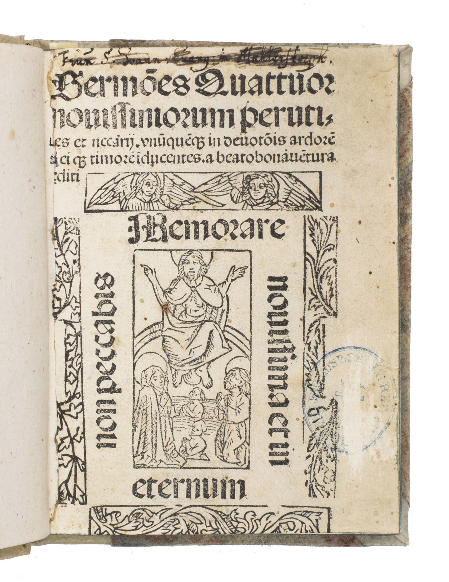 Interest in the four Last Things expanded greatly after Gerard van Vliederhoven (c.1340- 1402), a key figure in the Devotio Moderna movement in Utrecht, composed the Cordiale quattuor novissimorum (c. 1380). Dozens of editions of this text, in both Latin and the vernacular, were printed between 1471 and 1505. It is exactly during this time that Durand's treatise, now republished as Bonaventure's sermons, also became popular. The work was first published with the present title and arrangement in Paris in 1482, and many editions followed. The present work is the 7th edition overall, but the first printed in Germany. There is a nearly identical edition, also printed by Cornelius van Zierickzee in the same year. The only difference between the two is a printing mistake on the title page ("eidti" instead of "editi"). The present work does not contain the mistake and thus is likely the second issue.