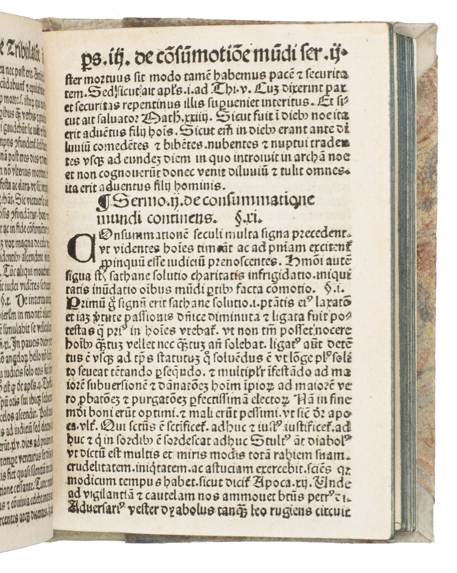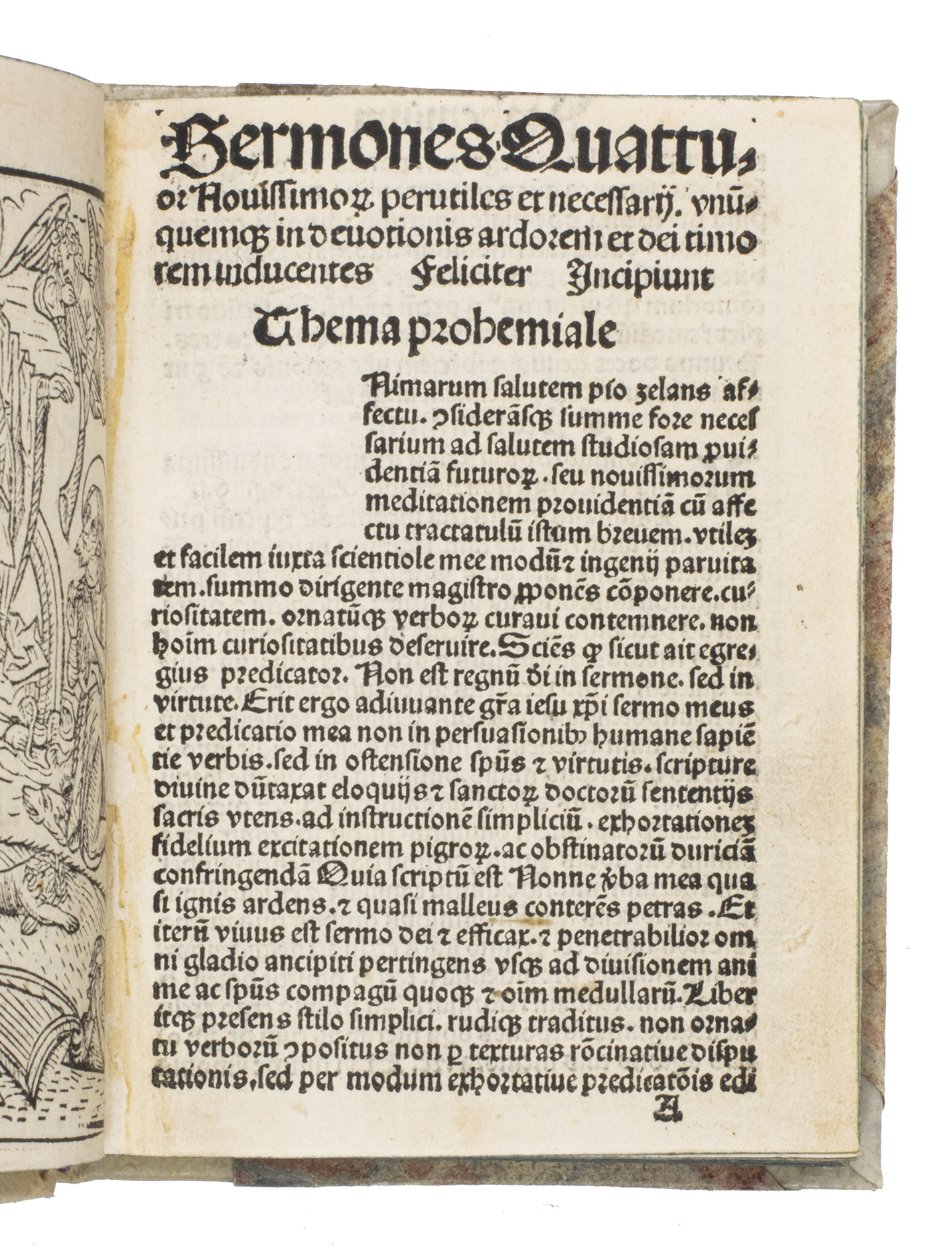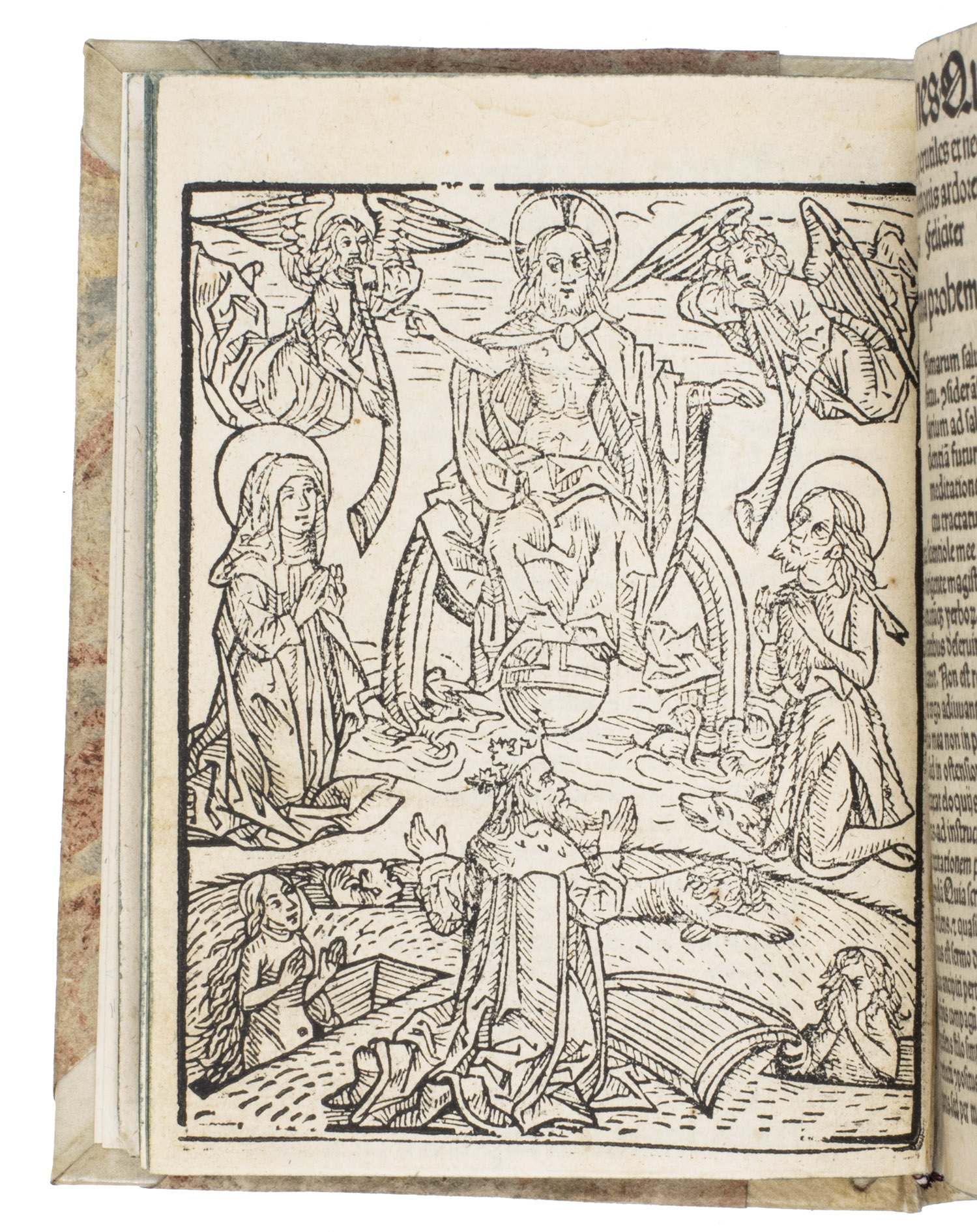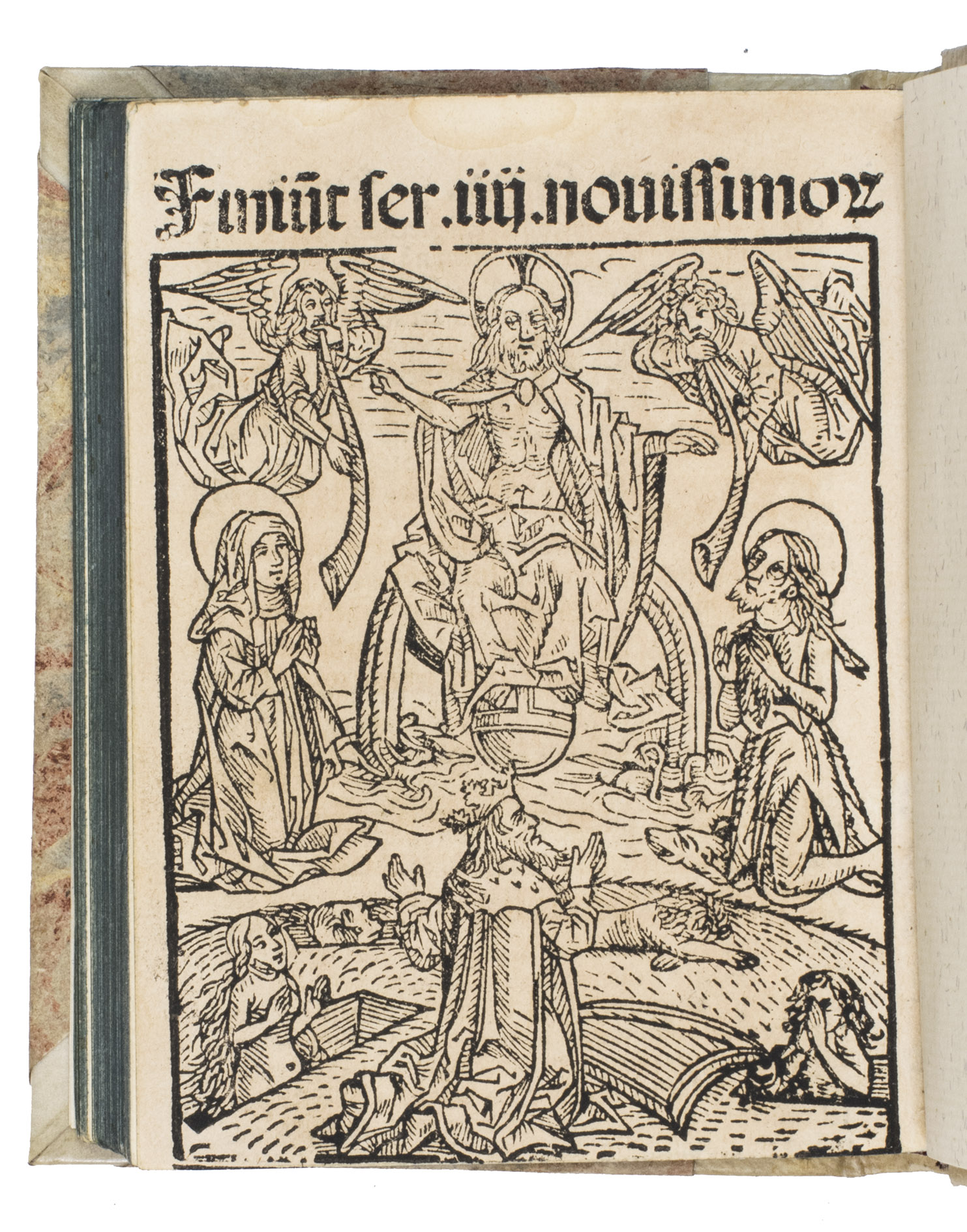 First German edition of an early post-incunable with beautiful woodcut illustrations. The work contains 37 sermons, which are divided in five series arranged by subject matter. The first part considers human actions, while the remaining ones centre around the four Last Things (novissima), namely death, judgement, heaven, and hell. The final section reworks ideas of Saint Anselm (1033-1109) about the salvation of the soul. The woodcut illustrations aptly show Christ at the Last Judgement. The work is quite rare, as we have not been able to find the present edition in any sales records of the past hundred years.