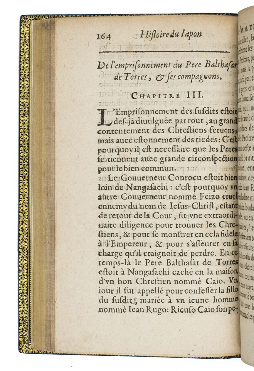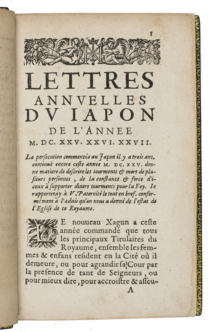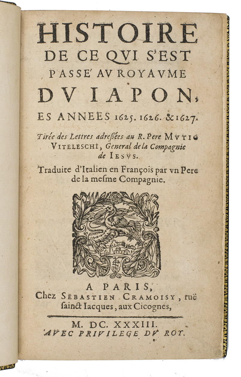 First and only edition of the enlarged French translation, by Jean Vireau (1558-1638), procureur in Paris, of the highly interesting letters on the situation in Japan, written by the Jesuit missionaries in Japan to the General of the Jesuit Order in Rome, Mutius Vitelleschi (1563-1645) during the years 1625-1627. The letters contain, next to ample first-hand information on the Jesuit missions in Japan and the treatment of the Jesuits by the Japanese authorities, the martyr's deaths of many of the fellow missionaries, and fascinating stories on the Japanese empire itself, its customs, usages, daily life, travel facilities, etc.