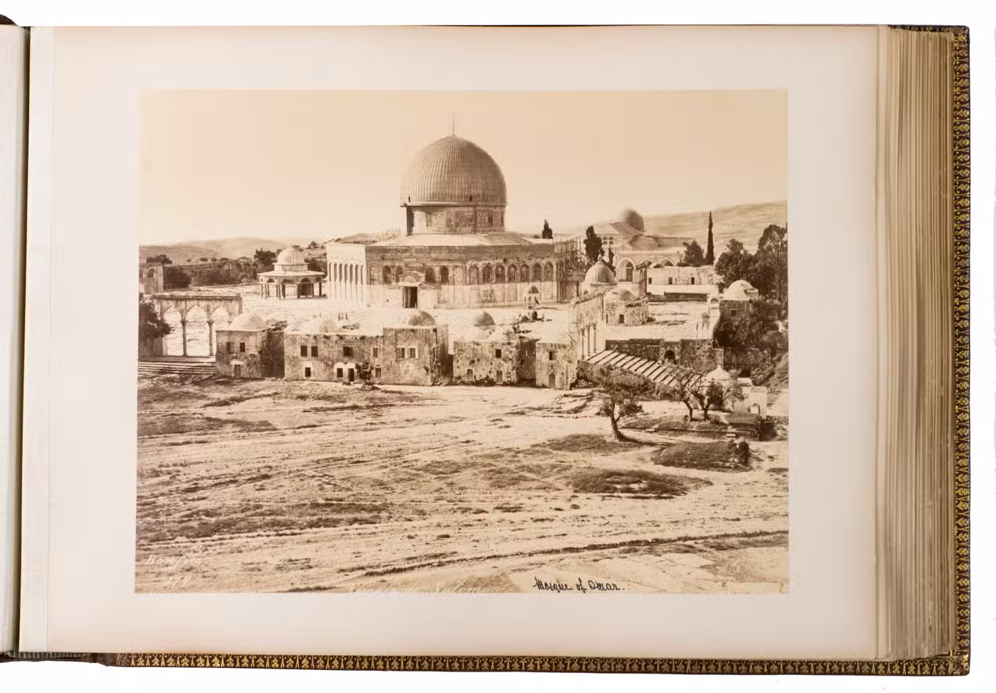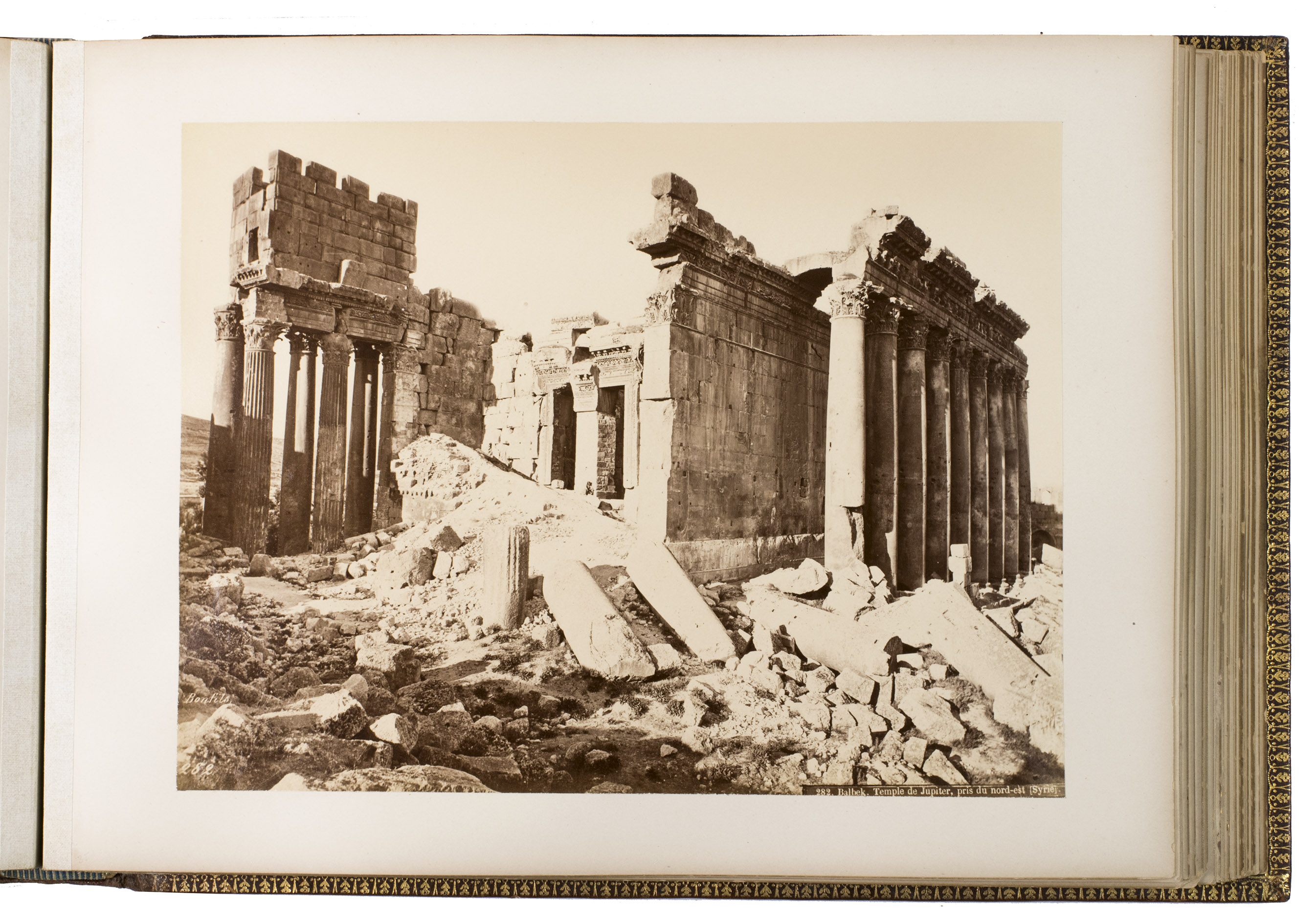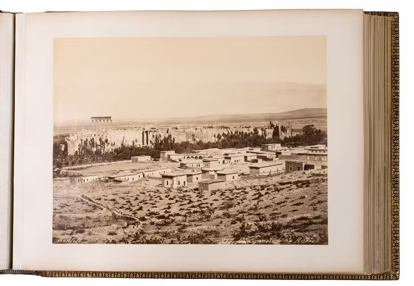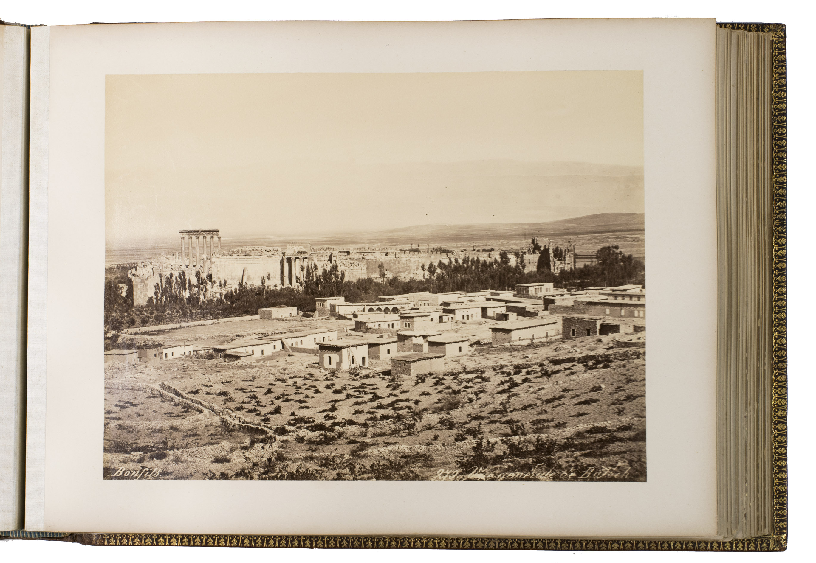 Beautiful and unusually large souvenir album with 75 photographs of Syria, Palestine, Constantinople and Athens, in a luxurious binding. The photographs were made by the renowned studios of Félix Bonfils (1831-1885) and Pascal Sébah (1823-1886), who were already widely celebrated in their own time for their pioneering work in Egypt, the Ottoman Empire, and the Middle East. Their images could be bought separately or as customised albums, but collections as large as the present one are uncommon, as few sets exceed fifty images.