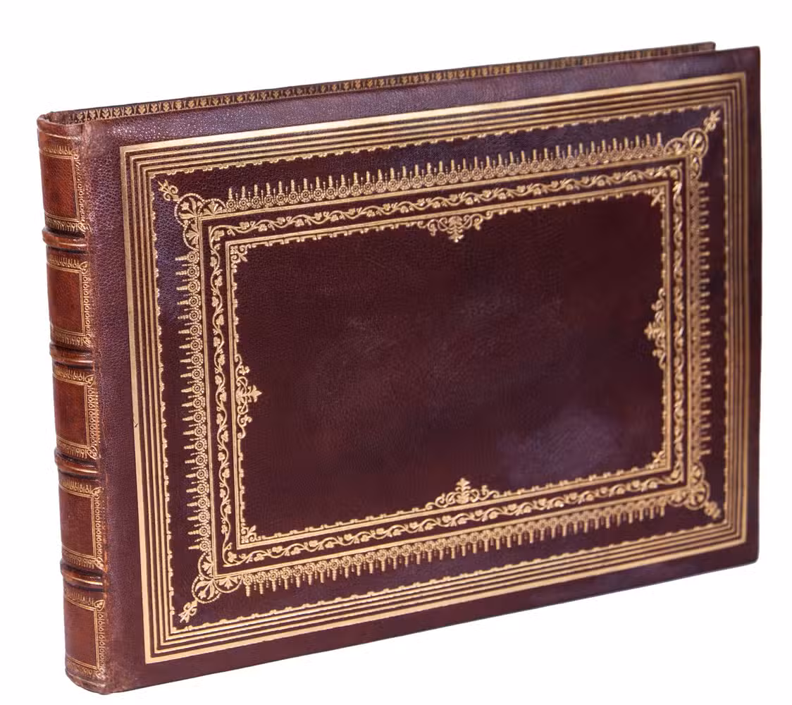 [Between 1867-1885]. Oblong folio (ca. 28 x 38 cm). With 75 albumen prints, most signed and numbered in the negative. Contemporary gold-tooled reddish-brown morocco over cushioned covers, gold-tooled turn-ins, watered-silk end papers, gilt edges. [39] ll.