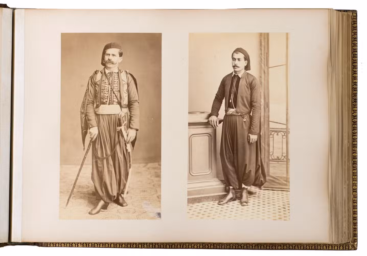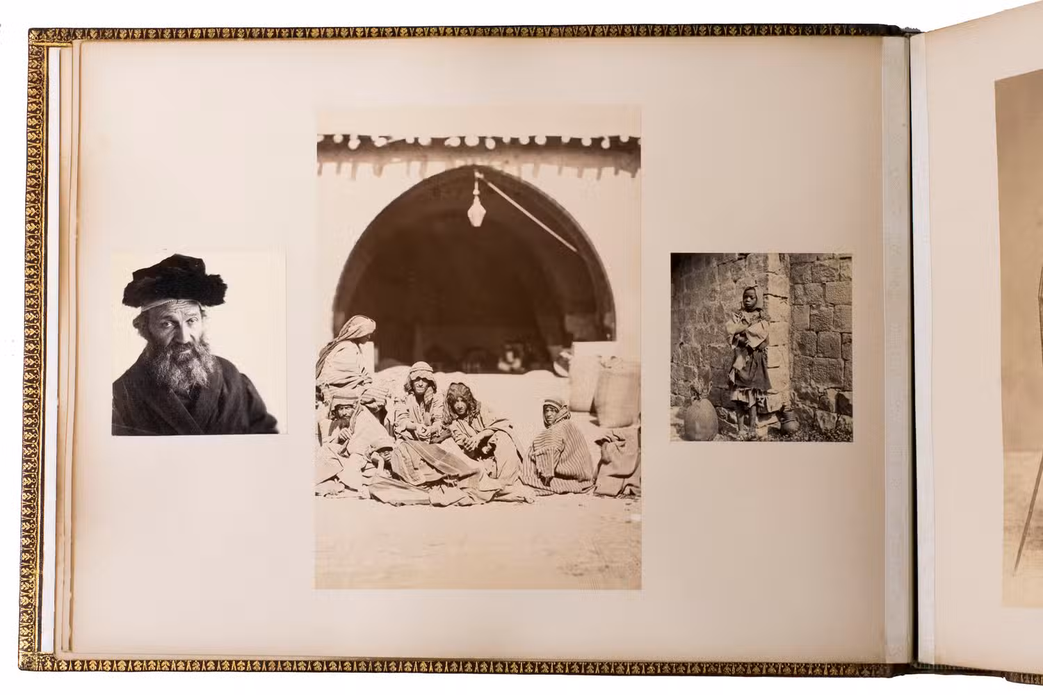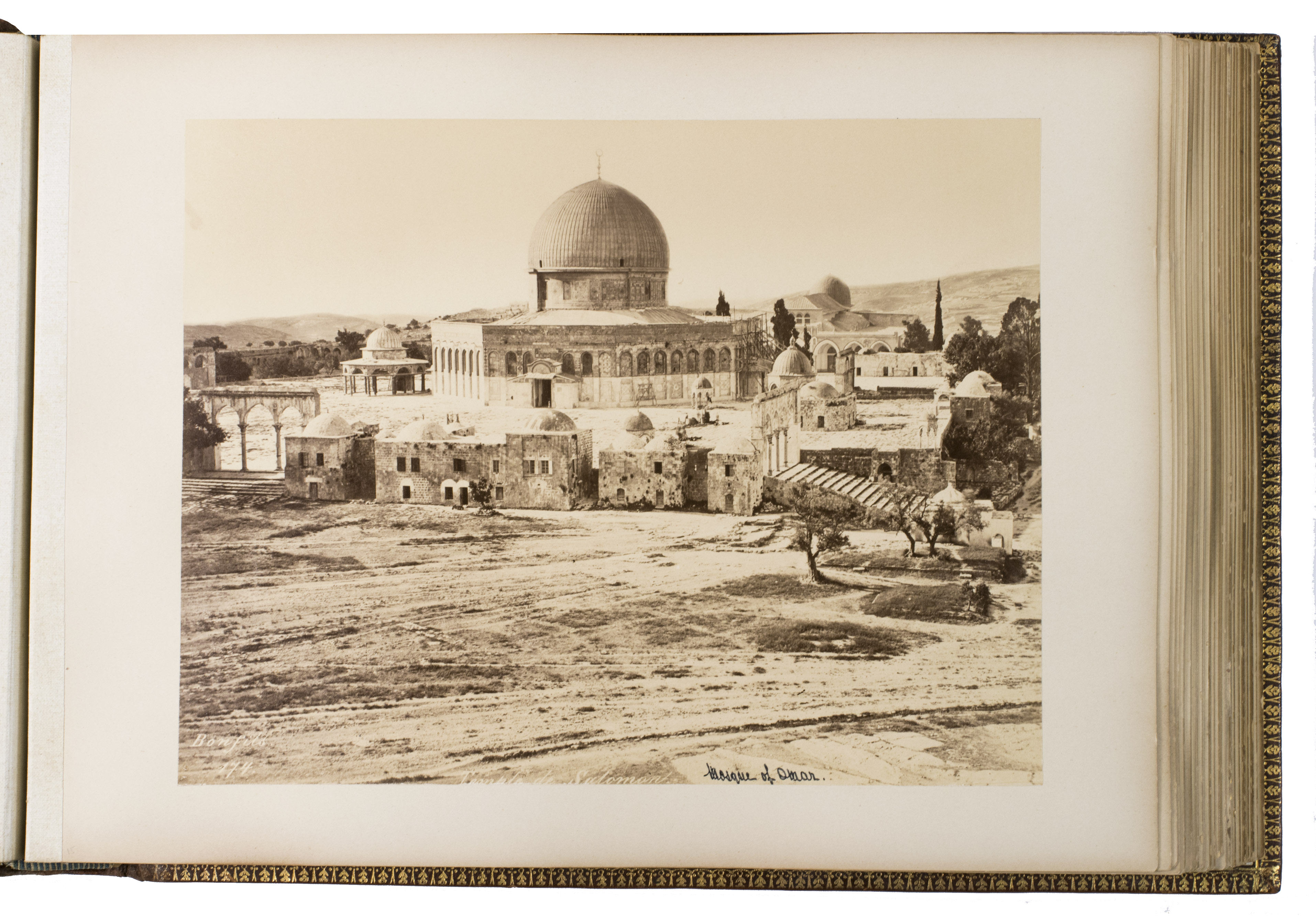 The majority of the photographs in the album are signed by Bonfils. He opened his first studio in Beirut in 1867 and produced thousands of photographs of the region. The present album contains one of the photographs he is most known for, namely the group of Jews in front of the Wailing Wall. Bonfils personally considered this haunting image to be one of his best works. Other photographs include views of Damascus, Beirut and Jerusalem, the church of the Holy Sepulchre, the Dome of the Ascension, Jericho, Jaffa, Ramallah, the Jordan river, the temple of Jupiter in Baalbek, and the Umayyad mosque. The remaining photographs in the album are either signed by Sébah or unsigned and include beautiful portraits of locals, views of Istanbul (the Blue Mosque, Hagia Sophia, Galata bridge and the Bosphorus river) and Athens (the Theseion, the temple of Olympian Zeus, the Parthenon, and the caryatids of Erechtheion).