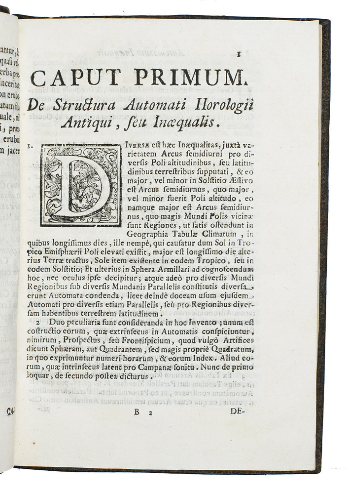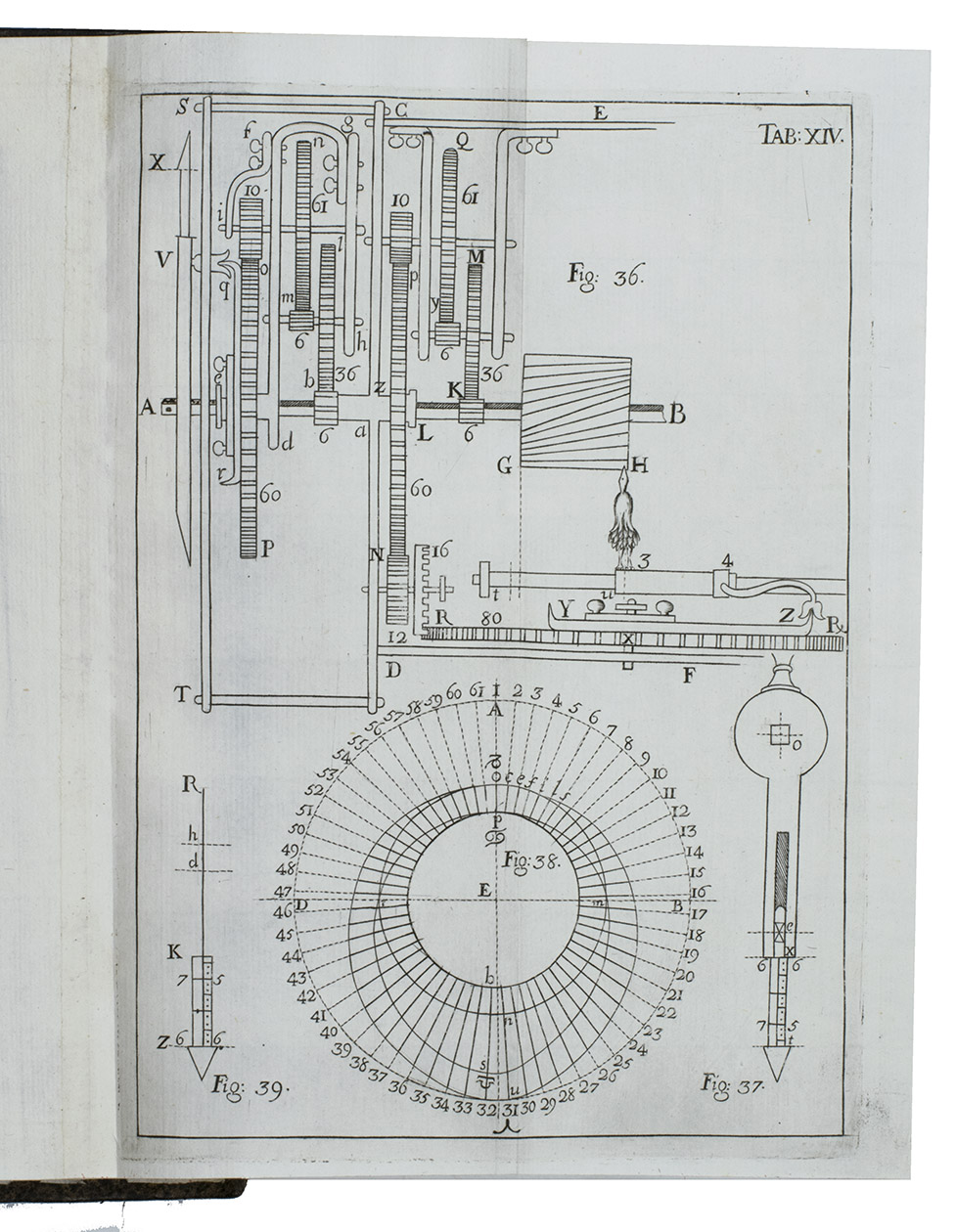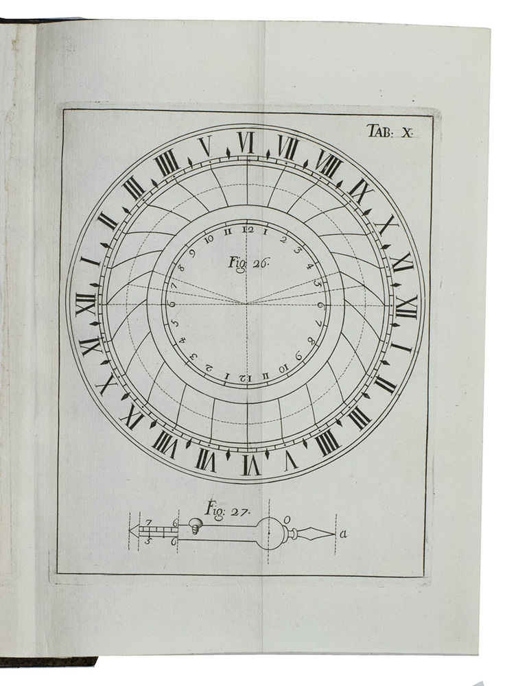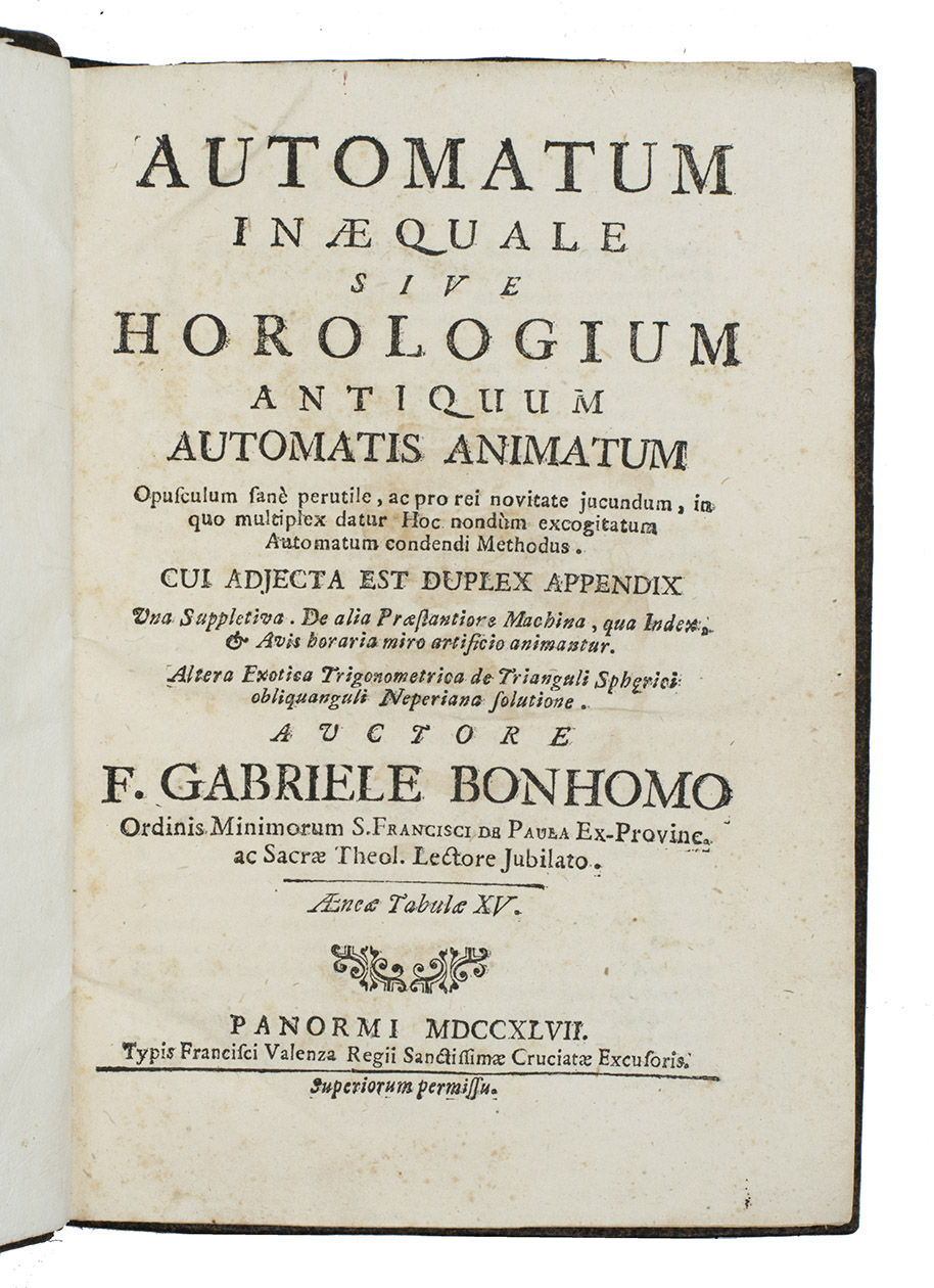 Palermo, Francisco Valenze, 1747. 4to. With numerous woodcut headpieces and tailpieces and decorated initials, some tables in the text and 15 numbered, folding engraved plates showing timepieces and clockwork mechanisms. Contemporary mottled calf, gold-tooled spine. [8], 122 pp.