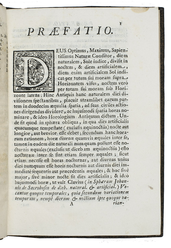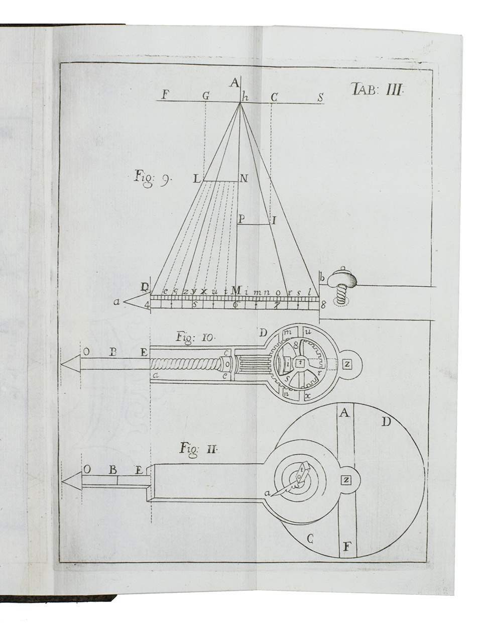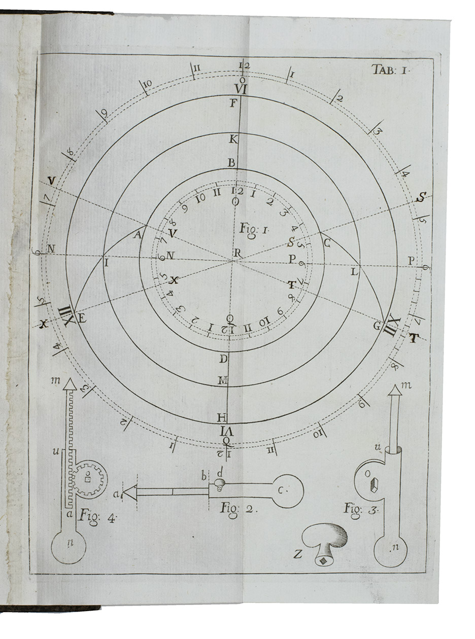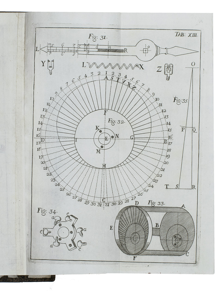 Palermo, Francisco Valenze, 1747. 4to. With numerous woodcut headpieces and tailpieces and decorated initials, some tables in the text and 15 numbered, folding engraved plates showing timepieces and clockwork mechanisms. Contemporary mottled calf, gold-tooled spine. [8], 122 pp.
