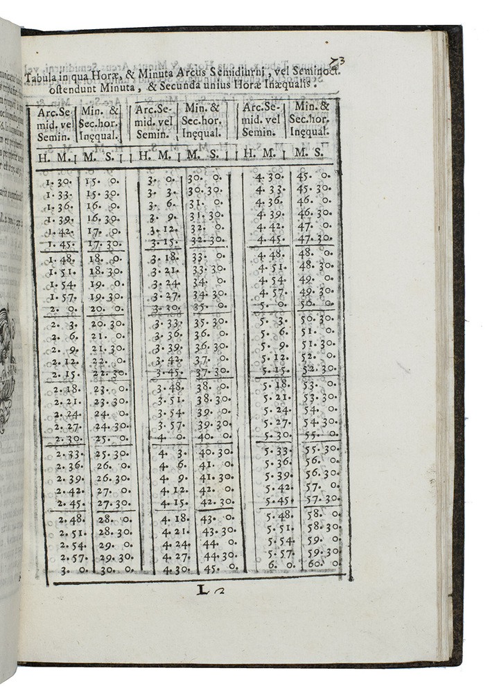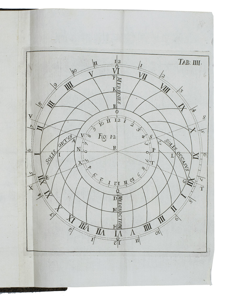 Important treatise on timepieces, describing a clockwork mechanism that indicates the solar hours of variable length. Riccardi calls Gabriele Bonhomo (1694-1760) one of the best mathematicians of the 18th century. In the present publication he includes an appendix with two interesting mathematical treatises and some astronomical tables. Bonhomo published all his works in Palermo, Sicilia.