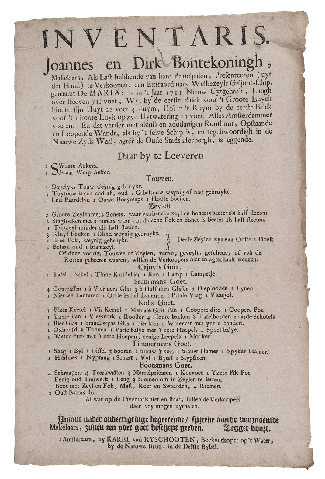 A rare and possibly unique poster with a detailed inventory of equipment, advertising a sale to be held in Amsterdam (ca. 1750) of the galleon (galjoot) De Maria and equipment such as the anchors, the complete ship's gear, galley contents and sea chests.